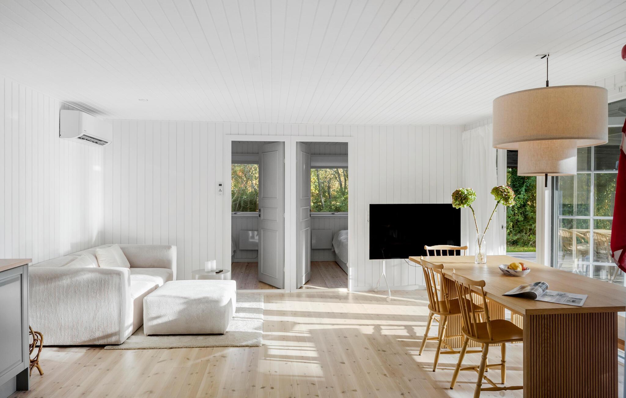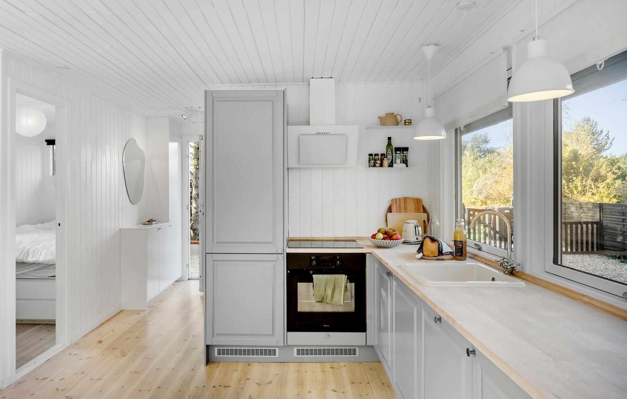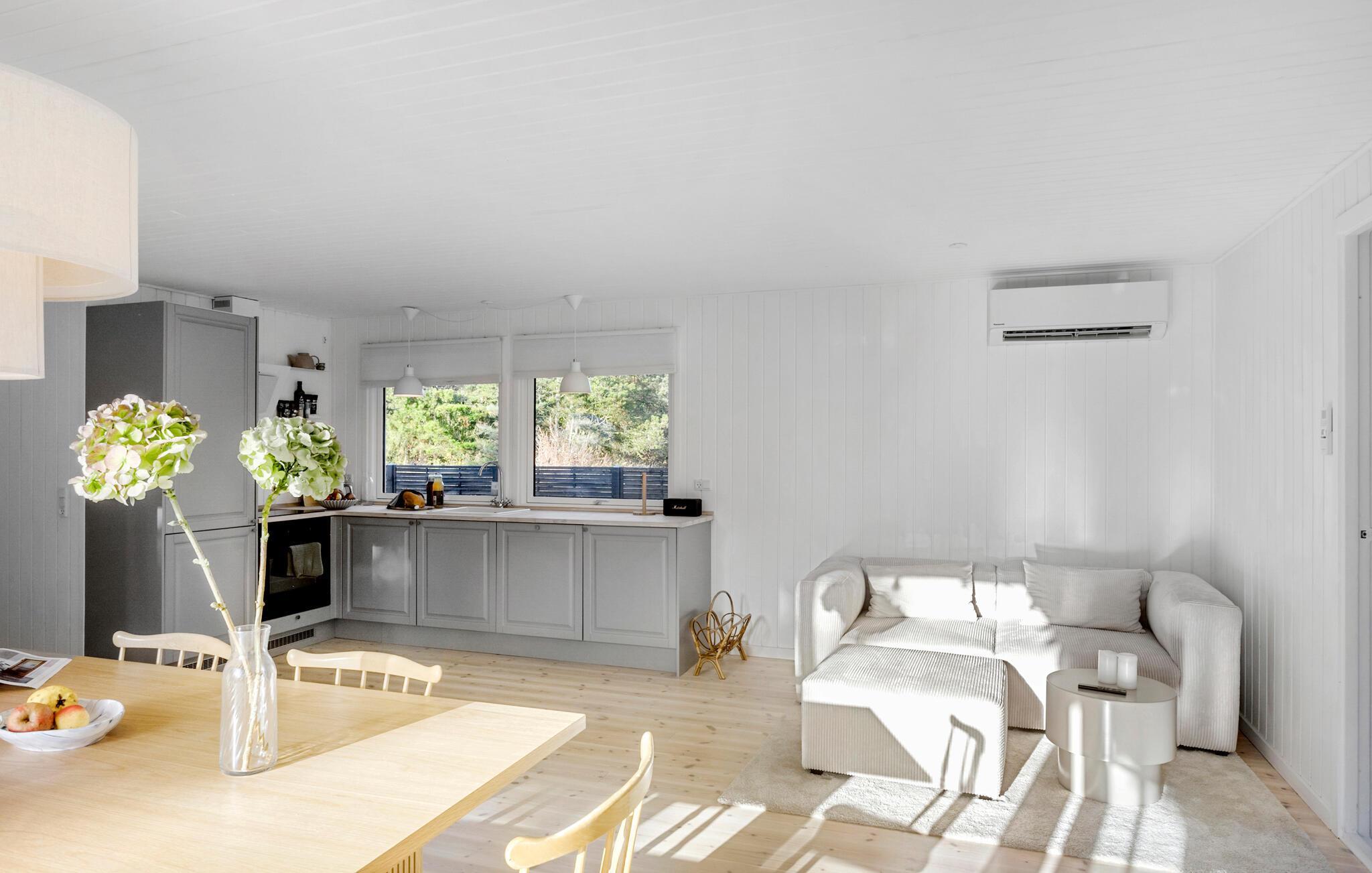 Ihr Ferienhaus bietet Ihnen alles, was Sie für einen komfortablen Aufenthalt benötigen. Der offene Wohnbereich mit seiner eleganten Ausstattung sorgt für eine behagliche Atmosphäre. Machen Sie es sich in der einladenden Sitzecke gemütlich und schauen Sie einen spannenden Film. Die großen Fenster lassen viel Tageslicht hinein und verleihen dem Raum eine freundliche und offene Ausstrahlung. Die offene Küche ist gut ausgestattet und lädt zum gemeinsamen Kochen ein.
