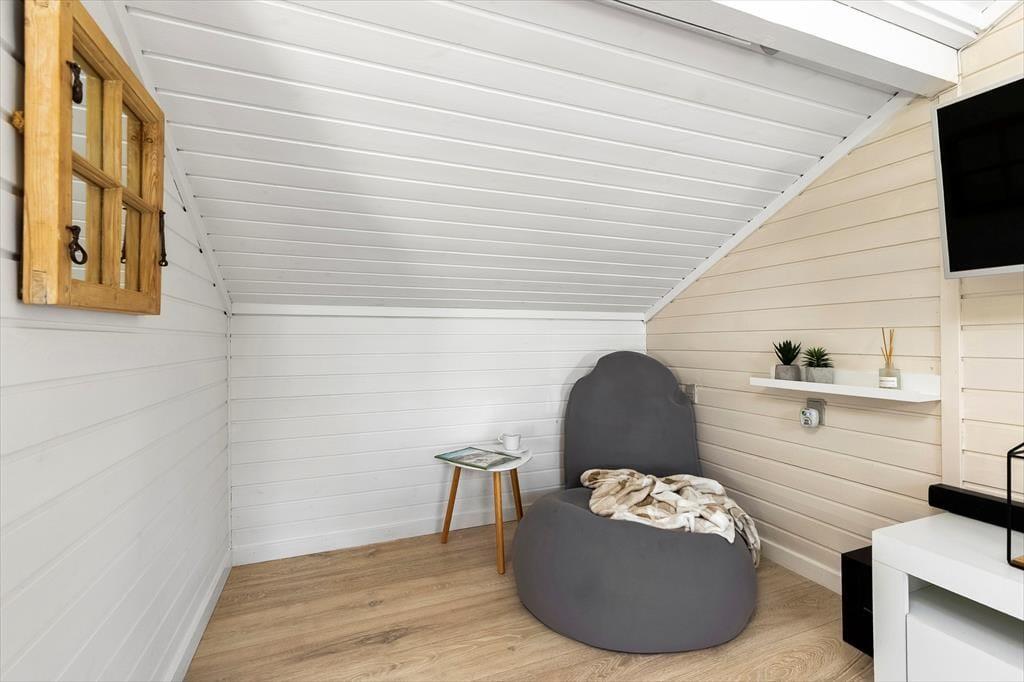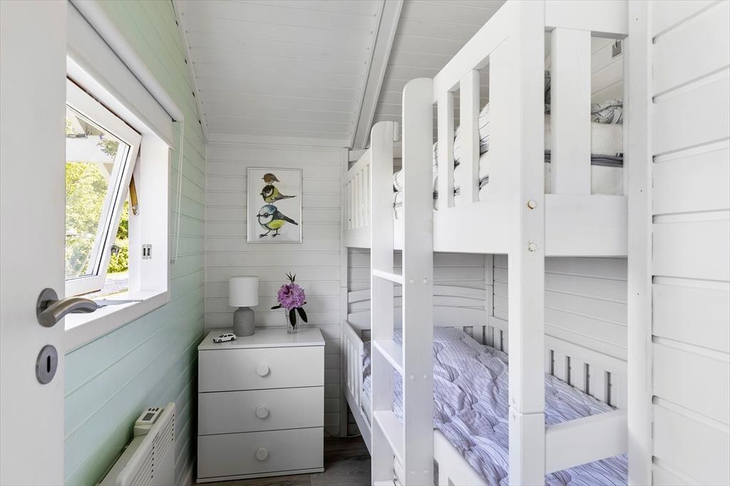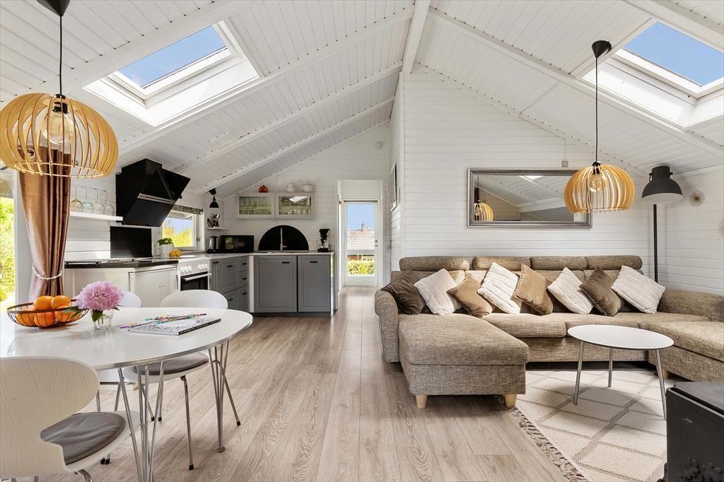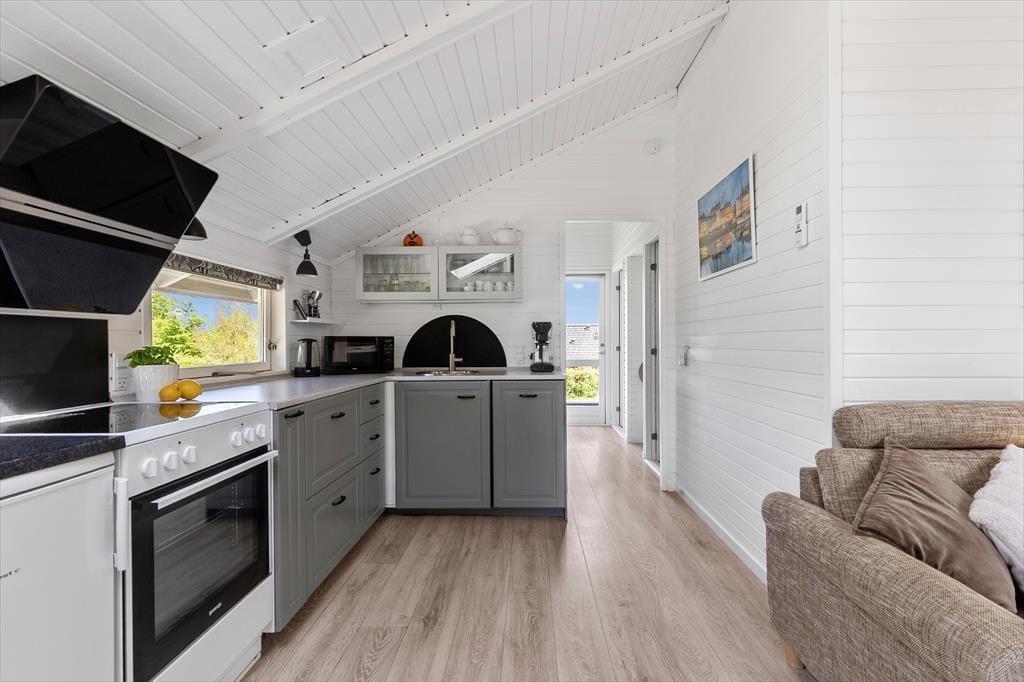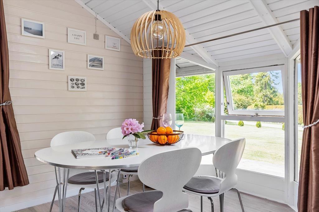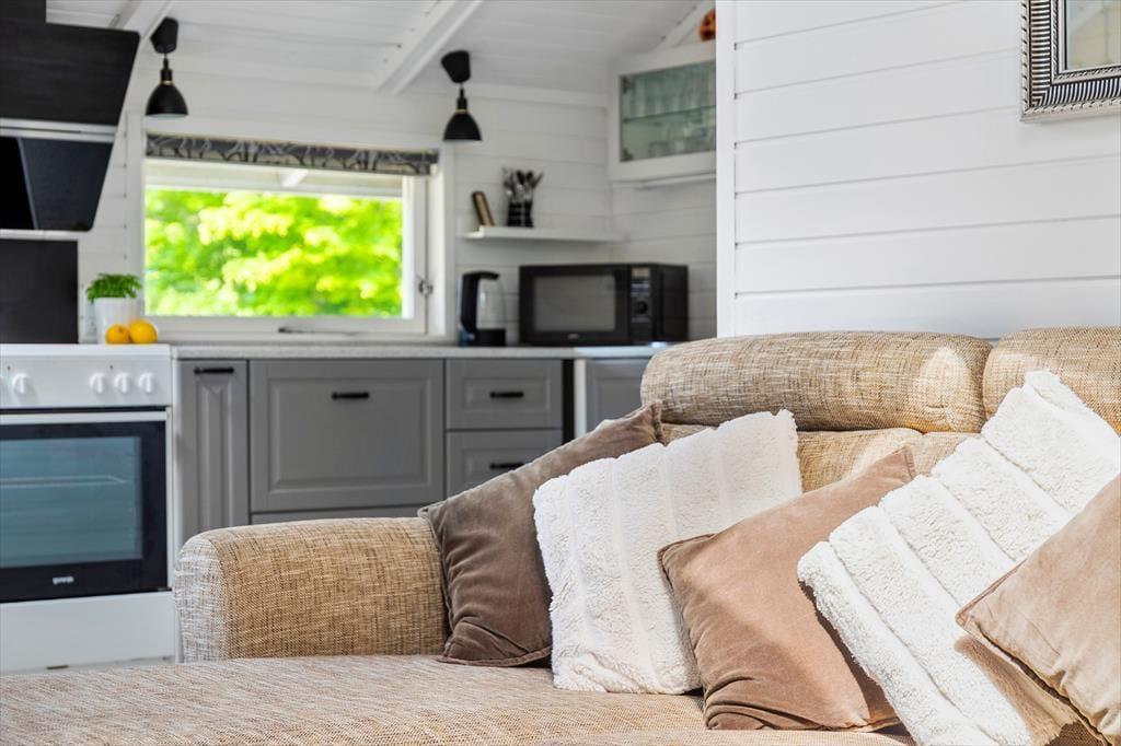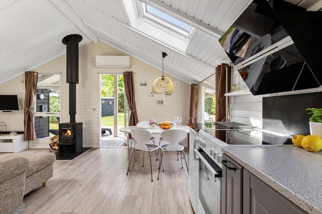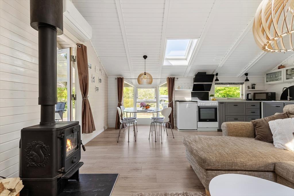 Sobald du das Haus betrittst, empfängt dich eine helle und gemütliche Atmosphäre, die ganz auf Komfort und Erholung ausgelegt ist. Das Wohnzimmer ist warm und einladend und bietet direkten Zugang zur Terrasse, wo du deinen Morgenkaffee genießen kannst, während Rehe durch den Garten streifen. Die offene Küche ist harmonisch mit dem Essbereich und dem Wohnzimmer verbunden, sodass du immer in Gesellschaft bist – egal ob du kochst oder dich auf dem Sofa entspannst. Der Essbereich befindet sich in einer gemütlichen Nische mit großen Fenstern, die viel Tageslicht hereinlassen und eine wunderbare Aussicht auf den Garten bieten. Wenn die Nacht hereinbricht, kannst du dich in das komfortable Schlafzimmer mit Doppelbett zurückziehen, während die Kinder im gemütlichen Zimmer mit Etagenbett gut aufgehoben sind.