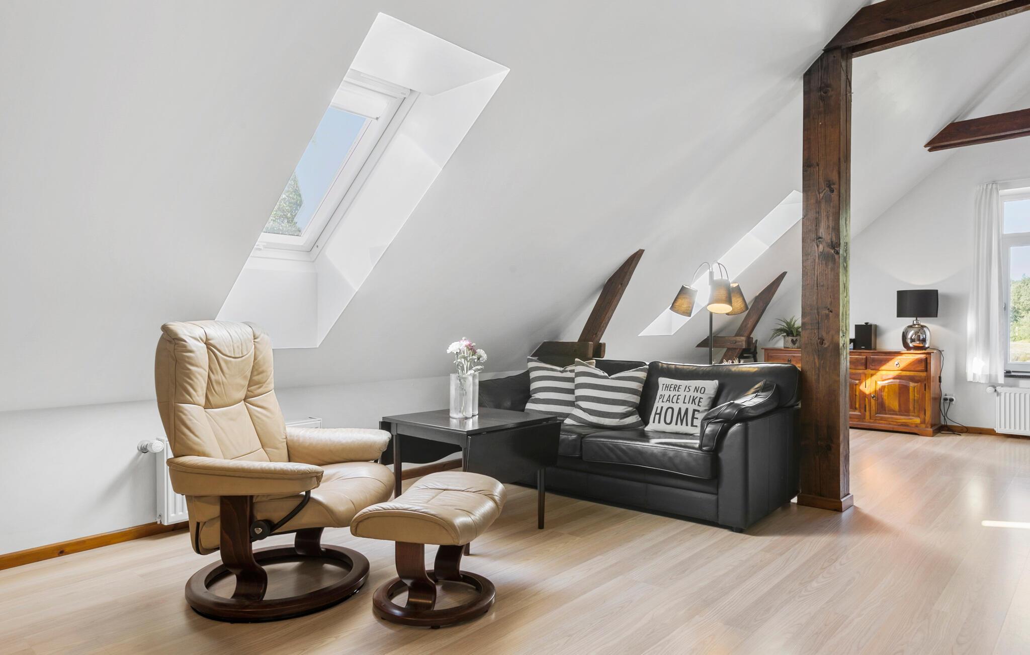 Der großzügige Wohnbereich mit seinen hohen Decken und rustikalen Holzbalken strahlt eine warme Atmosphäre aus. Machen Sie es sich auf den bequemen Sofas gemütlich und genießen Sie die Aussicht durch die großen Fenster oder lassen Sie sich von einem guten Buch in den gemütlichen Sesseln inspirieren. Die gut ausgestattete Küche lädt zum gemeinsamen Kochen ein. Genießen Sie die Mahlzeiten am urigen Holzesstisch mit Blick auf die ländliche Umgebung.