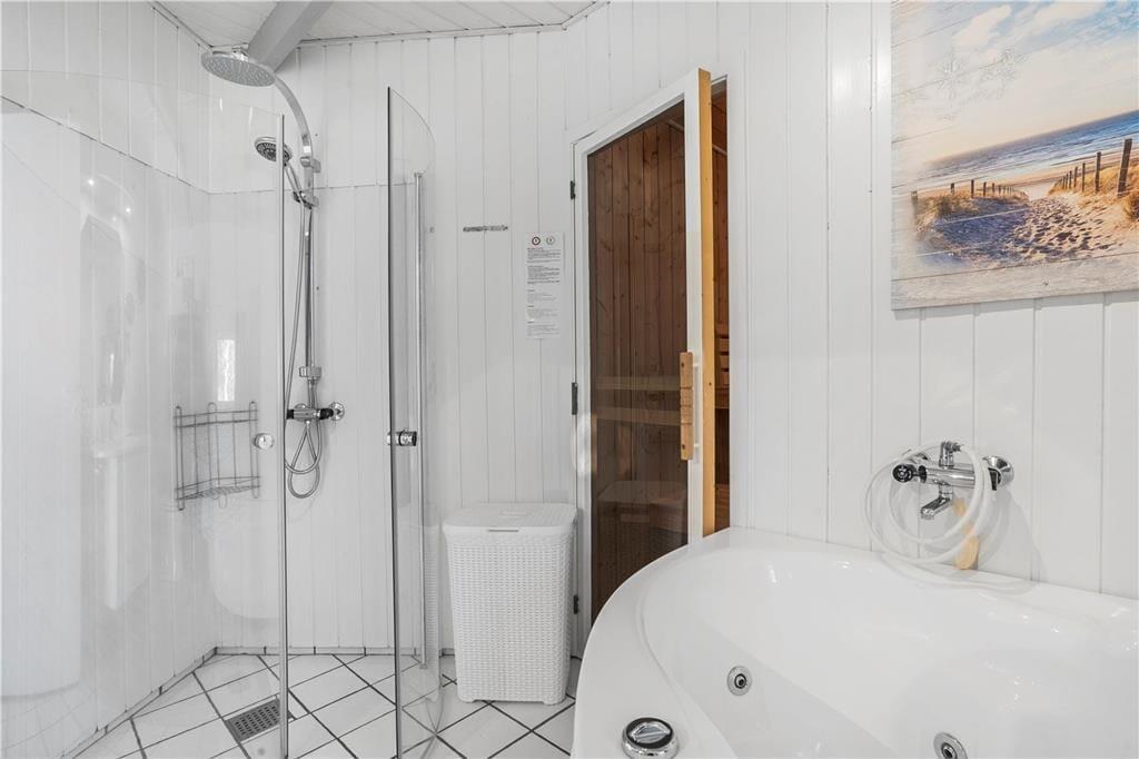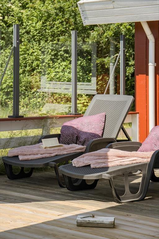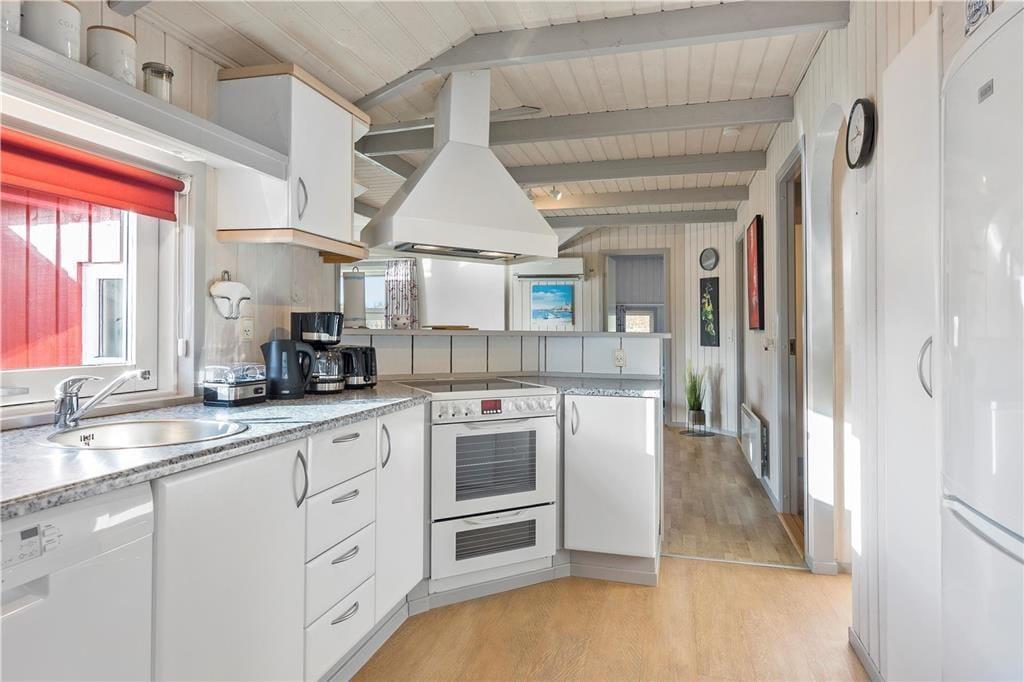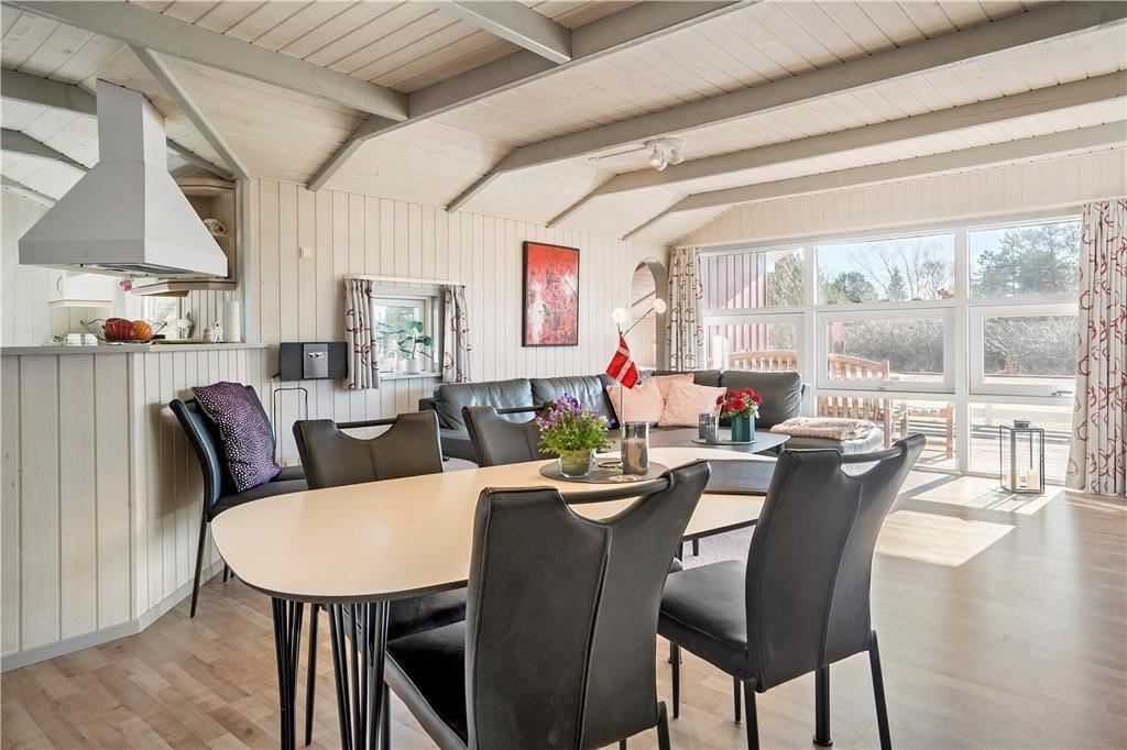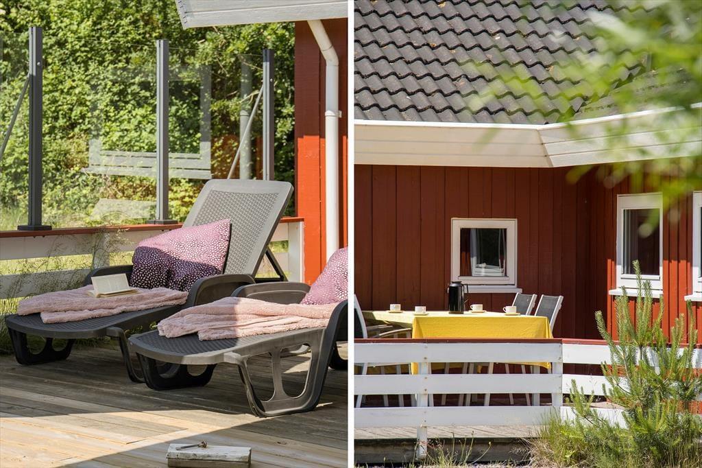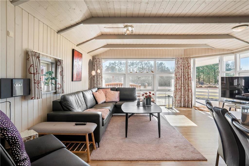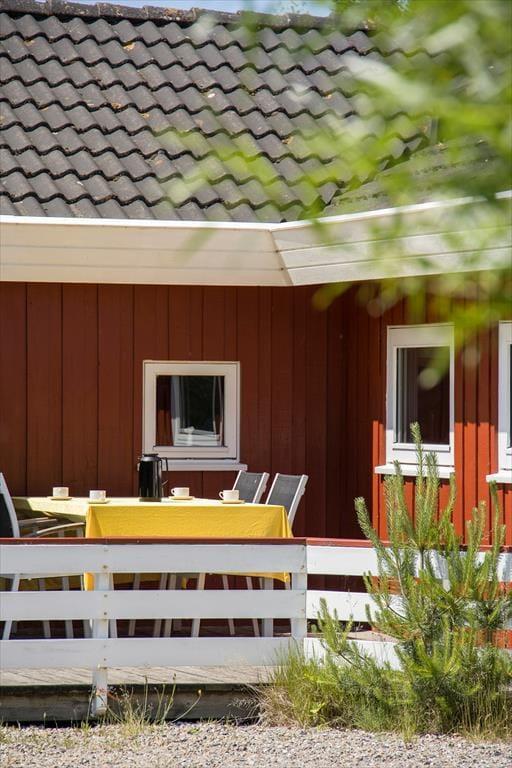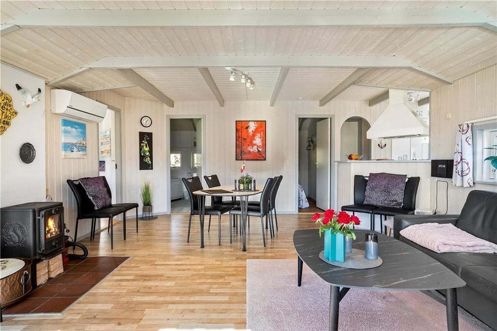 Schon bei Ihrer Ankunft spüren Sie die schöne Ferienhausatmosphäre, denn das Domizil präsentiert sich edel und klassisch mit einer rot gestrichenen Holzfassade, weißen Fensterrahmen und einem Lattenzaun. Im Inneren des Hauses setzt sich der gleiche einladende Stil fort, denn hier gibt es helle Holzleisten an den Wänden, einen Brennofen und schöne Möbel, die gut zu den gemütlichen Räumen passen, nämlich drei Schlafzimmer, zwei Badezimmer, ein Hauswirtschaftsraum und ein Aufenthaltsbereich mit Alkoven und integrierter Küche. Nicht zuletzt im Wohnbereich bewirken die großen Fensterflächen einen guten Lichteinfall und sorgen dafür, dass Sie die grüne Umgebung auch dann genießen können, wenn Sie sich drinnen in der kuscheligen Wärme aufhalten. Apropos Wärme: Neben dem Brennofen gibt es auch eine Wärmepumpe, die Sie an kühlen Tagen nutzen können. Wenn Sie wirklich entspannen möchten, können Sie das Badezimmer mit Whirlpool und Sauna für einen Wellness-Abend vorbereiten.