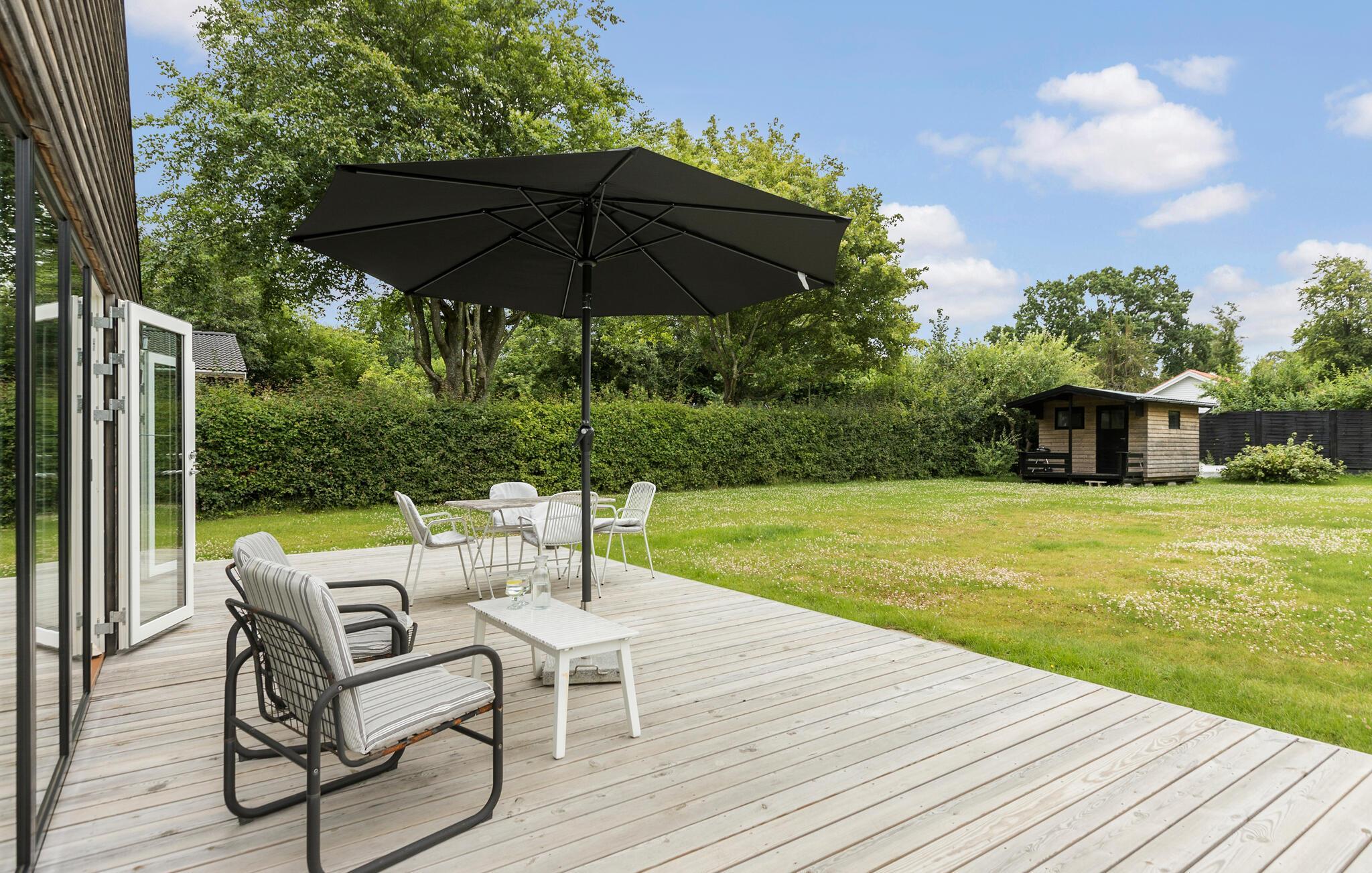 Modernes Holzferienhaus mit großer Terrasse und familienfreundlichem Garten in Kulhuse, Dänemark.
