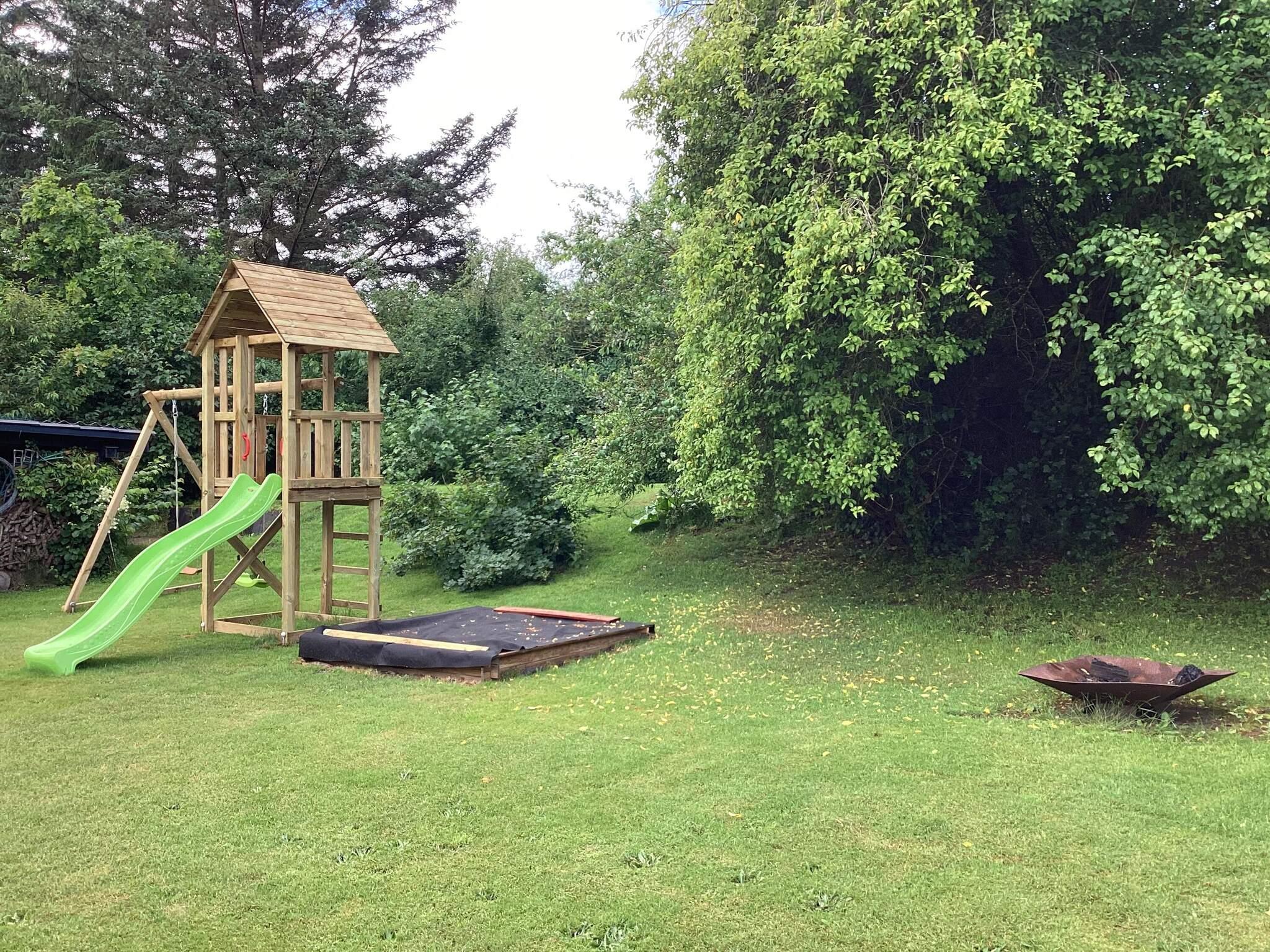 Im Außenbereich lädt eine große überdachte Terrasse zum Essen oder Entspannen mit Blick auf den Garten ein. Im Garten befindet sich ein Spielgerät mit zwei Schaukeln, einer Rutsche und einem Sandkasten – ideal für Kinder, die im Freien Spaß haben möchten. Eine Feuerstelle lädt zu gemütlichen Abenden am Lagerfeuer ein.