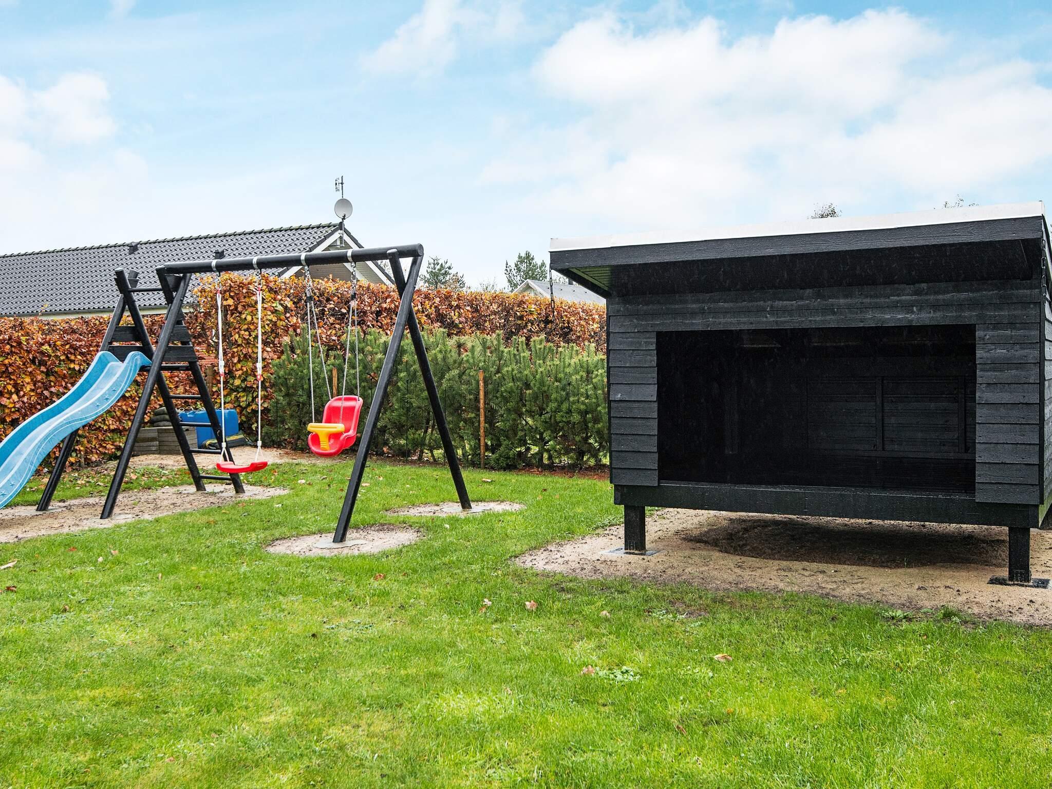 Vom Wohnzimmer aus gelangt man auf eine große, umschlossene Terrasse, die teilweise überdacht ist, sodass man auch mal etwas länger draußen sitzen kann. Im Garten gibt es reichlich Gelegenheit zur Entfaltung in Form von Spielen, einem Trampolin (Nutzung nur auf eigenes Risiko), einer Schaukel mit Rutsche und einem Sandkasten. Für eine Übernachtung im Freien steht ein Shelter bereit.