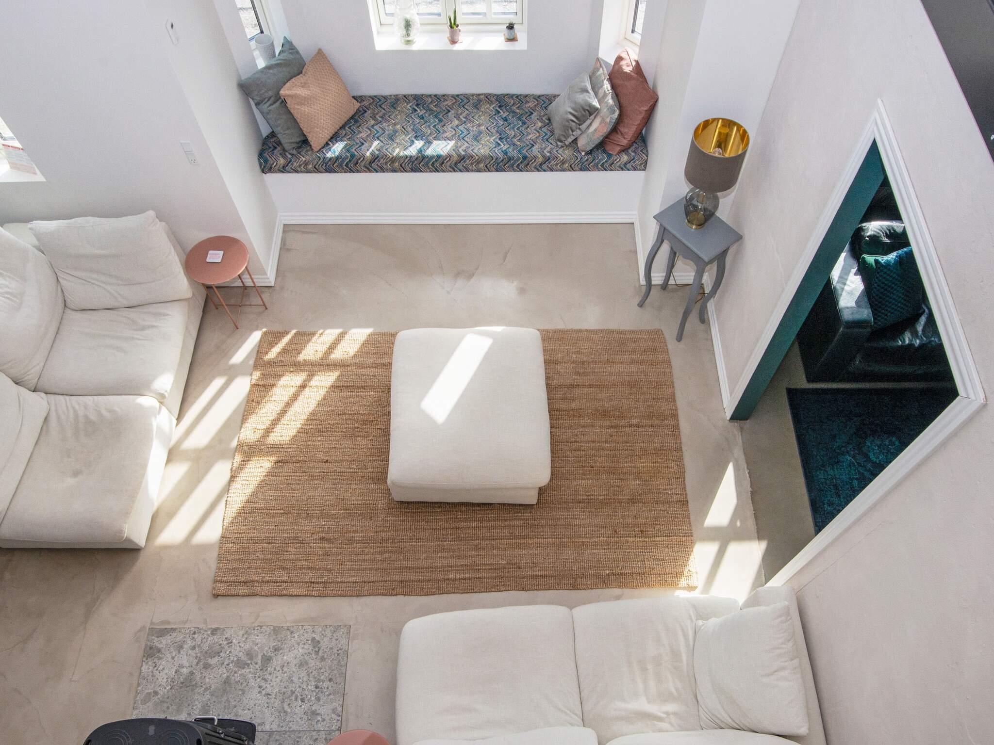 Das Haus erstreckt sich über zwei Ebenen, jeweils mit einem Badezimmer mit Dusche. Im Erdgeschoss befinden sich drei Schlafzimmer, ein Badezimmer und ein heller, offener Küchen- und Wohnbereich, der ideal für das Familienleben ist. Der Wohnbereich bietet eine gemütliche Sitzecke zum Entspannen und Unterhalten. Im Obergeschoss befinden sich ein Doppelschlafsofa, ein zusätzliches Badezimmer und ein Schlafzimmer mit Doppelbett – flexible Schlafmöglichkeiten für größere Gruppen.