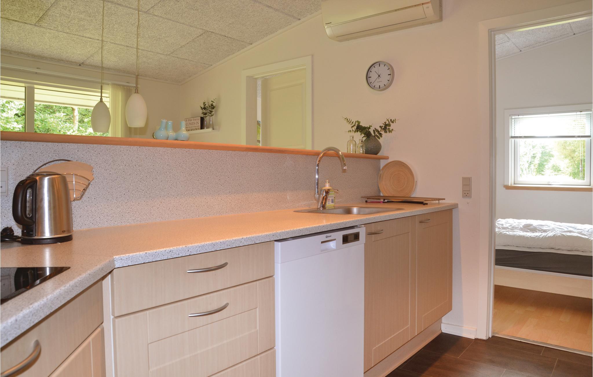Das gepflegte Ferienhaus liegt auf einem sichtgeschützten Grundstück mitten in einer alten Freizeithaussiedlung Kvies. Die Einrichtung ist persönlich und behaglich. Direkt an das große Badezimmer mit Massagewanne schließt sich die Sauna an. Die Wohnküche hat eine gute Einrichtung und hier ist auch ein Kaminofen. Direkt davor zu erreichen ist eine Terrasse unter Dach. Über Fußwege kommen Sie zum See, wo Sie gut schwimmen und vor allen die kleinen Kinder gute Gelegenheiten zum Planschen finden werden. Das Wasser ist nicht sehr tief. Am See liegt auch das sehr beliebte Pfannkuchenhaus (Pandekagehuset) mit einer reichen Auswahl an süßen Leckereien, besonder Holländischen Pfannkuchen. Für Ausflüge möchten wir Legoland und den Givskud Zoo empfehlen, sie liegen nur eine halbe Stunde entfernt. Nahe bei Varde liegt auch der Park Tambours Have mit besonderen Pflanzen, Bächlein, Holzfiguren und schönem Ambiente.