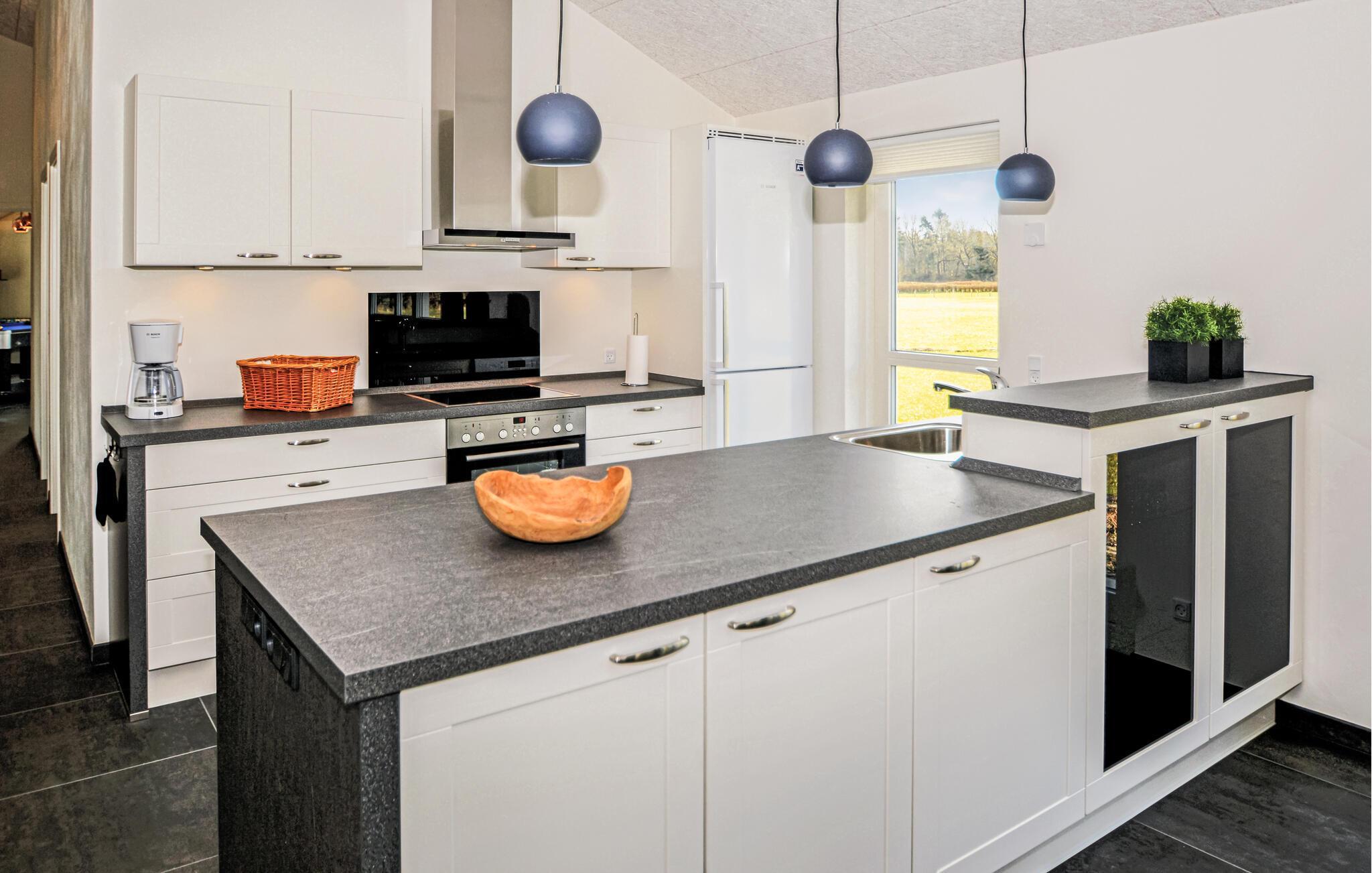 Schönes Ferienhaus in herrlicher Lage. Sie wohnen mit einer schönen Aussicht auf den See Kvie Sø vom Wohnzimmer. Ein schönes Haus, wenn Sie einfach entspannen wollen. Auch wenn Sie als Familie gerne aktiv sind. Im Spielzimmer sind Pooltisch, Tischtennis und Tischfußball vorhanden. Auf eigene Verantwortung können Sie das aufgestellte Trampolin im Garten benutzen. In der Wohnküche sind Sie gut aufgehoben und alles ist vorhanden um schön kochen zu können. Ein Kaminofen und eine Wärmepumpe sorgen zudem ebenso für Behaglichkeit. Das Haus liegt auf einem sehr großen und teilweise sichtgeschützten Grundstück, nur 100 m ist der See entfernt. Dies sorgt für einzigartige Möglichkeiten die Flora und Fauna hier zu erleben. Kvie Sø ist darüber hinaus auch für sein Restaurant Pandekagehuset bekannt. In mehreren See der Umgebung können Sie hier angeln. Das Legoland, Legohouse und Lalandia sind ebenso sehenswert.