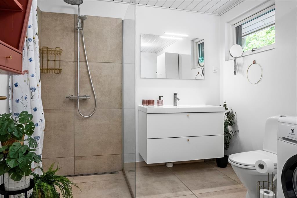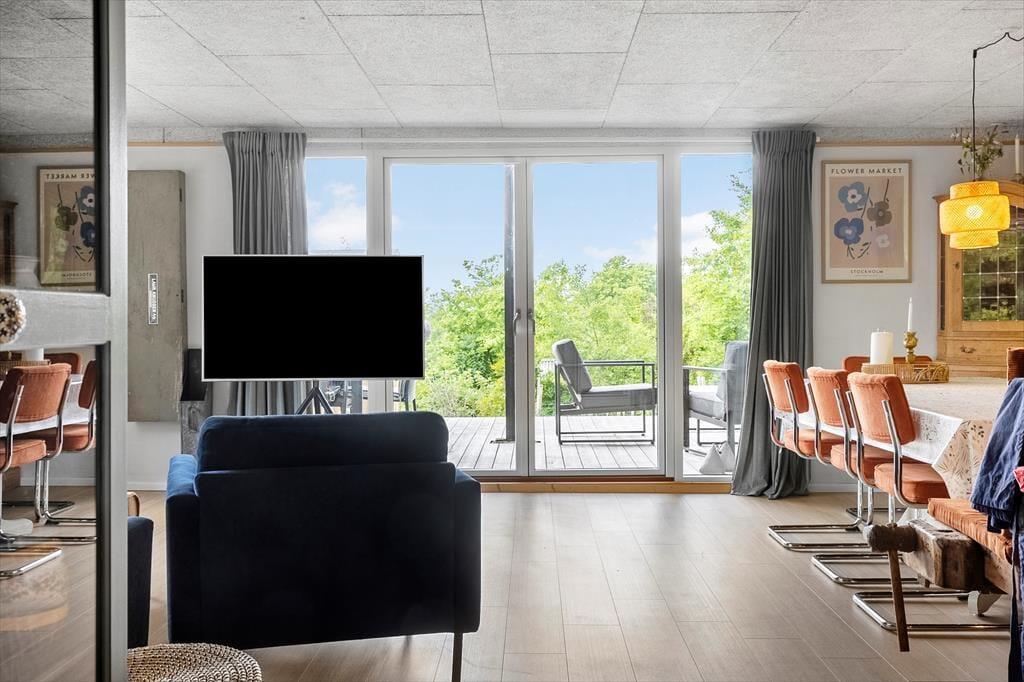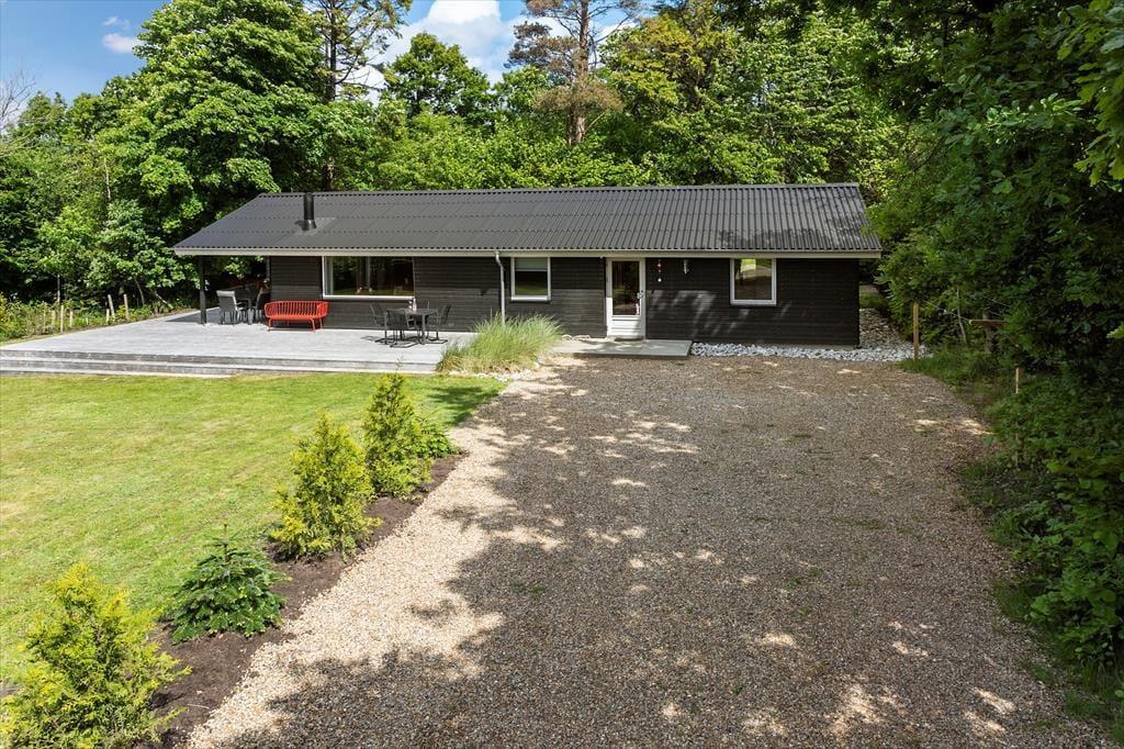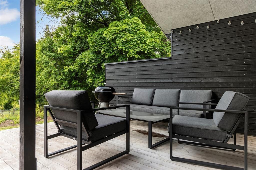 Wenn die Sonne hervorblitzt und die Luft nach Fjord und Sommer duftet, ist es Zeit, nach draußen zu gehen. Die große Terrasse wird schnell zum Lieblingsort, an dem das Ferienleben in vollen Zügen genossen werden kann – ganz gleich, ob beim Grillabend unter freiem Himmel, beim Vormittagskaffee in der Sonne oder bei einer ruhigen Auszeit mit Decke und Buch im Liegestuhl. Die Terrasse bietet euch viel Platz und die Möglichkeit, gemeinsam Zeit zu verbringen – und dabei den Ausblick auf die friedliche Natur rund ums Haus zu genießen. Lauscht dem Zwitschern der Vögel, lasst die Kinder auf dem Rasen spielen oder nehmt das Handtuch über die Schulter und spaziert zum Strand, der nur einen kurzen Fußweg entfernt liegt.