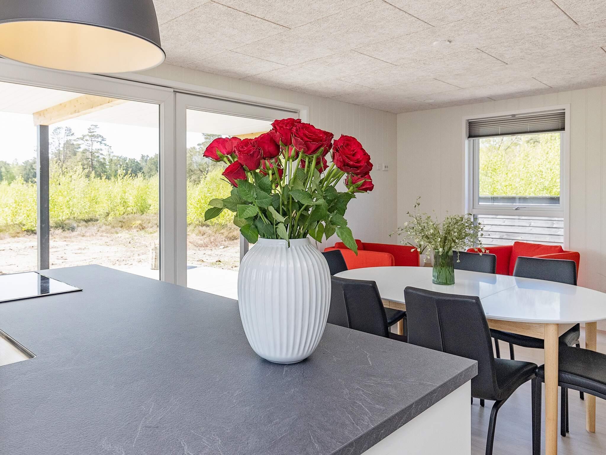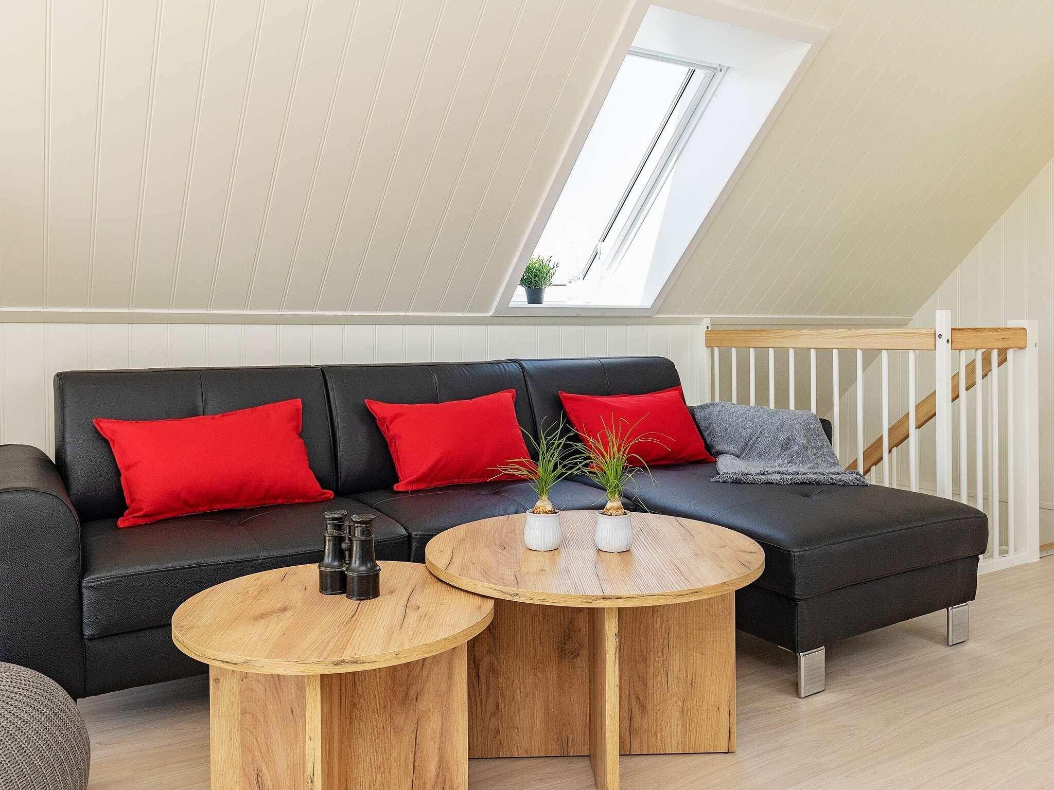 Eine klimafreundliche Luft-Wasser-Wärmepumpe sorgt für Energieeffizienz und ein ganzjährig angenehmes Raumklima. Große Fenster sorgen für viel Tageslicht und bieten Ausblicke auf die umliegende Ferienhaussiedlung, was die einladende Atmosphäre des Hauses unterstreicht.