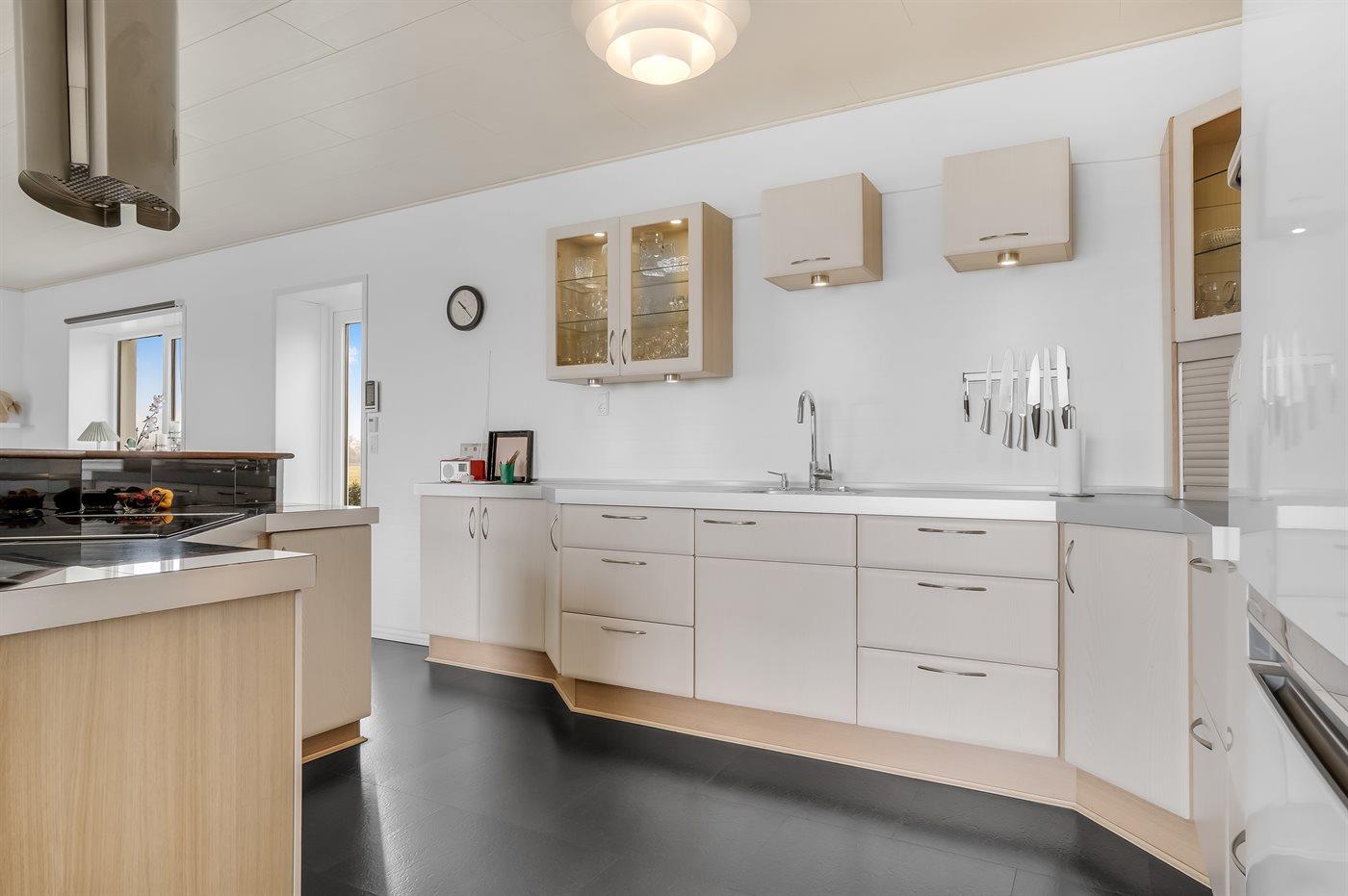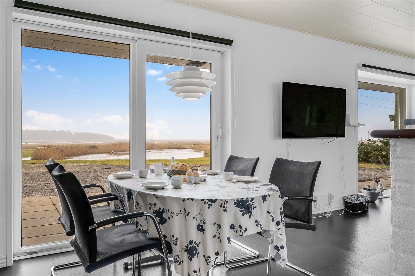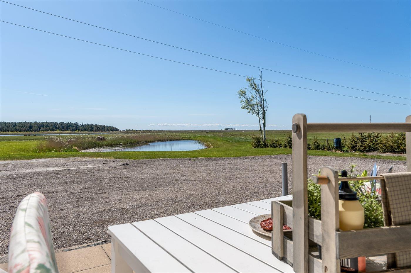 Große, teilweise überdachte, südlich ausgerichtete Terrasse, auf der du die fantastische Aussicht über Rønnerne in Richtung der berühmten Salzsiederei von Læsø genießen kannst