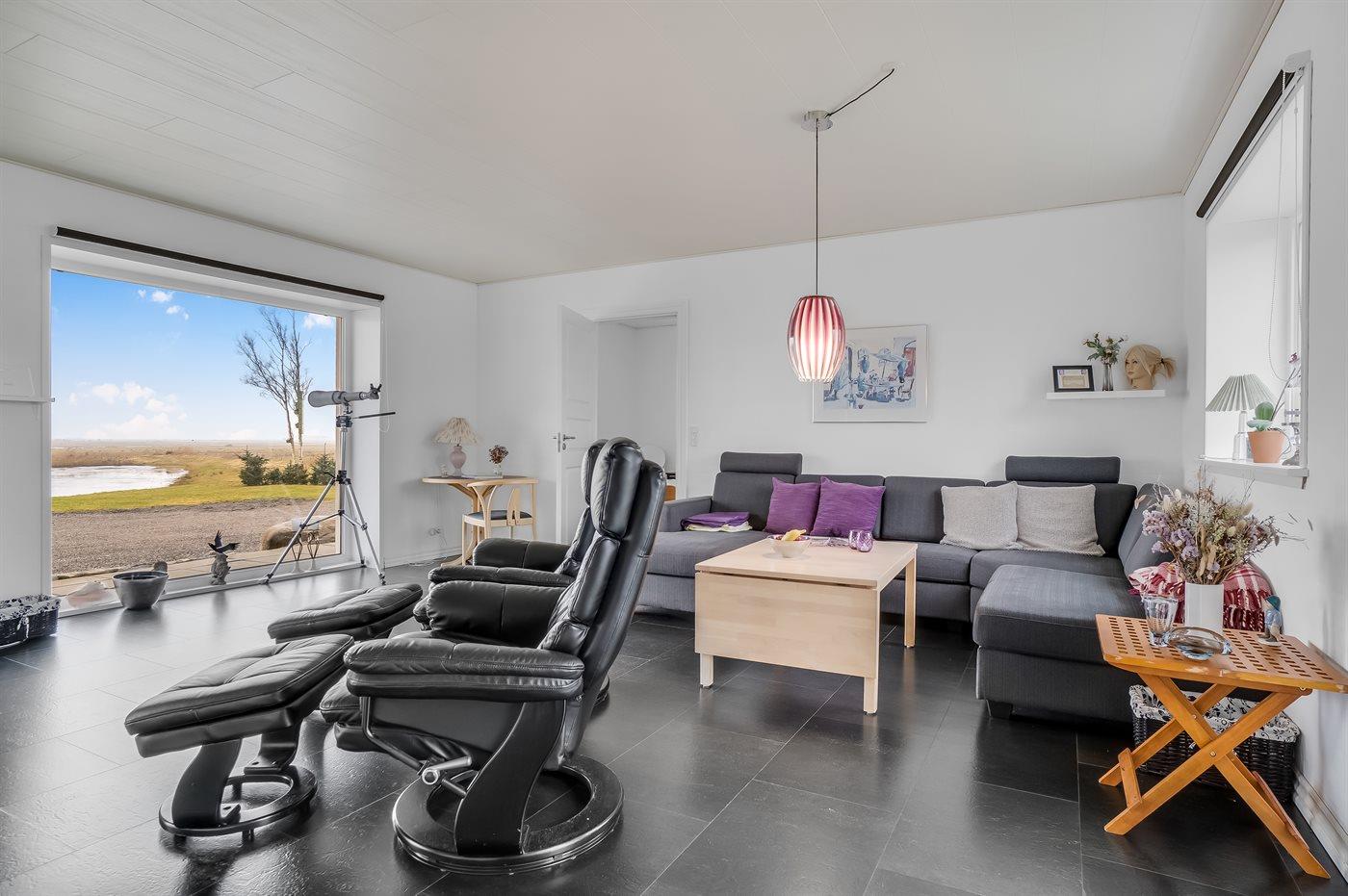 Ein helles und offenes Wohnzimmer mit Platz für Entspannung und Geselligkeit sowie einem herrlichen Blick auf See und Felder