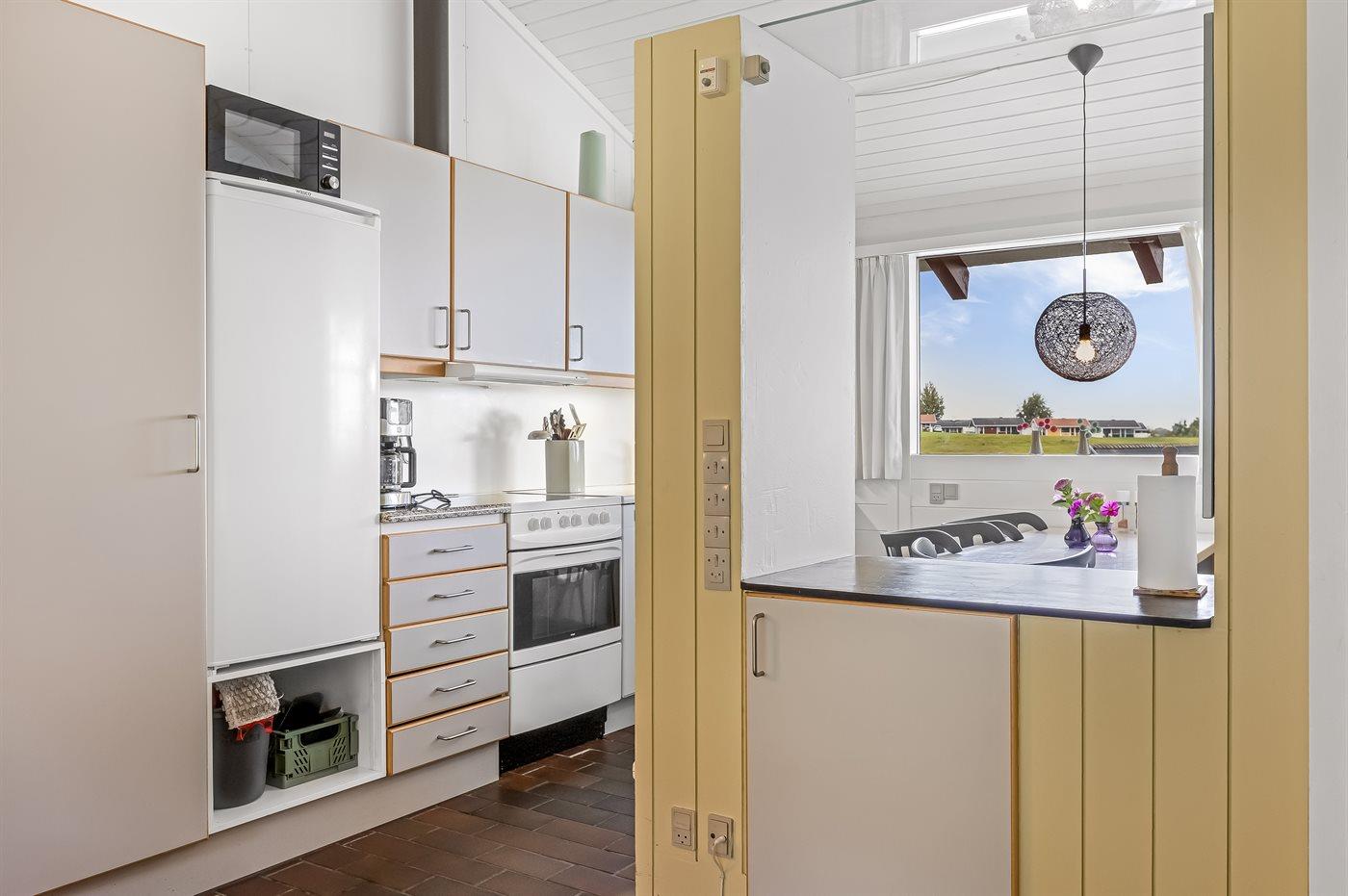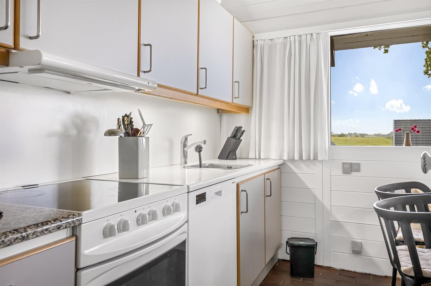 Die Küche ist mit Kühlschrank ausgestattet. Außerdem gibt es 4 Keramik-Kochfelder, Umluftofen, Mikrowelle sowie Geschirrspüler.