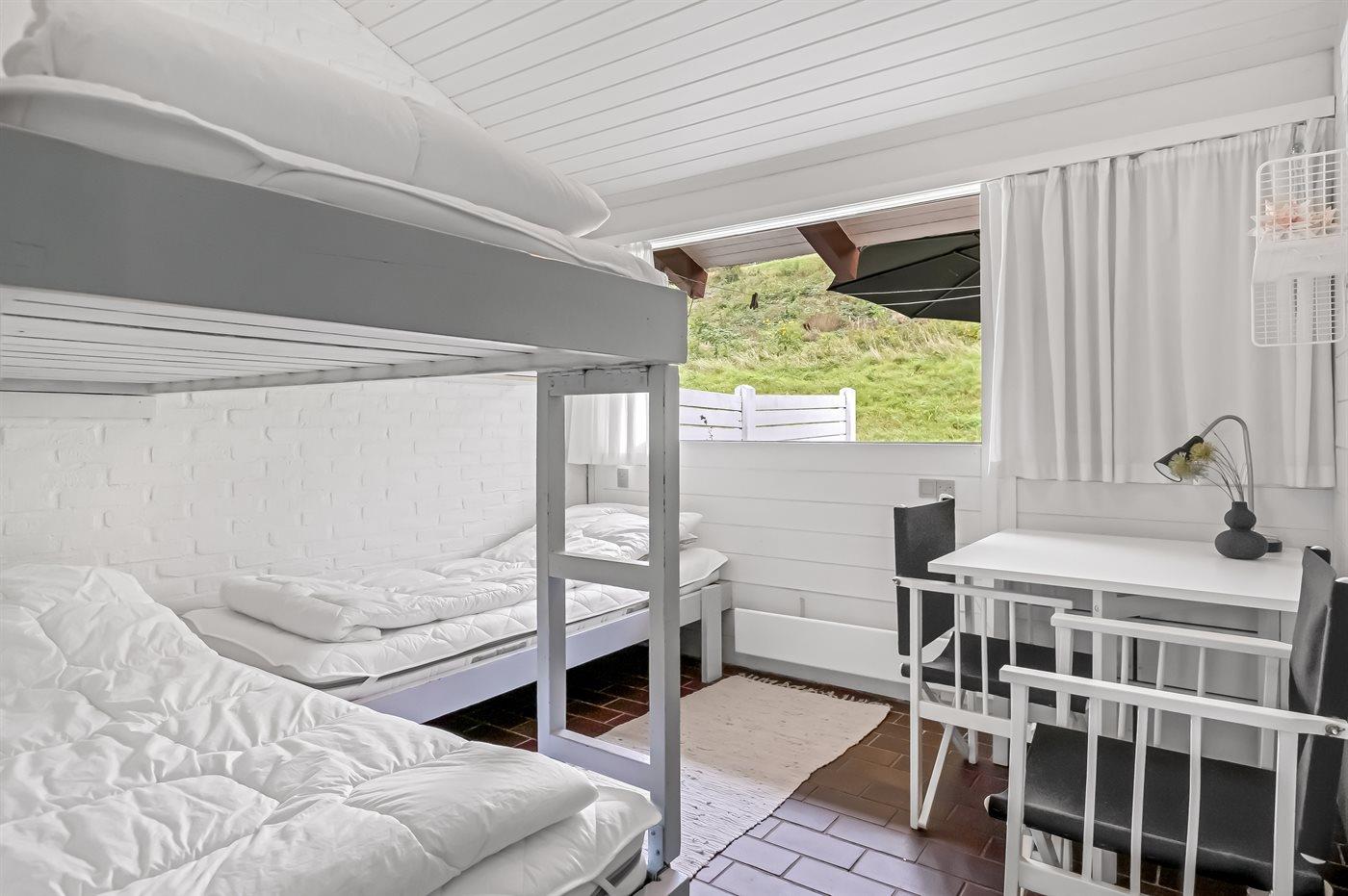 Die Schlafplätze verteilen sich auf 2 Schlafräume. 2 Schlafplätze in einem Doppelbett. 3 Schlafplätze in Etagenbetten.