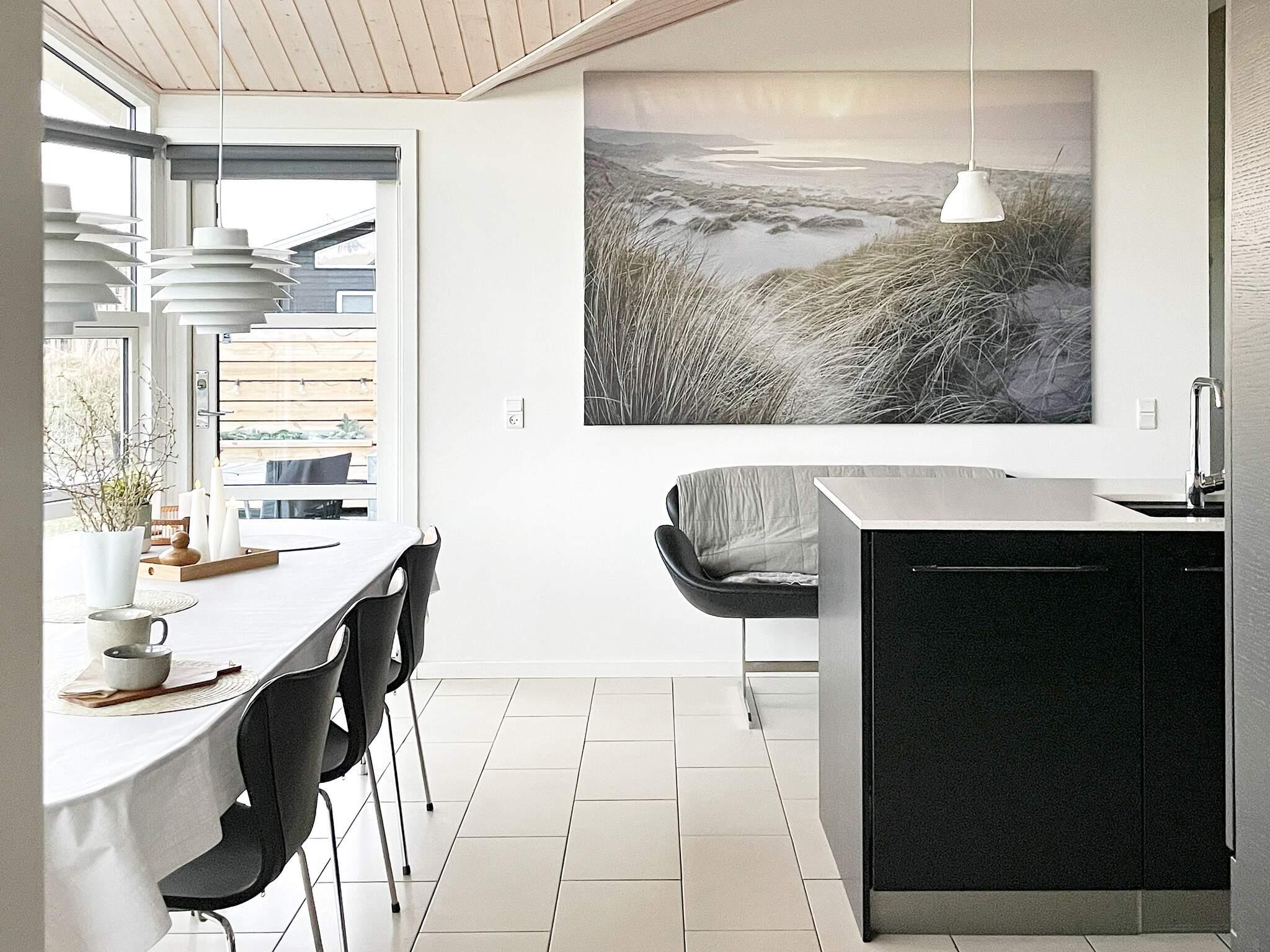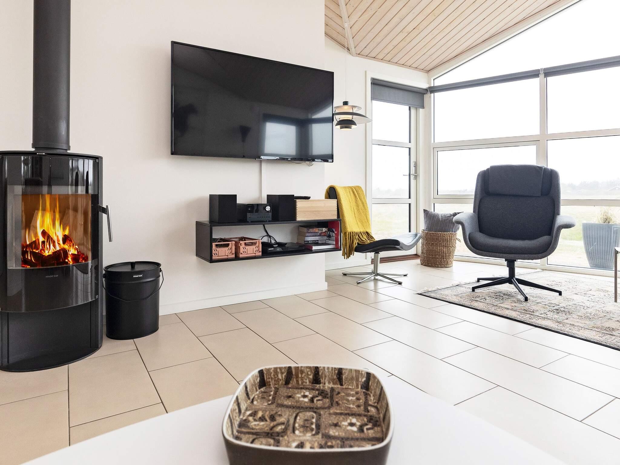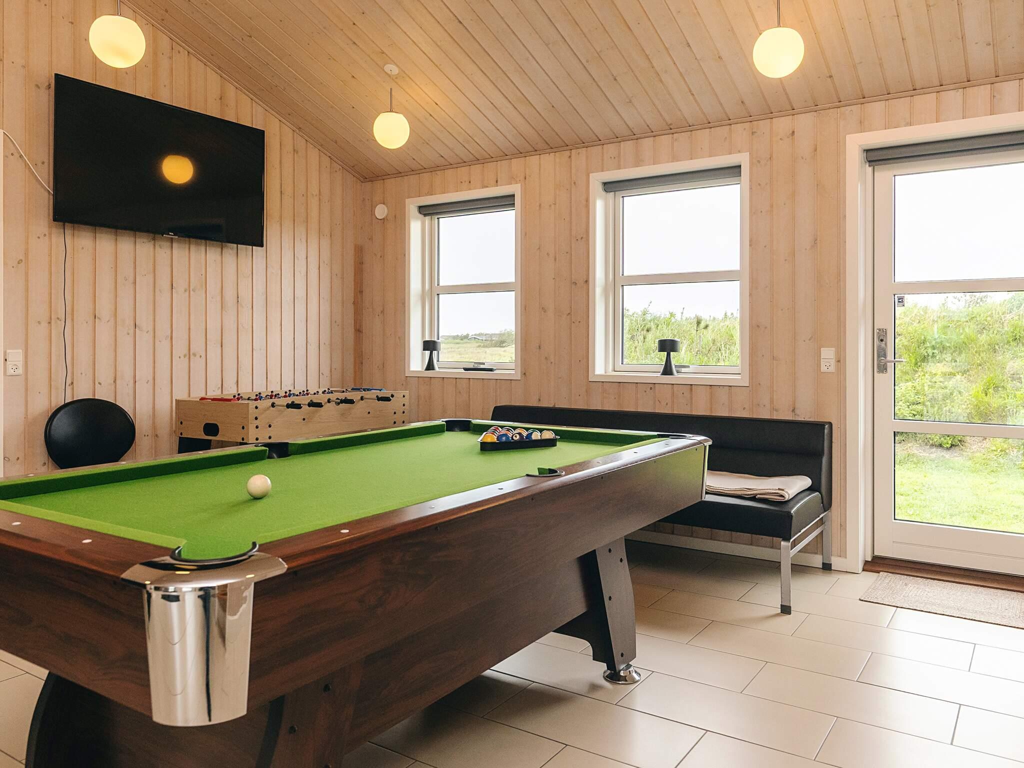 Das Wohnzimmer ist aufgeteilt in einen Wohnbereich mit Sesseln, Sofagruppe, Fernseher und einen Küchen-/Essbereich - beides mit viel Platz. Im Aktivitätsraum gibt es einen Fernseher, Billardtisch und Tischfußball. Die großen, teils bodentiefen Fenster sorgen den ganzen Tag über für absolut traumhafte Lichtverhältnisse. Das Mobiliar ist in modernem, typisch dänischem Stil und von höchster Qualität. Am Haus befinden sich Terrassenflächen nach Osten, Süden und Südwesten mit vielen Möglichkeiten für Outdooraktivitäten und Sonnentage im Freien. Zudem gibt es eine überdachte Terrasse. Das Grundstück ist ein Naturgrundstück mit ausgesuchter Bepflanzung.