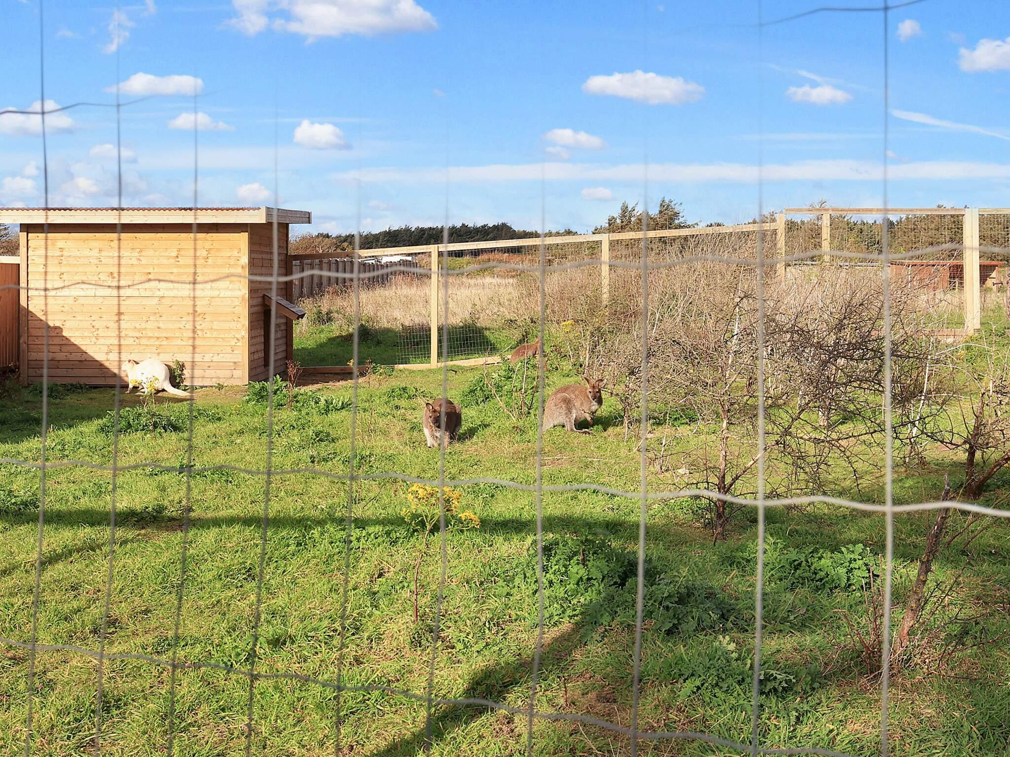 Die Hütten haben einen großen Fensterabschnitt am westlichen Ende der Hütte, was sie sehr hell und einladend macht. Die Terrasse, von der aus man Blick auf den Spielplatz, das Hüpfkissen und das Ballfeld hat, ist vollständig überdacht.