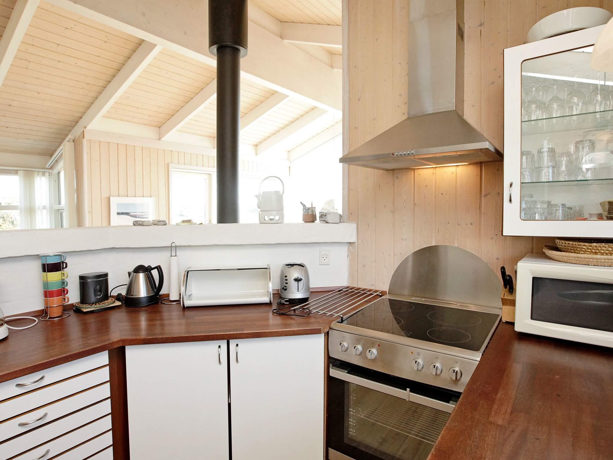 Gepflegtes Ferienhaus mit geschmackvoller, moderner Einrichtung, hellen Räumen und mehreren Terrassen. Das Haus liegt auf einem hügeligen, gemeinschaftlichen Dünengrundstück, nur ca. 200 m von Meer und Strand. Von Wohnzimmer und Terrasse bietet sich eine schöne Aussicht auf die Dünenlandschaft. Das Haus verfügt über Küchen-Wohnbereich, ein Schlafzimmer mit Doppelbett, ein Schlafzimmer mit zwei Einzelbetten, ein Alkoven mit Doppelmatratze und einen Hems mit zwei Matratzen. Weiterhin gibt es ein Bad mit Whirlpool, Sauna und angenehmer Fußbodenheizung. Die Einrichtung ist im dänischen Ferienhausstil gehalten und sehr gemütlich. Eine Wärmepumpe und ein Holzofen halten die Energiekosten in Grenzen. Die 60 m² große Terrassenfläche ist teilweise überdacht.