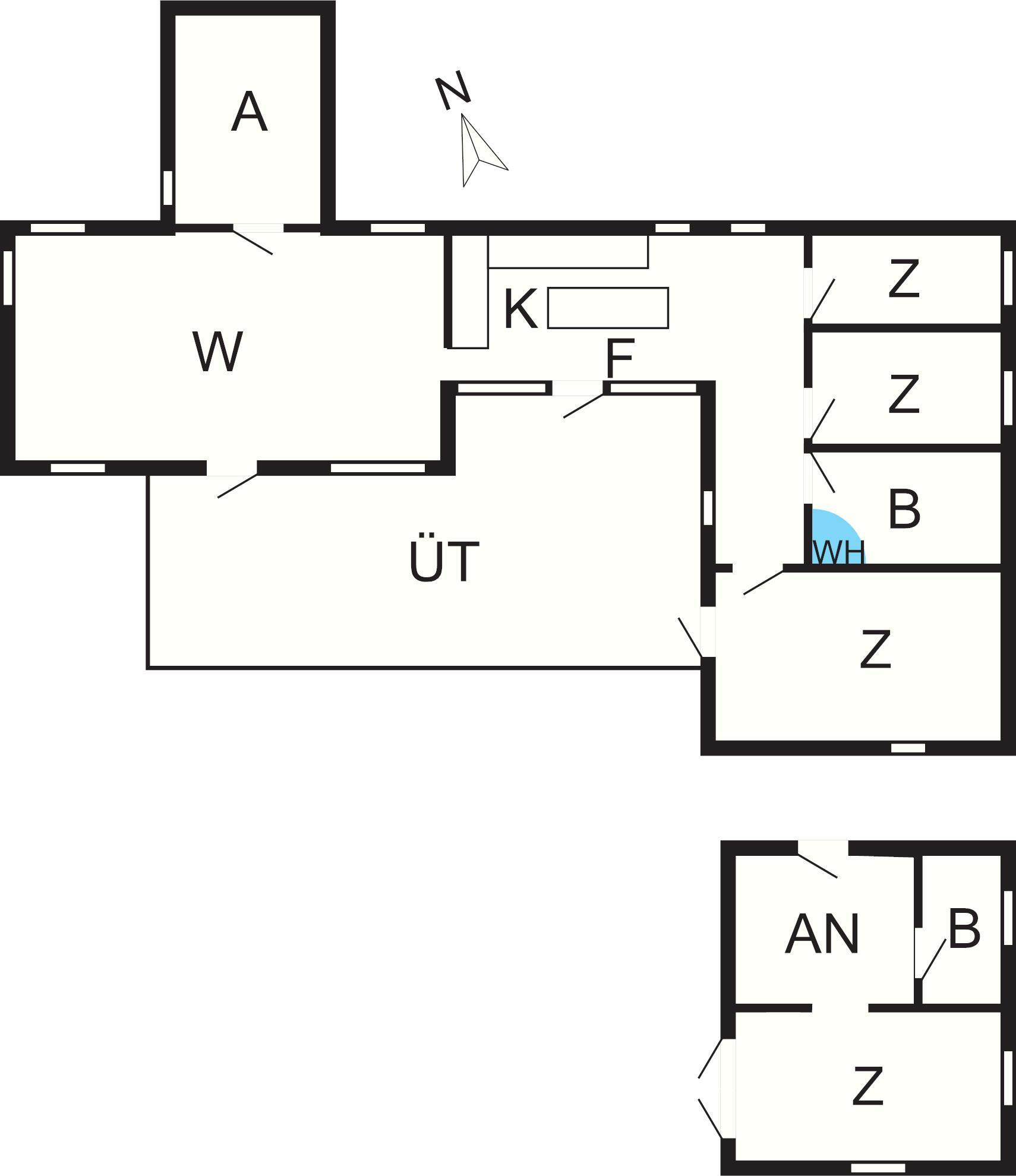 Bad mit Whirlpool und Dusche im Haus, das 1960 erbaut und 2016 umfassend renoviert und vergrößert wurde. Offener Küchen-/Essbereich und im Anschluss daran geräumiges Wohnzimmer. Außerdem stehen drei Schlafzimmer im Haus bereit. Separater Annex nebenan auf dem Grundstück mit vier Schlafplätzen, verteilt auf zwei Räume mit offener Verbindung, und eigenem Bad.