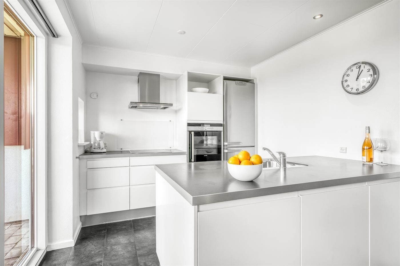 Die Küche ist mit Kühlschrank ausgestattet. Außerdem gibt es 4 Keramik-Kochfelder, Umluftofen, Mikrowelle sowie Geschirrspüler. Fußbodenheizung in der Küche.