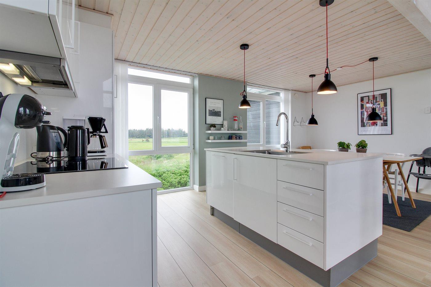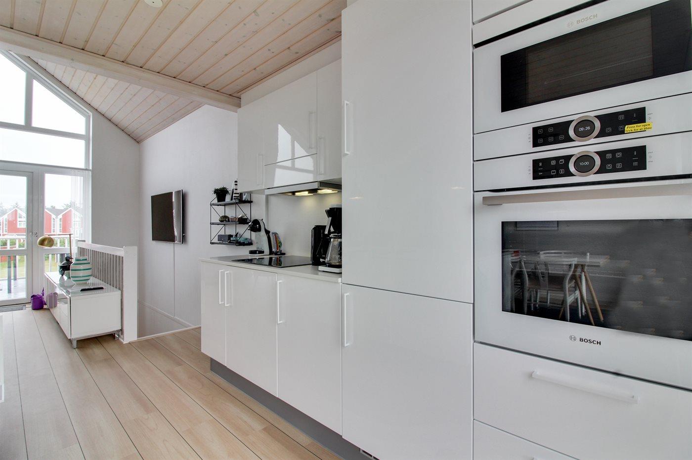 Die Küche ist mit Kühlschrank ausgestattet. Außerdem gibt es 3 Induktions-Kochzonen, Umluftofen, Mikrowelle sowie Geschirrspüler.