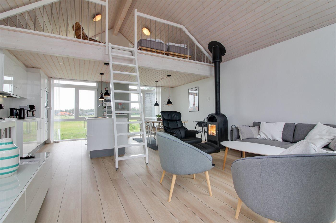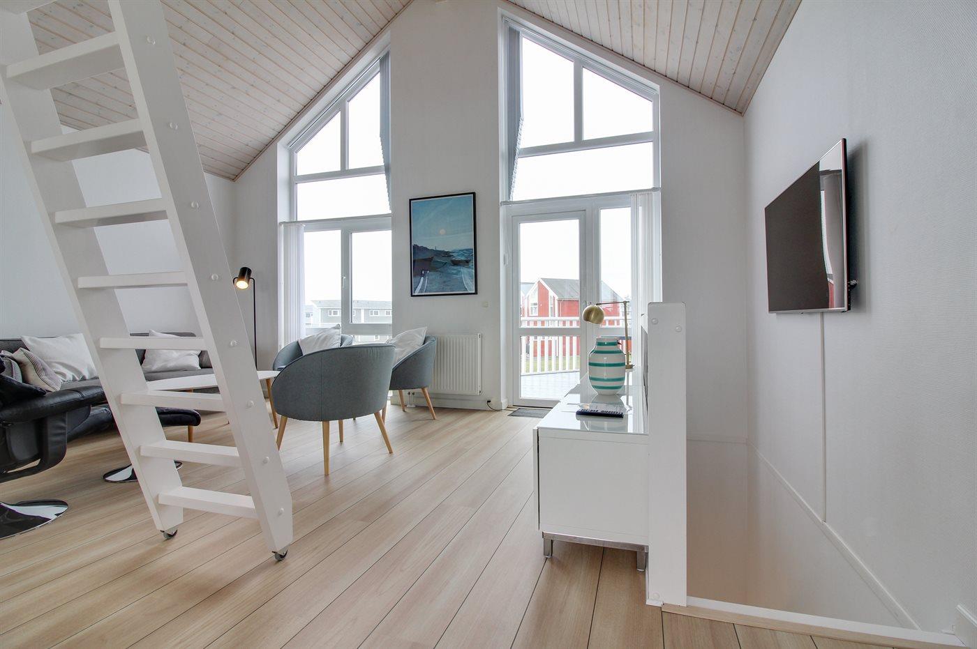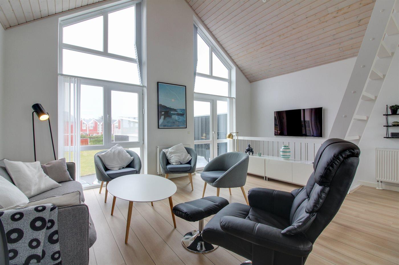 Die Wohnung ist hell und einladend eingerichtet mit großen Fenstern in beiden Giebeln, die für ein phantastisches Lichteinfall sorgen. Außerdem Zugang zum offenen Obergeschoss mit Ausblick auf den Golfplatz. Das offene Obergeschoss ist bei den Kindern und jugendlichen besonders beliebt und hier stehen u. a. Sitzsäcke zur Verfügung. Vom Wohnzimmer aus gibt es Zugang zu einer Terrasse mit Gartenmöbeln und Ausblick auf den einen Spielplatz.