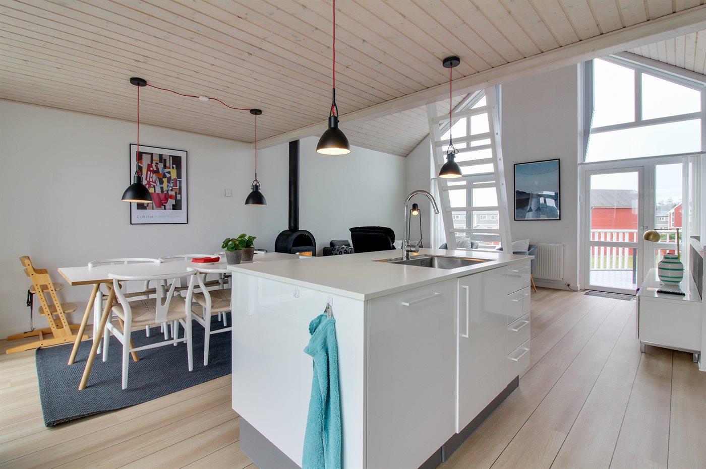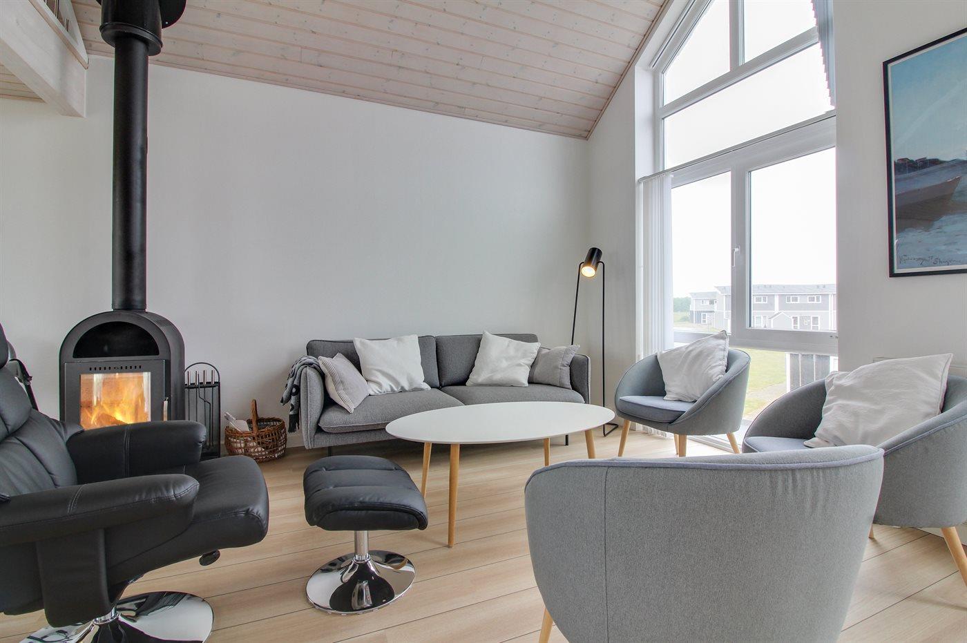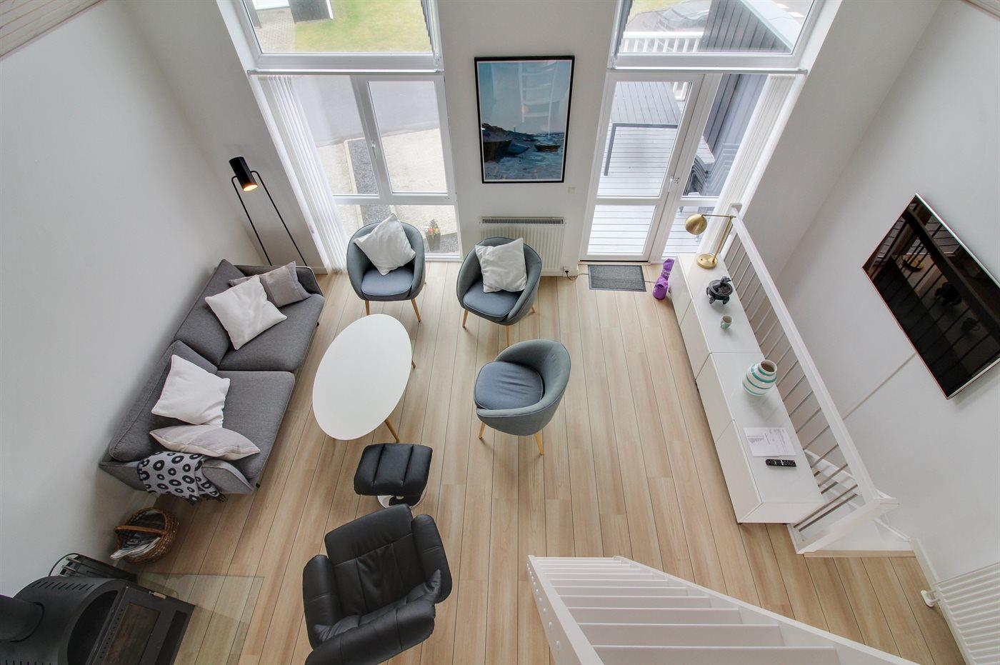 Die Wohnung ist hell und einladend eingerichtet mit großen Fenstern in beiden Giebeln, die für ein phantastisches Lichteinfall sorgen. Außerdem Zugang zum offenen Obergeschoss mit Ausblick auf den Golfplatz. Das offene Obergeschoss ist bei den Kindern und jugendlichen besonders beliebt und hier stehen u. a. Sitzsäcke zur Verfügung. Vom Wohnzimmer aus gibt es Zugang zu einer Terrasse mit Gartenmöbeln und Ausblick auf den einen Spielplatz.