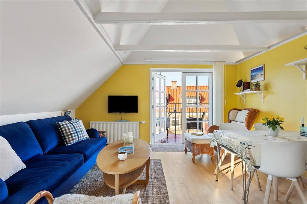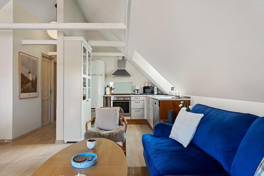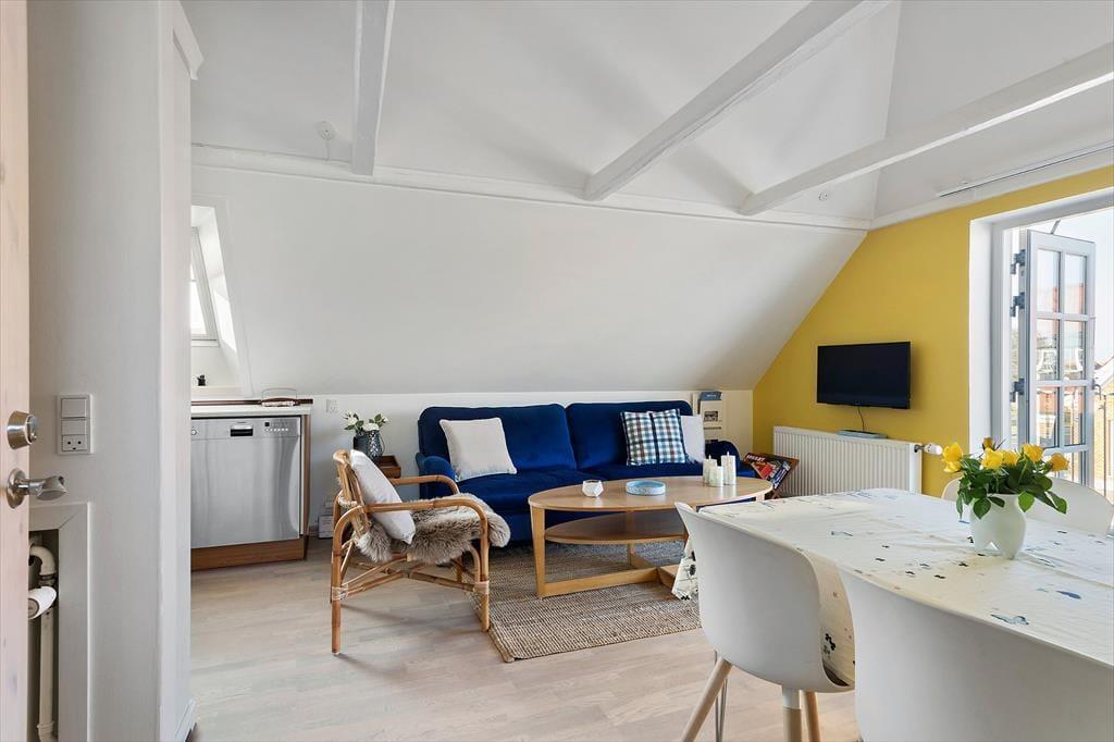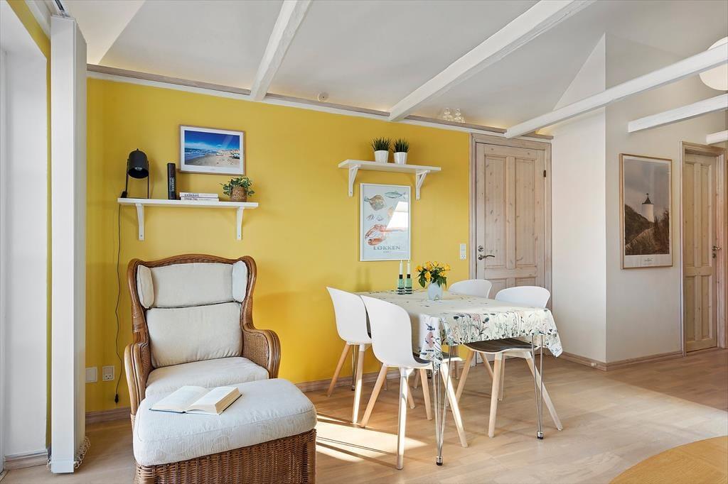 Im Inneren setzt sich die einladende Atmosphäre fort: Helle Flächen und eine schlichte, harmonische Einrichtung schaffen Raum für Ruhe und Nähe. Die Wohnung liegt im 1. Obergeschoss, der Zugang erfolgt jedoch vom Erdgeschoss aus, was einen leichten und bequemen Eintritt ermöglicht. Die teilweisen Modernisierungen aus dem Jahr 2025 sind deutlich spürbar und schaffen eine angenehme Balance zwischen Klassik und Moderne. Hier findest du ideale Rahmenbedingungen, um den Tag ruhig mit einer Tasse Morgenkaffee zu beginnen oder nach einem erlebnisreichen Tag an der Nordsee zusammenzukommen. Das Licht strömt herein und verleiht den Räumen eine Leichtigkeit, die zur Entspannung einlädt – ganz gleich, ob der Urlaub aus langen, entspannten Morgenstunden oder gemütlichen Abenden mit Kartenspielen, Gesprächen und echter Ferienstimmung besteht. Die Wohnung fühlt sich an wie ein sicherer und behaglicher Rückzugsort mitten im lebendigen Ferienort Løkken.