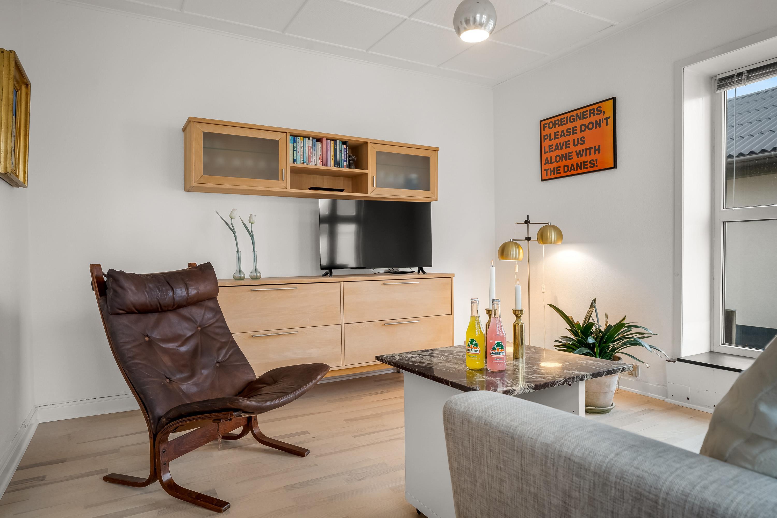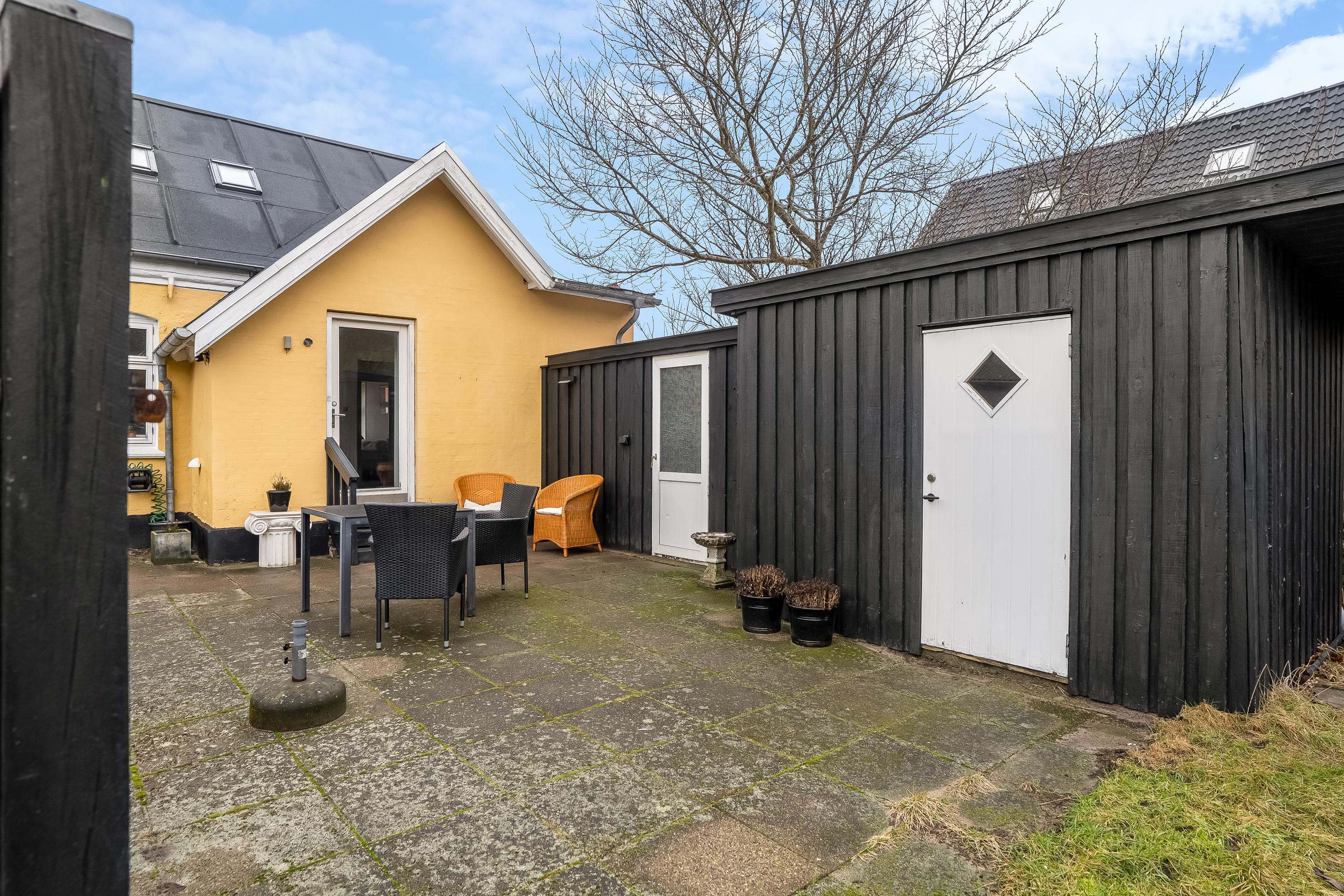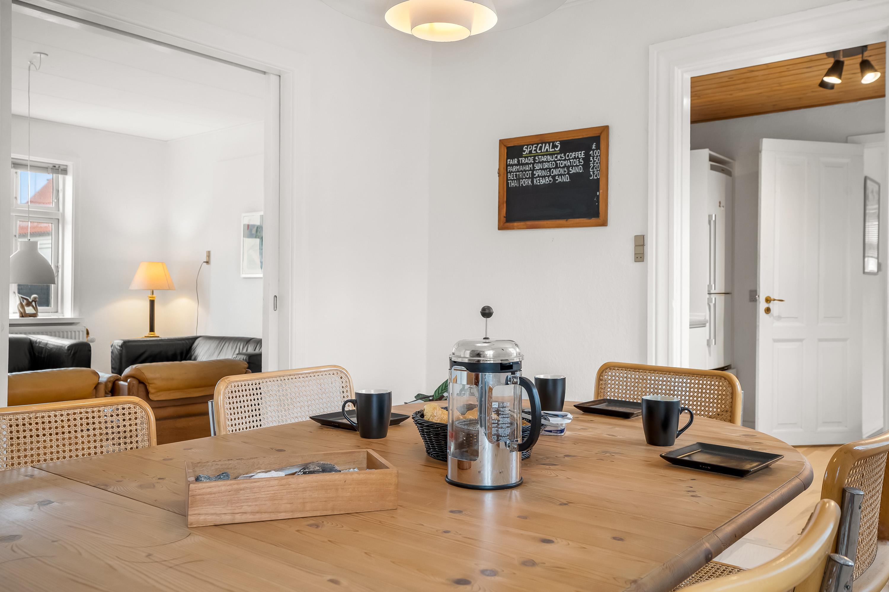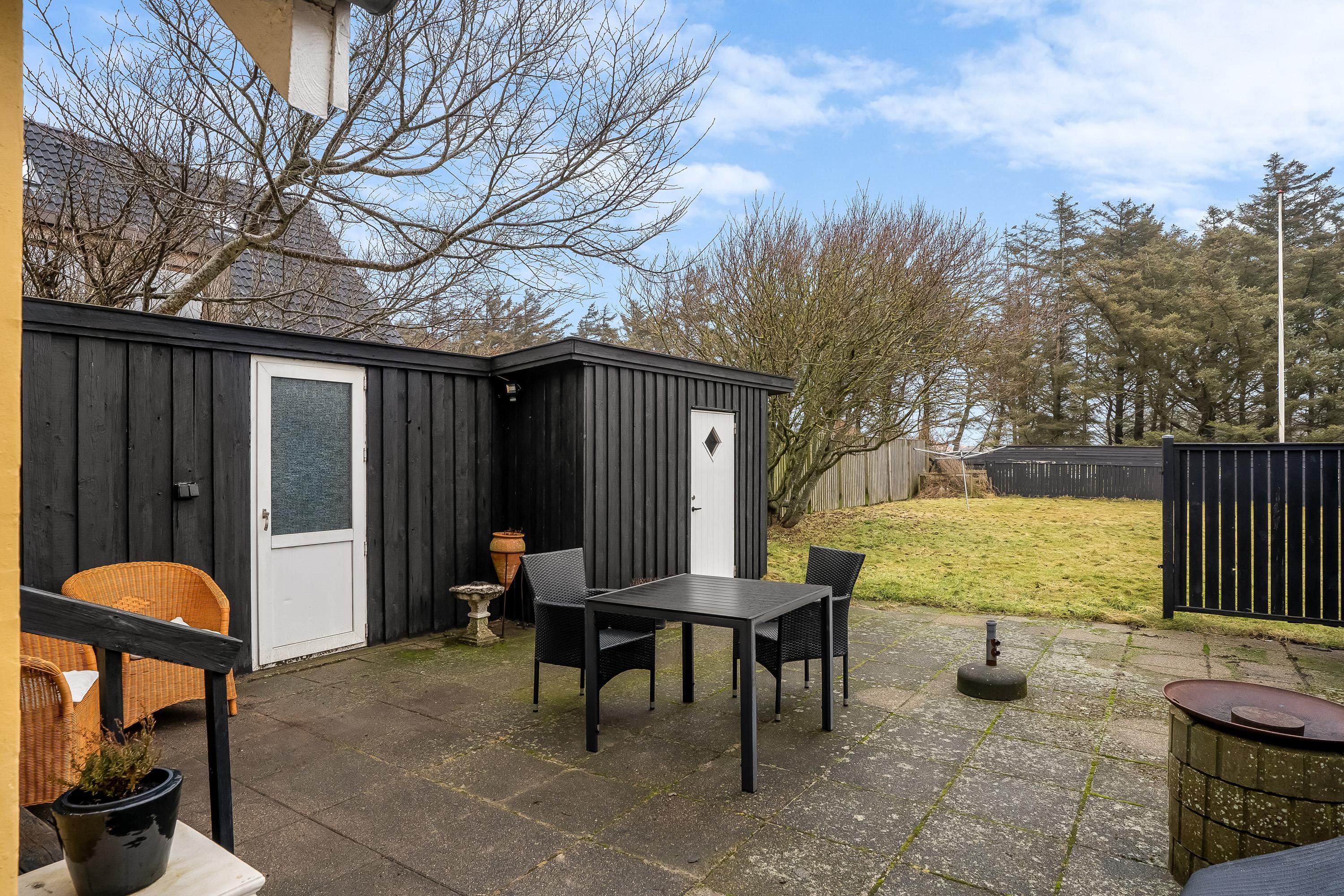 Der große Garten grenzt an ein grünes Gebiet bei der Løkken Schule, sodass sich hinter dem Haus keine Bebauung befindet. Der Garten und die große Terrasse werden mit der Wohnung im ersten Stock geteilt und schaffen eine ruhige Atmosphäre, obwohl Sie zentral und nahe der Nordsee wohnen.