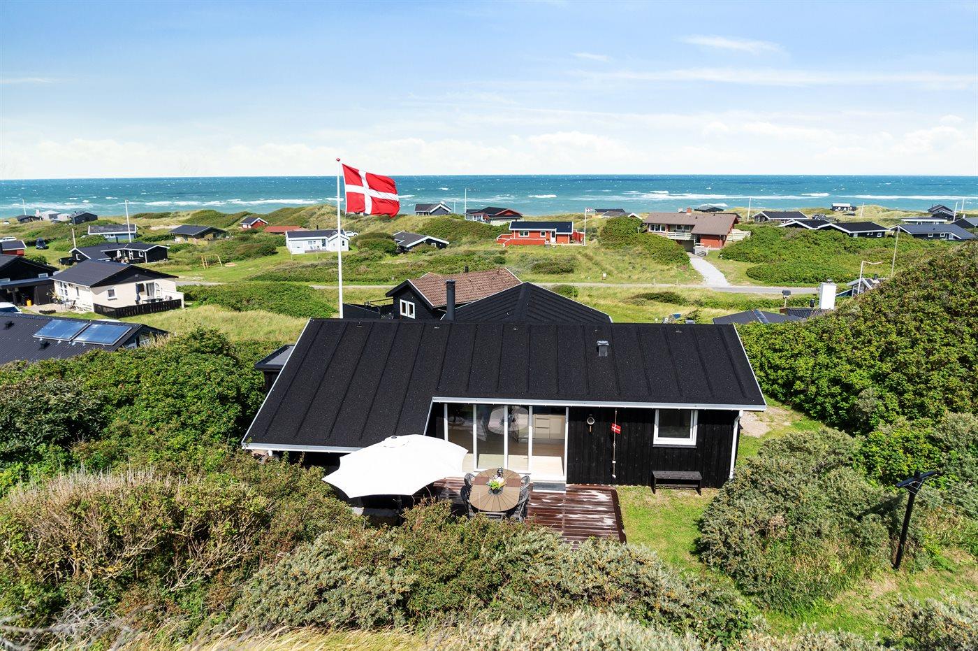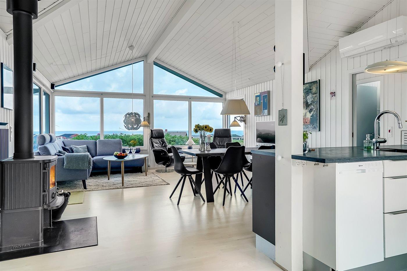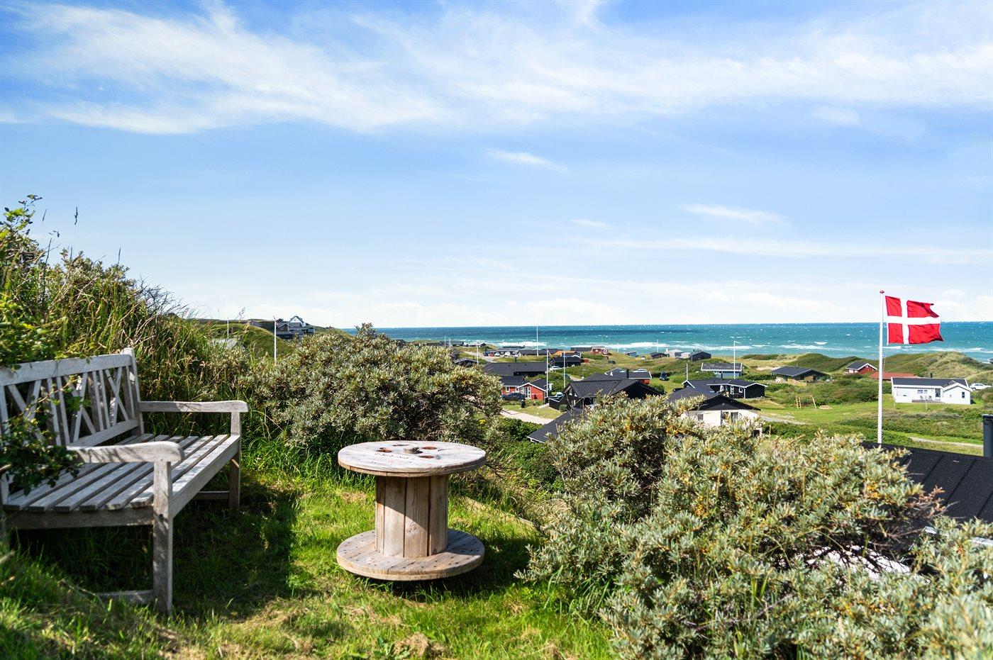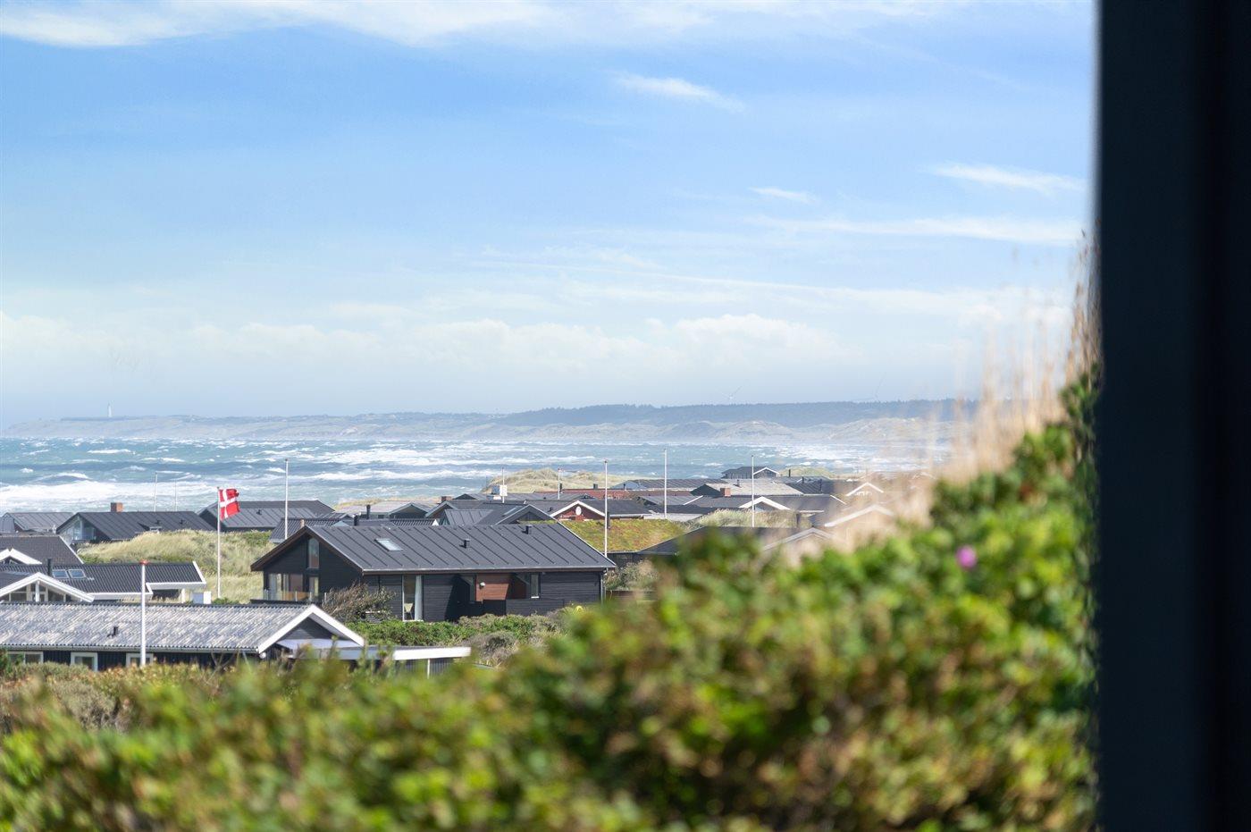 Sommerhaus mit phantastischem 180 Grad Panoramablick zur Meerseite im populären Lönstrup. Von diesem Ferienhaus aus können Sie die herrliche Szenerie direkt vor der Haustür bequem geniessen. Der wunderbare Meerblick ist ungestört zu geniessen, so weit das Auge reicht. Das Haus ist gemütlich und praktisch eingerichtet mit modernem und komfortablen Mobiliar und einem zur Stube hin offenen Küchenbereich.Von sowohl Küche als auch Stube kann man das glitzernde Meer sehen. Zum Haus gehört ebenfalls ein offenes Dachgeschoss, von dem auch die Aussicht genossen werden kann. Das Haus liegt auf einem kupierten Sommerhausgebiet, dicht zum Strand. Da das Haus sehr hoch oben liegt, hat man auch von der Terrasse einen wunderschönen Blick über das Meer. Von der südöstlichen Terrasse kann man das Wasser durch die grossen Panoramascheiben geniessen und sich währenddessen völlig ungestört im Garten, mit gutem Windschutz, aufhalten, sodass man auch bei leicht frischem Wind den Kaffee noch draussen geniessen kann. Hinter dem Haus geht ein kleiner Pfad mit einer Treppe zu einer privaten Aussichtsbank, von der aus man gefühlt ganz Nordjütland sehen kann.