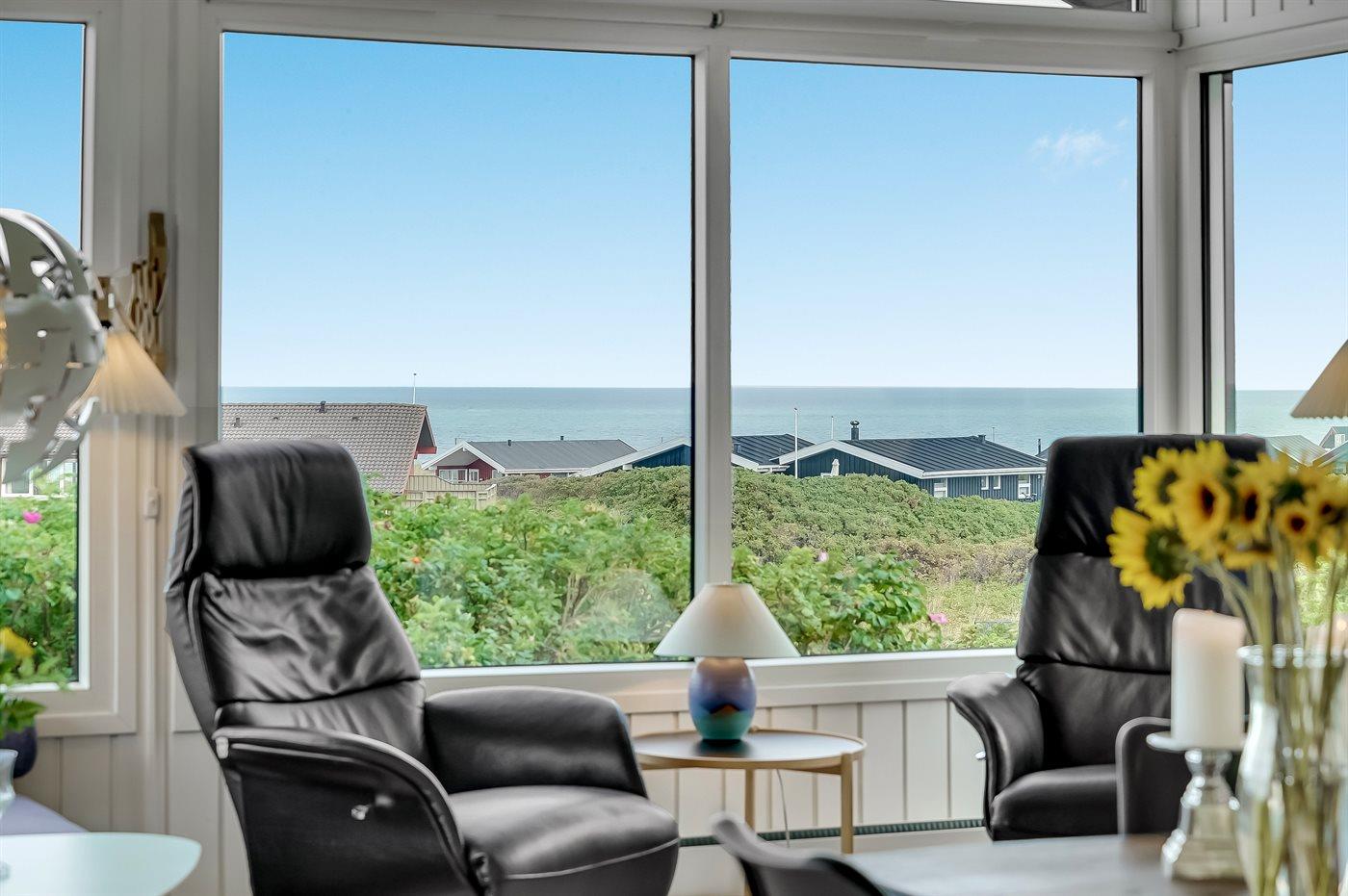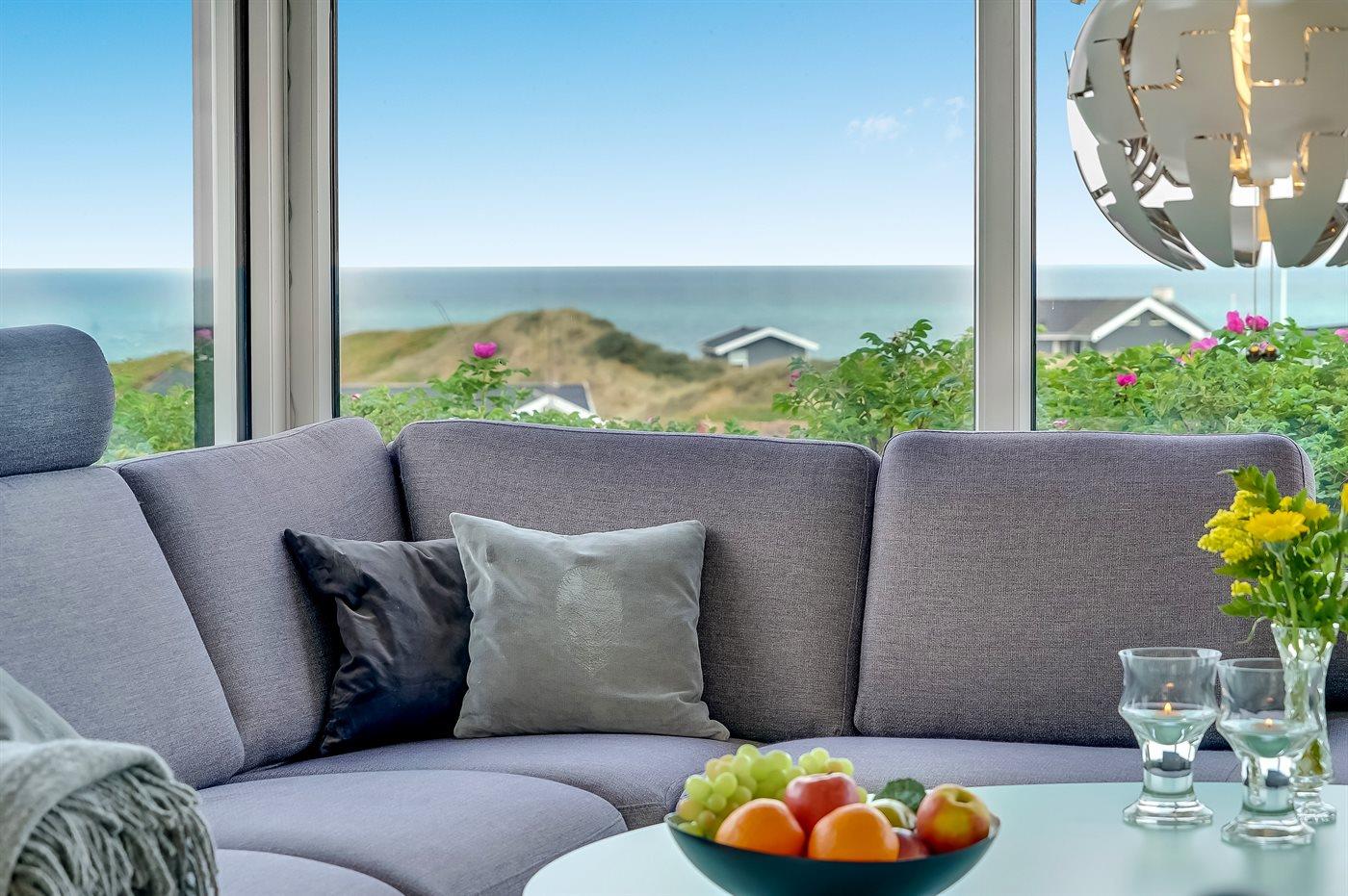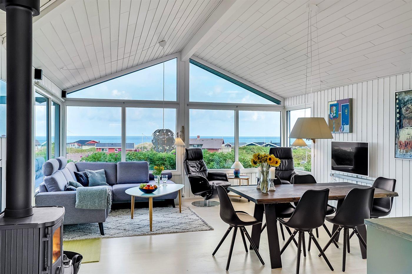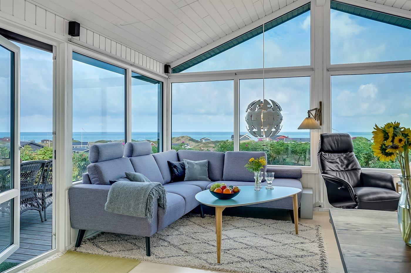 Sommerhaus mit phantastischem 180 Grad Panoramablick zur Meerseite im populären Lönstrup. Von diesem Ferienhaus aus können Sie die herrliche Szenerie direkt vor der Haustür bequem geniessen. Der wunderbare Meerblick ist ungestört zu geniessen, so weit das Auge reicht. Das Haus ist gemütlich und praktisch eingerichtet mit modernem und komfortablen Mobiliar und einem zur Stube hin offenen Küchenbereich.Von sowohl Küche als auch Stube kann man das glitzernde Meer sehen. Zum Haus gehört ebenfalls ein offenes Dachgeschoss, von dem auch die Aussicht genossen werden kann. Das Haus liegt auf einem kupierten Sommerhausgebiet, dicht zum Strand. Da das Haus sehr hoch oben liegt, hat man auch von der Terrasse einen wunderschönen Blick über das Meer. Von der südöstlichen Terrasse kann man das Wasser durch die grossen Panoramascheiben geniessen und sich währenddessen völlig ungestört im Garten, mit gutem Windschutz, aufhalten, sodass man auch bei leicht frischem Wind den Kaffee noch draussen geniessen kann. Hinter dem Haus geht ein kleiner Pfad mit einer Treppe zu einer privaten Aussichtsbank, von der aus man gefühlt ganz Nordjütland sehen kann.