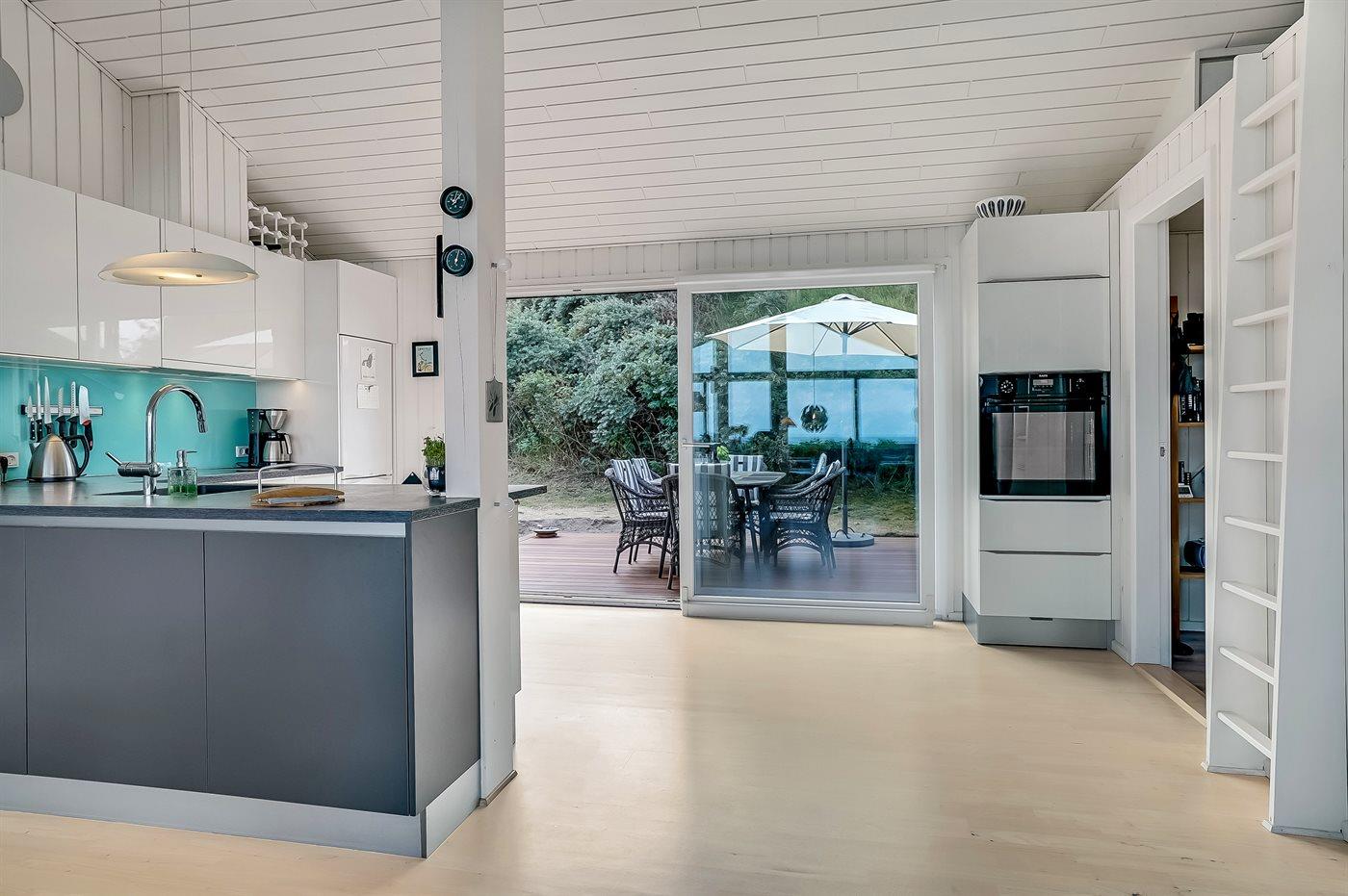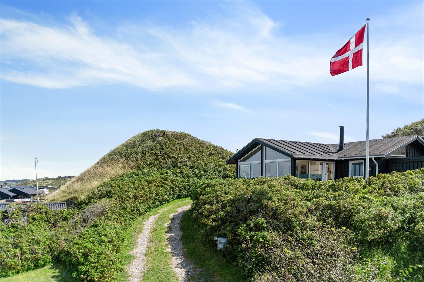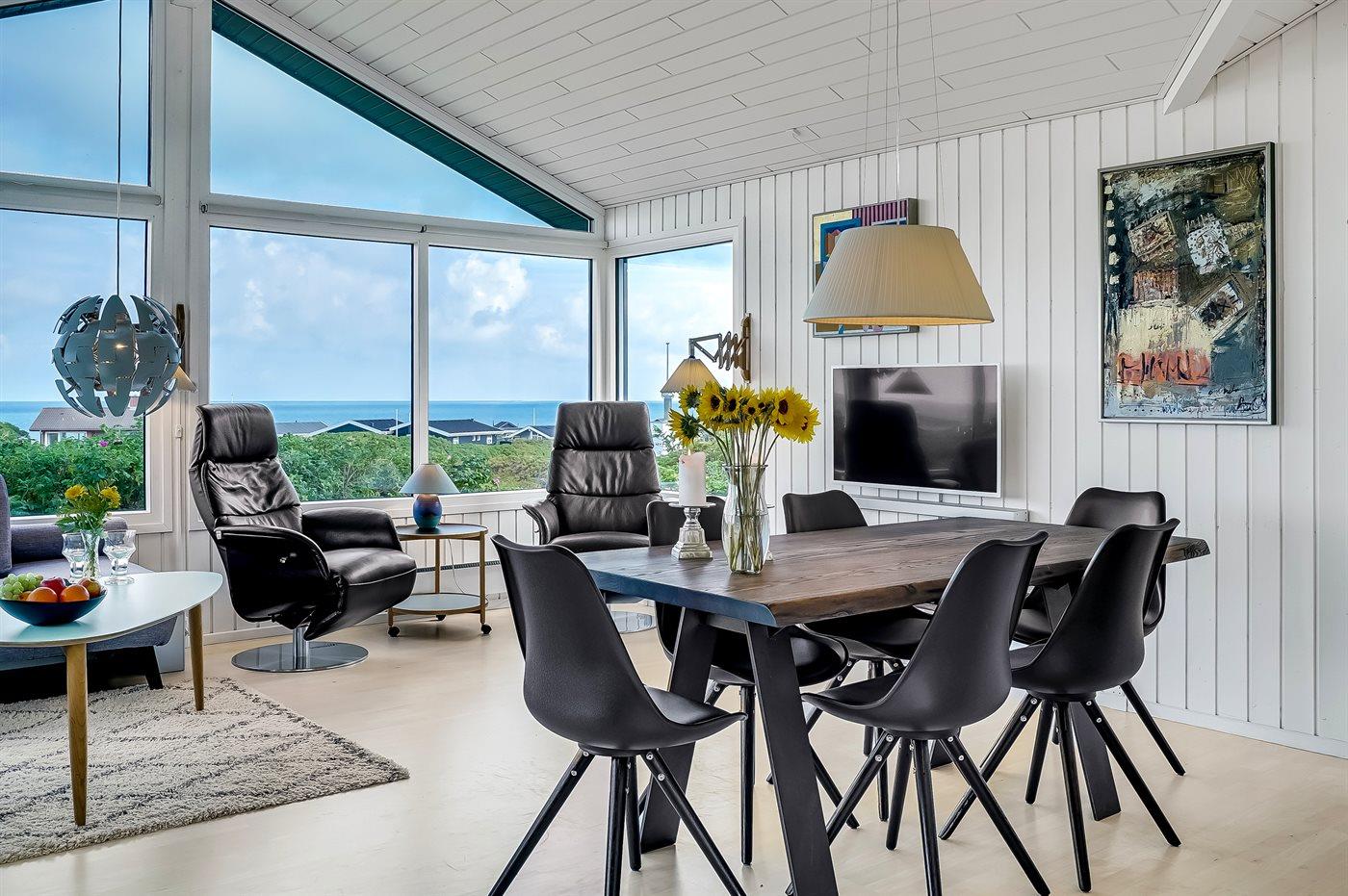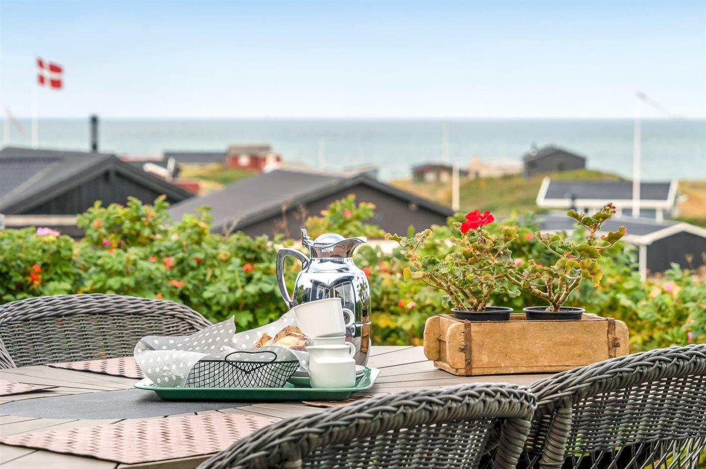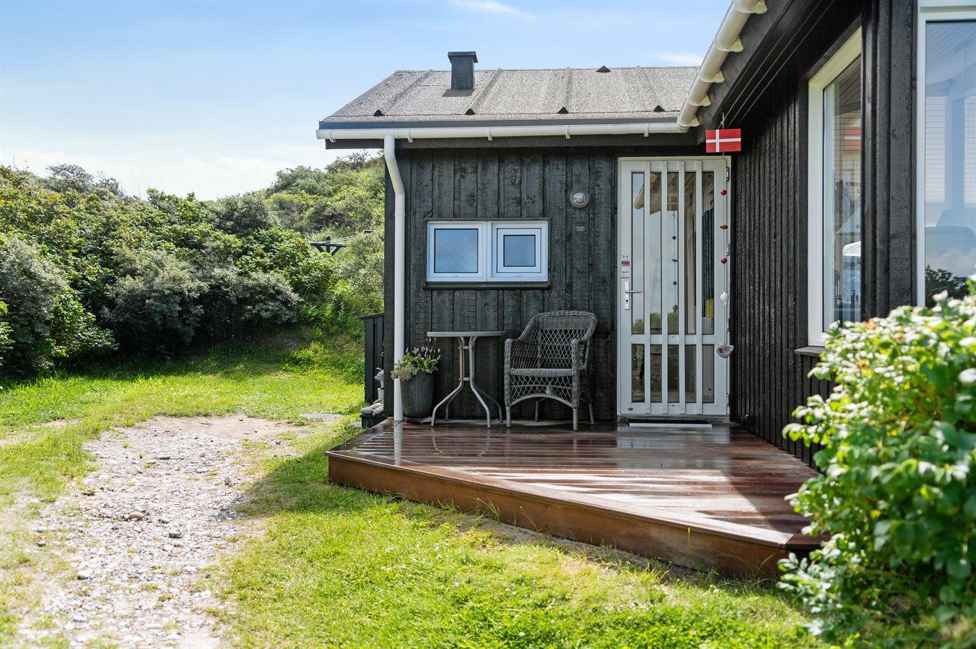 Sommerhaus mit phantastischem 180 Grad Panoramablick zur Meerseite im populären Lönstrup. Von diesem Ferienhaus aus können Sie die herrliche Szenerie direkt vor der Haustür bequem geniessen. Der wunderbare Meerblick ist ungestört zu geniessen, so weit das Auge reicht. Das Haus ist gemütlich und praktisch eingerichtet mit modernem und komfortablen Mobiliar und einem zur Stube hin offenen Küchenbereich.Von sowohl Küche als auch Stube kann man das glitzernde Meer sehen. Zum Haus gehört ebenfalls ein offenes Dachgeschoss, von dem auch die Aussicht genossen werden kann. Das Haus liegt auf einem kupierten Sommerhausgebiet, dicht zum Strand. Da das Haus sehr hoch oben liegt, hat man auch von der Terrasse einen wunderschönen Blick über das Meer. Von der südöstlichen Terrasse kann man das Wasser durch die grossen Panoramascheiben geniessen und sich währenddessen völlig ungestört im Garten, mit gutem Windschutz, aufhalten, sodass man auch bei leicht frischem Wind den Kaffee noch draussen geniessen kann. Hinter dem Haus geht ein kleiner Pfad mit einer Treppe zu einer privaten Aussichtsbank, von der aus man gefühlt ganz Nordjütland sehen kann.