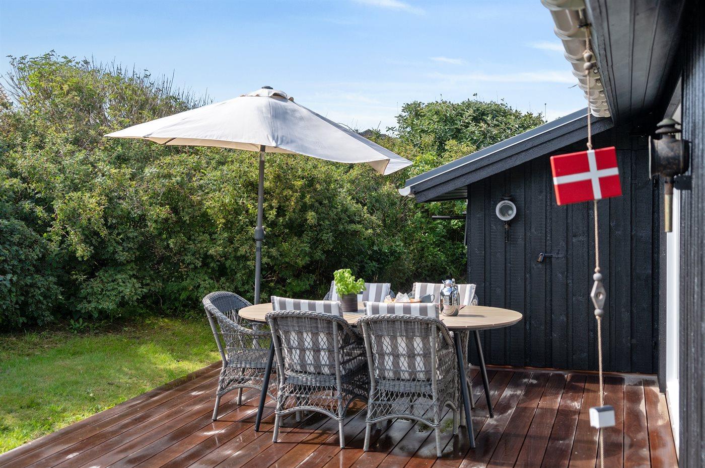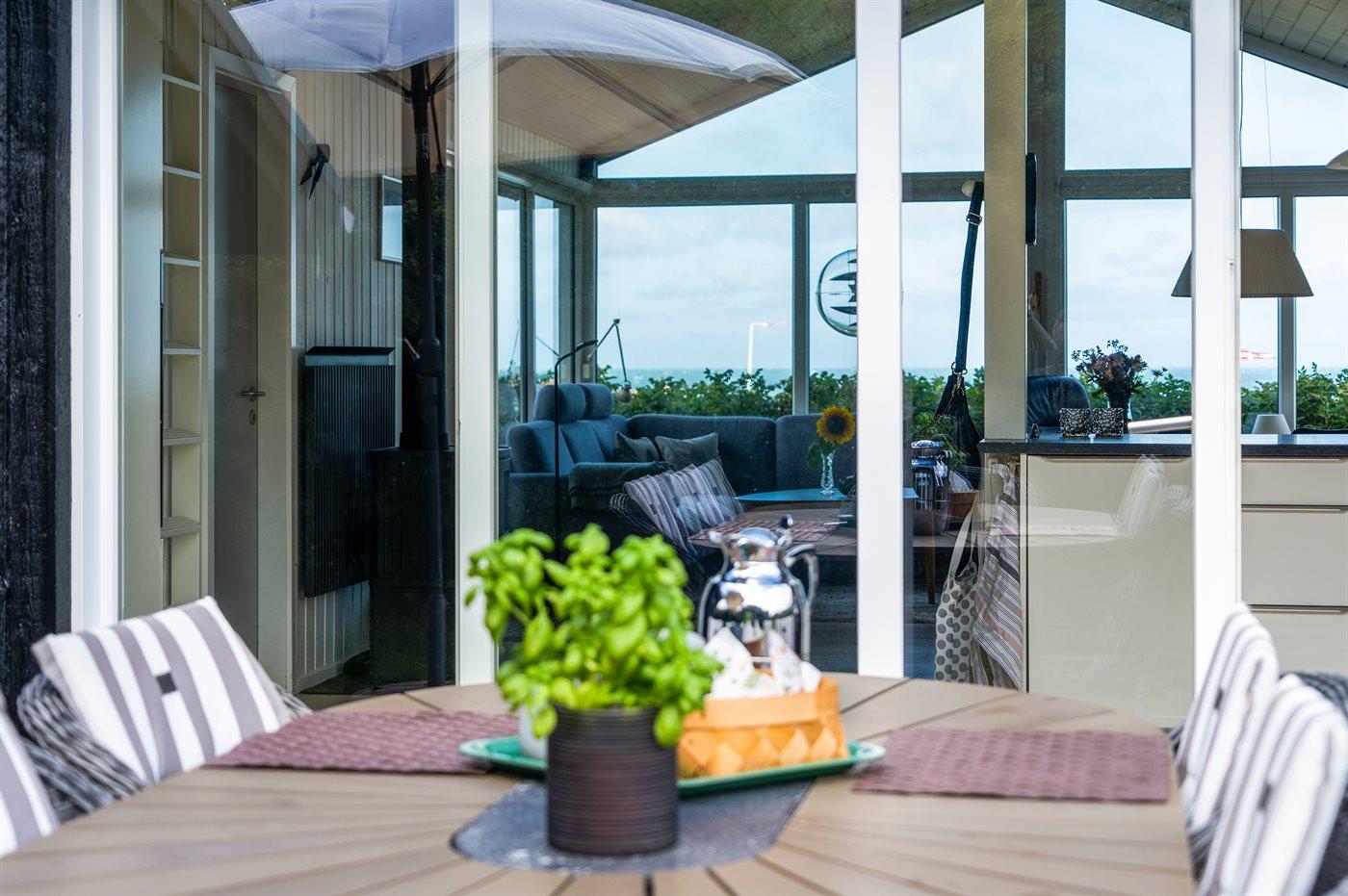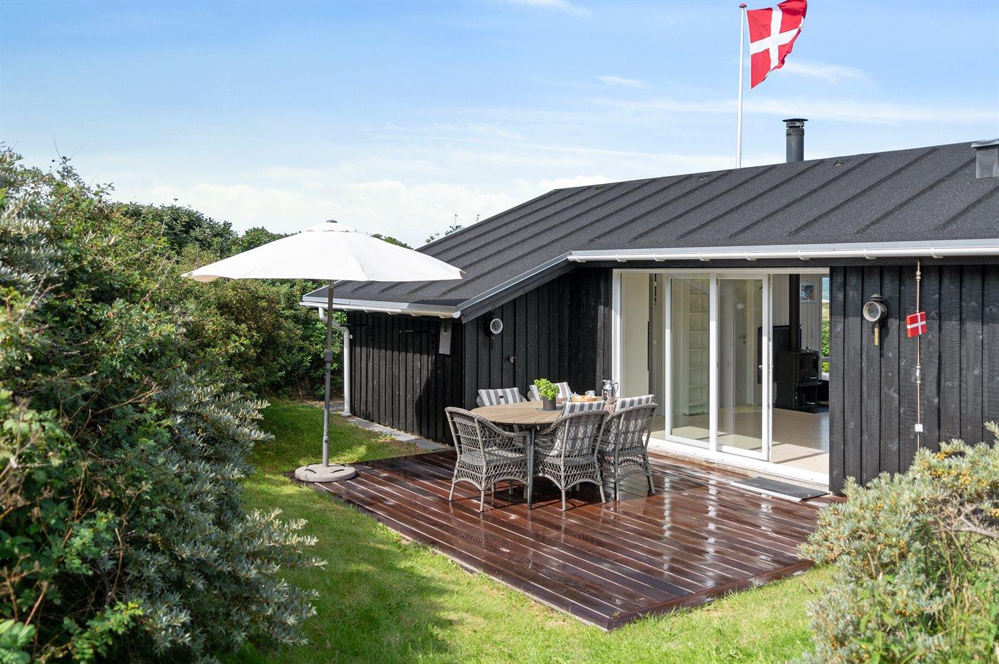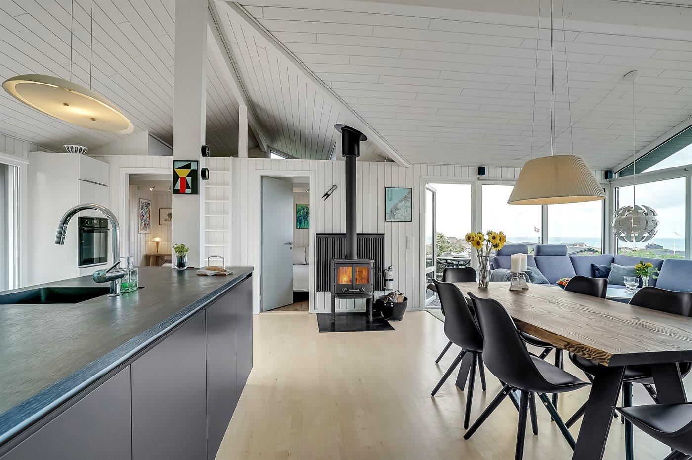 Sommerhaus mit phantastischem 180 Grad Panoramablick zur Meerseite im populären Lönstrup. Von diesem Ferienhaus aus können Sie die herrliche Szenerie direkt vor der Haustür bequem geniessen. Der wunderbare Meerblick ist ungestört zu geniessen, so weit das Auge reicht. Das Haus ist gemütlich und praktisch eingerichtet mit modernem und komfortablen Mobiliar und einem zur Stube hin offenen Küchenbereich.Von sowohl Küche als auch Stube kann man das glitzernde Meer sehen. Zum Haus gehört ebenfalls ein offenes Dachgeschoss, von dem auch die Aussicht genossen werden kann. Das Haus liegt auf einem kupierten Sommerhausgebiet, dicht zum Strand. Da das Haus sehr hoch oben liegt, hat man auch von der Terrasse einen wunderschönen Blick über das Meer. Von der südöstlichen Terrasse kann man das Wasser durch die grossen Panoramascheiben geniessen und sich währenddessen völlig ungestört im Garten, mit gutem Windschutz, aufhalten, sodass man auch bei leicht frischem Wind den Kaffee noch draussen geniessen kann. Hinter dem Haus geht ein kleiner Pfad mit einer Treppe zu einer privaten Aussichtsbank, von der aus man gefühlt ganz Nordjütland sehen kann.