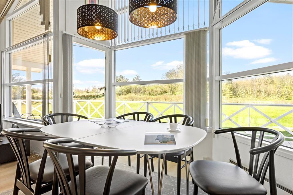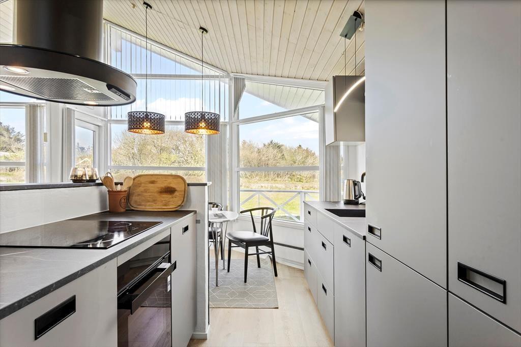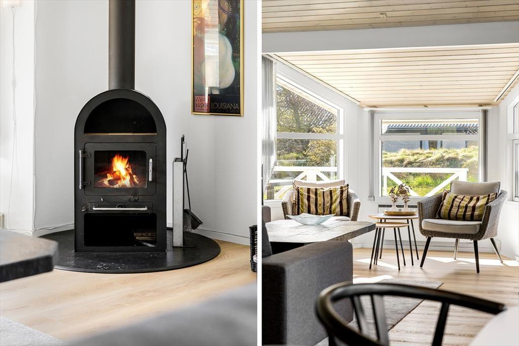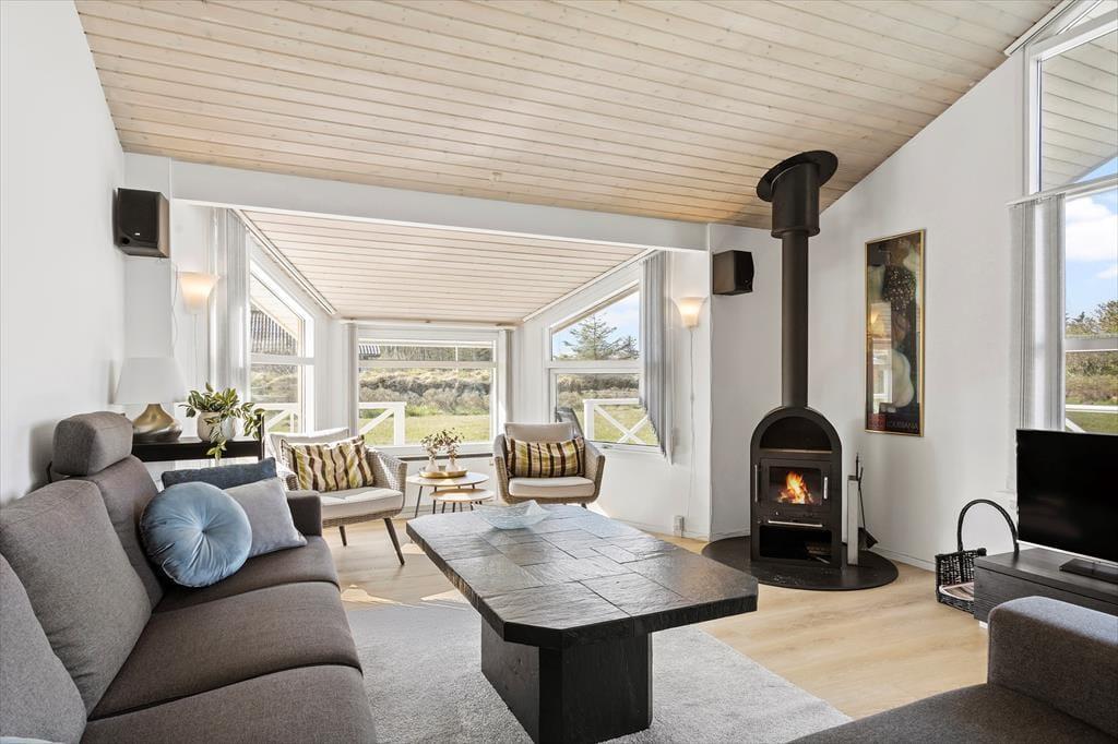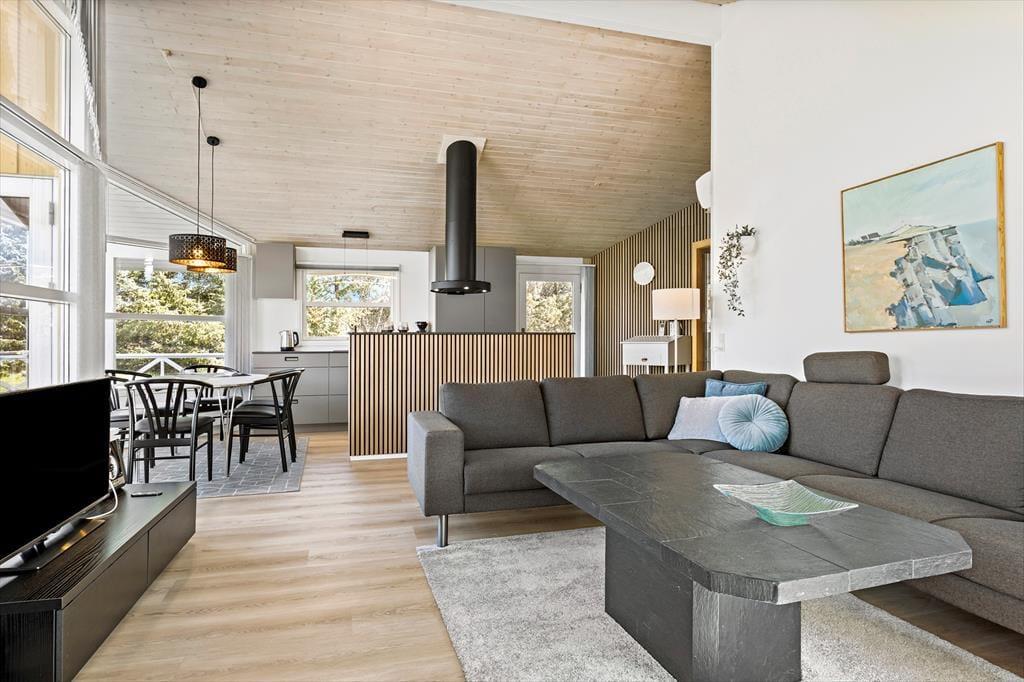 Das Ferienhaus ist hell und freundlich mit guten komfortablen Möbeln eingerichtet. Der große Wohnbereich umfasst eine Küche als offene Verlängerung des Wohnzimmers und hervorragender Mittel- und Treffpunkt der Familie. Badezimmer mit Whirlpool und Sauna. Die großen Fensterfronten bieten tagsüber tolle Lichtverhältnisse und vom Wohnzimmer wird die große Terrasse betreten.