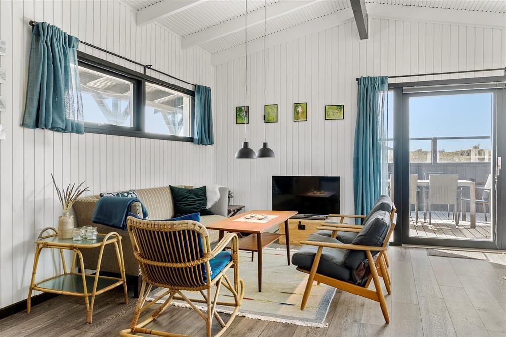Das Haus bietet eine helle und einladende Atmosphäre und wurde mit großem Respekt für den ursprünglichen Ferienhausstil renoviert. Der offene Wohnbereich, der mit der Küche verbunden ist, schafft den idealen Rahmen für gemütliches Beisammensein. Es gibt sowohl einen Essbereich als auch eine Sofaecke, und das hohe Deckenprofil zusammen mit den großen Fensterpartien sorgt für Licht und Luft. Die Küche ist älteren Datums, jedoch voll funktional und harmoniert optisch perfekt mit dem restlichen Interieur. Eine Bar mit Hockern lädt dazu ein, ein Glas Wein zu genießen, während das Essen auf dem Herd köchelt. Das Haus verfügt zudem über zwei Schlafzimmer und ein Badezimmer.