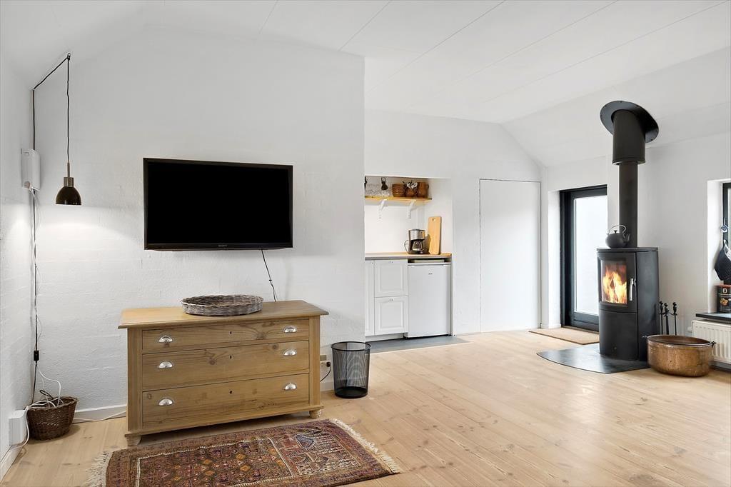 Die Doppelhaushälfte wurde im Jahr 2020 einer gelungenen Renovierung unterzogen. Die 60 m² umfassende Wohnfläche beinhaltet ein Duschbadezimmer mit einer Waschmaschine und einem Wäschetrockner, einen Schlafraum mit einem Doppelbett und einen Wohnraum, in dem ein Schlafsofa, ein Flachbild-TV und eine offen integrierte Miniküche zur Verfügung stehen. In Letztgenannter können Sie Ihr Frühstück und andere Kleinigkeiten zubereiten. An kühlen Tagen und Abenden sorgt der Kaminofen für Wärme und ein Maximum an echter Ferienhausatmosphäre.