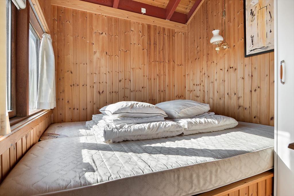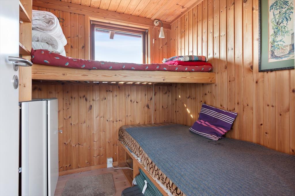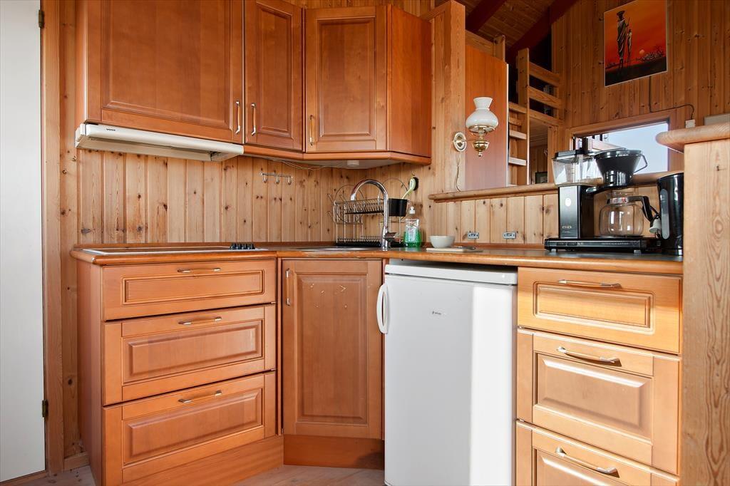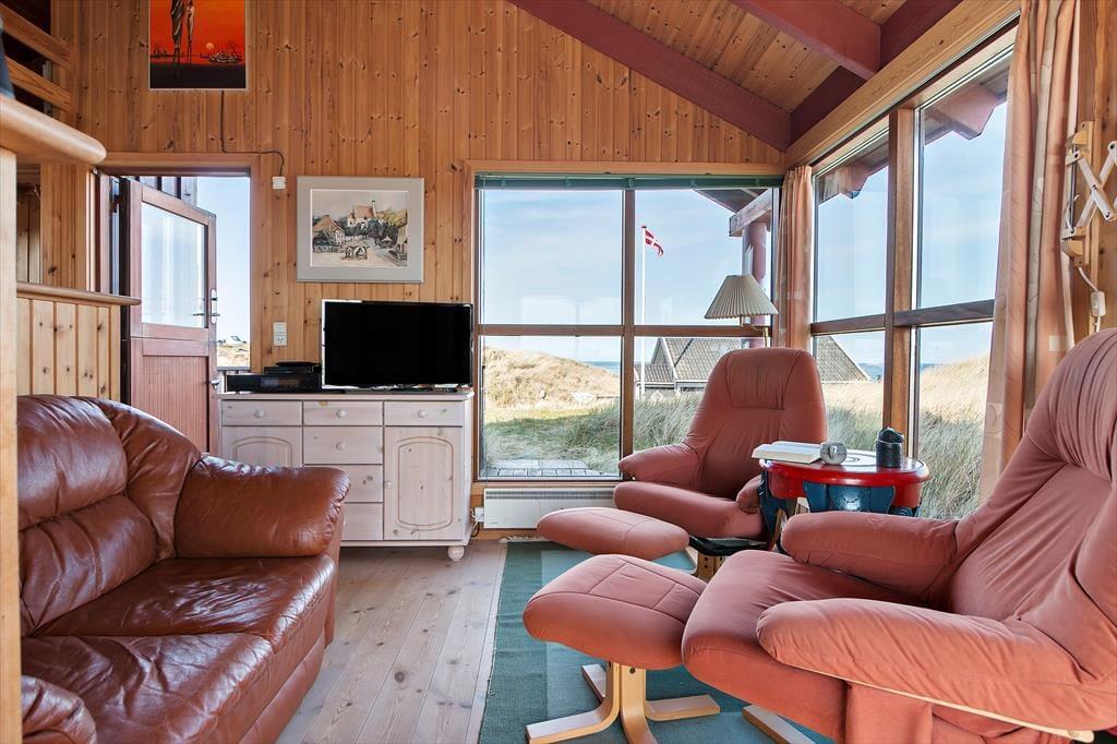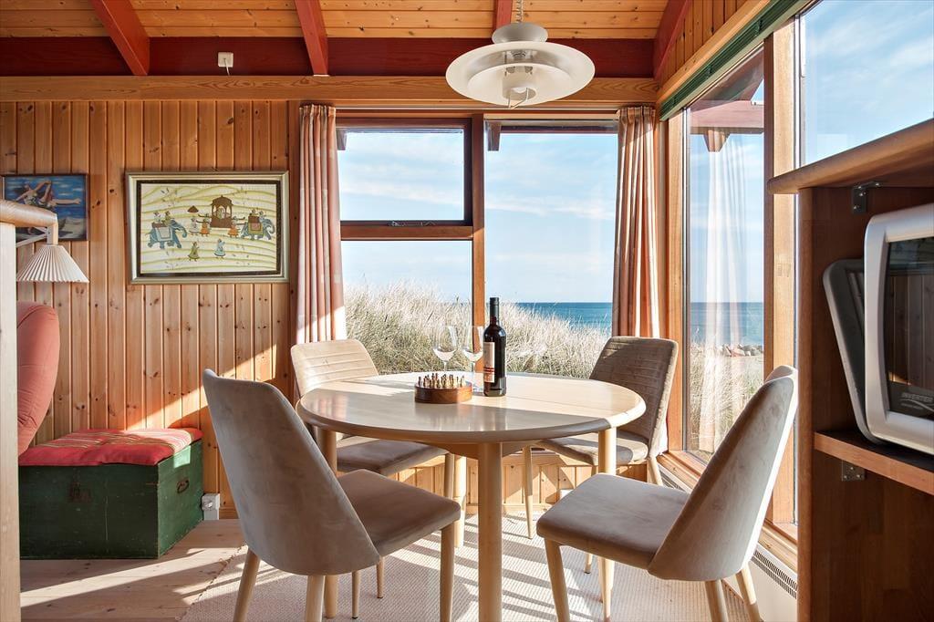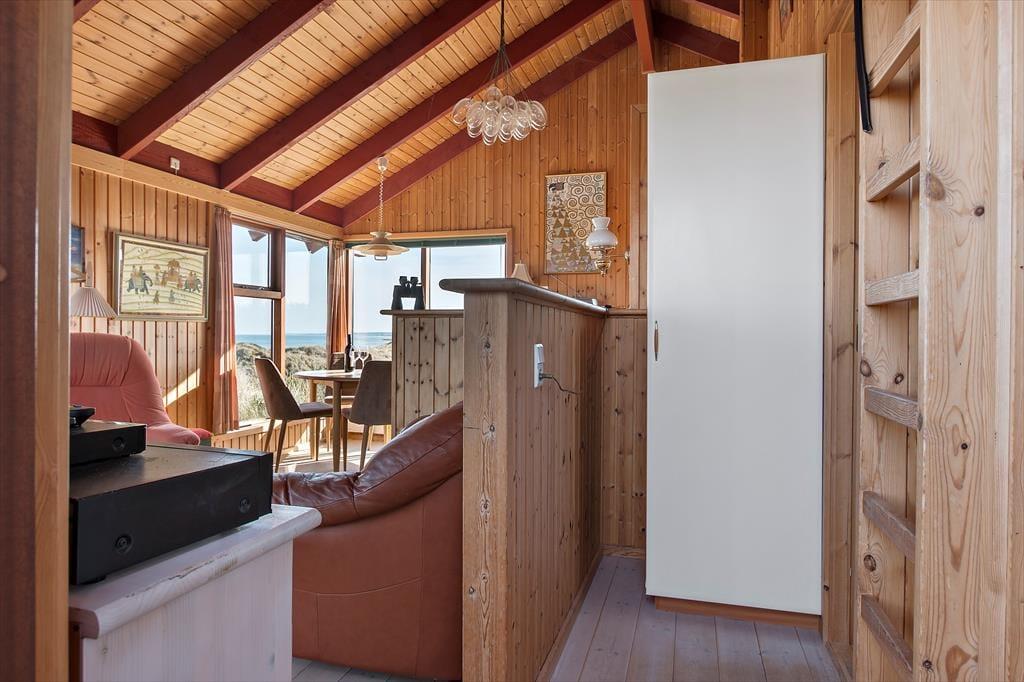 Innen erwartet Sie eine einfache, ältere Einrichtung mit Holzverkleidung und klassischer dänischer Ferienhausstimmung. Große Fenster lassen Licht und Natur ins Haus. Es gibt ein Wohnzimmer in offener Verbindung mit der Küche sowie ein Badezimmer mit Dusche – ideal für ein Paar, das einen entspannten Urlaub inmitten der Natur verbringen möchte.