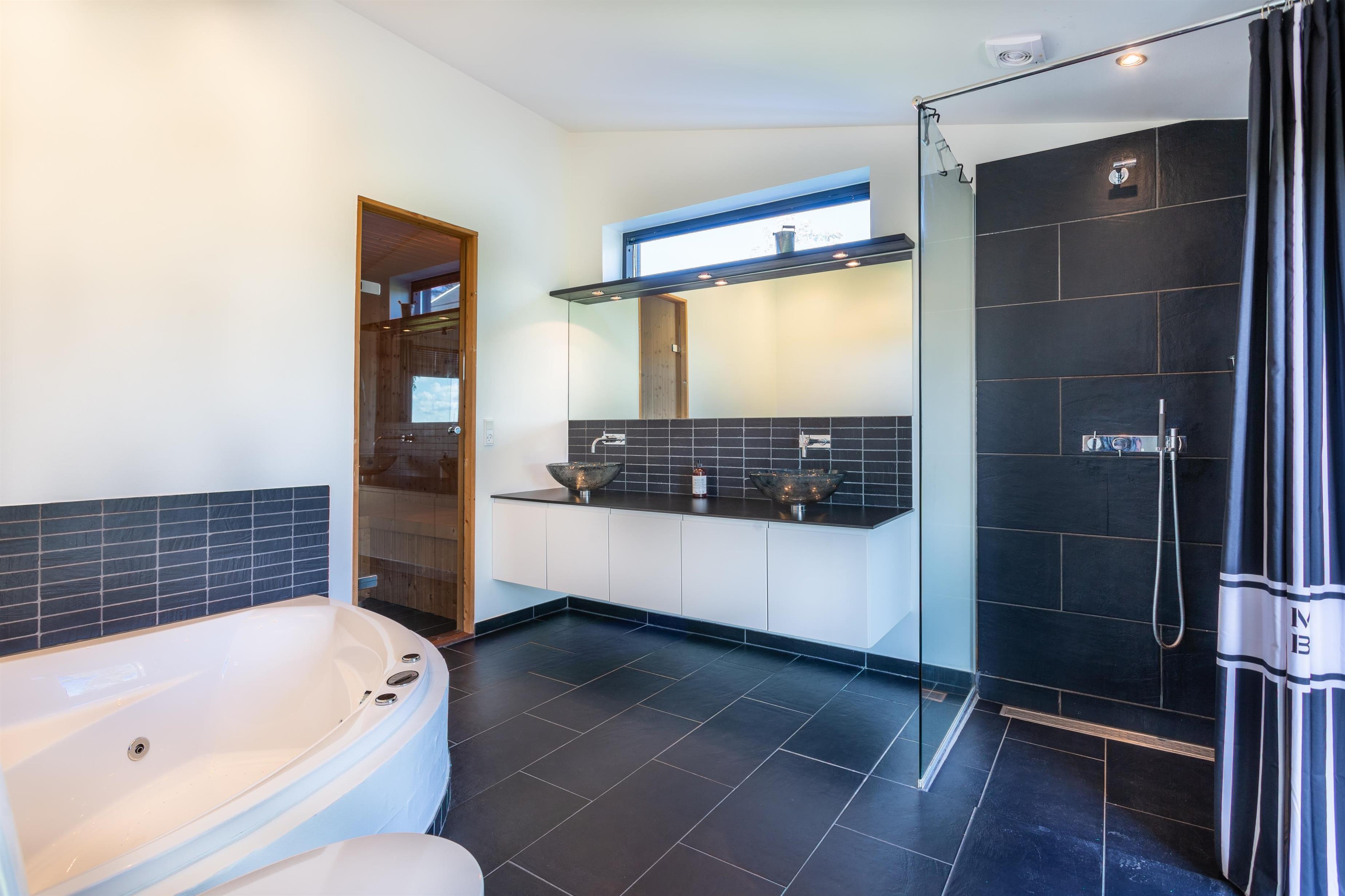 Der großzügige Küchen-Essbereich ist das Herz des Hauses und lädt zu gemütlichen Momenten mit der Familie ein. Hier haben Sie reichlich Gelegenheit, köstliche Mahlzeiten in der gut ausgestatteten Küche zuzubereiten und sie am Esstisch zu genießen oder eine Tasse Kaffee auf dem bequemen Sofa mit Blick auf die Natur und die Umgebung zu trinken. Vom Küchen- und Wohnzimmer aus haben Sie direkten Zugang zu den schönen Holzterrassen, auf denen Sie Ihren Morgenkaffee oder einen warmen Sommerabend unter freiem Himmel genießen können.