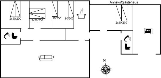 In dem landschaftlich schönen Feriengebiet Lakolk, nicht weit von der Nordsee und dem breiten Sandstrand entfernt, liegt dieses gemütlich eingerichtete Ferienhaus. Zum Haus gehört ein Gästehaus, das mit einem der insgesamt drei Schlafzimmern sowie einem zusätzlichen Badezimmer eingerichtet ist – beide mit eigenem Eingang (siehe Grundriss).