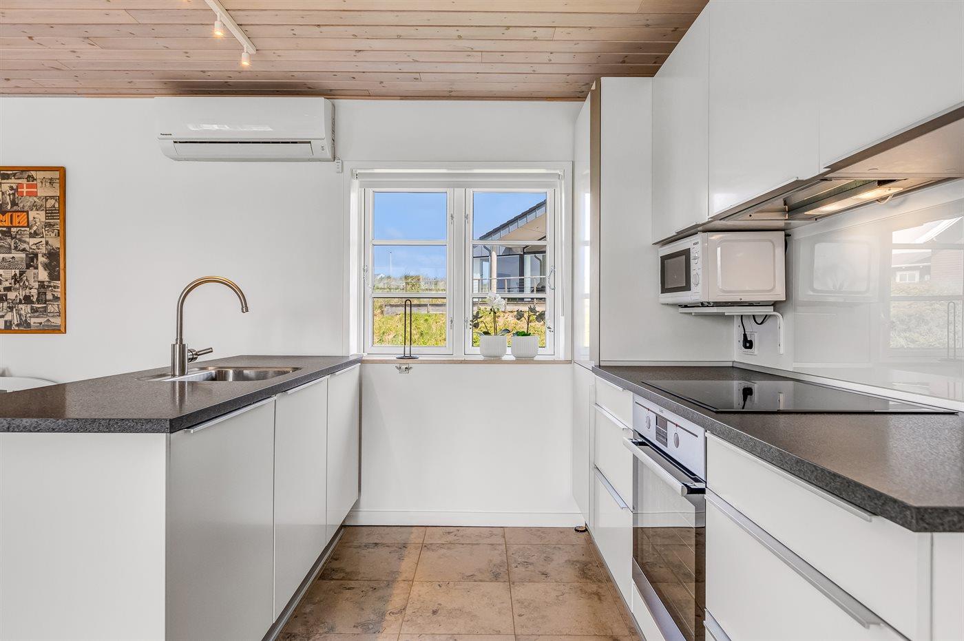 Die Küche ist mit Kühlschrank ausgestattet. Außerdem gibt es 4 Induktions-Kochzonen, Umluftofen, Mikrowelle, Airfryer sowie Geschirrspüler.