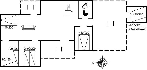 Die Ferienunterkunft liegt auf einem 880 m² großen Naturgrundstück. Die Entfernung zum Meer beträgt 450 m.Die Entfernung zum Wattenmeer beträgt 3800 m. Die nächste Einkaufsmöglichkeit liegt 700 m entfernt. Es steht ein 60 m² Terrassenareal zur Verfügung. Parkplatz auf dem Grundstück.