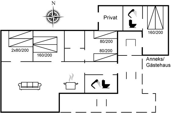 In der Ferienunterkunft gibt es 1 Fernseher mit Smart-TV. Radio. 1-3 dänische Fernsehsender. Mindestens 4 deutsche Fernsehsender. Es steht kabellose Internetverbindung zur Verfügung.