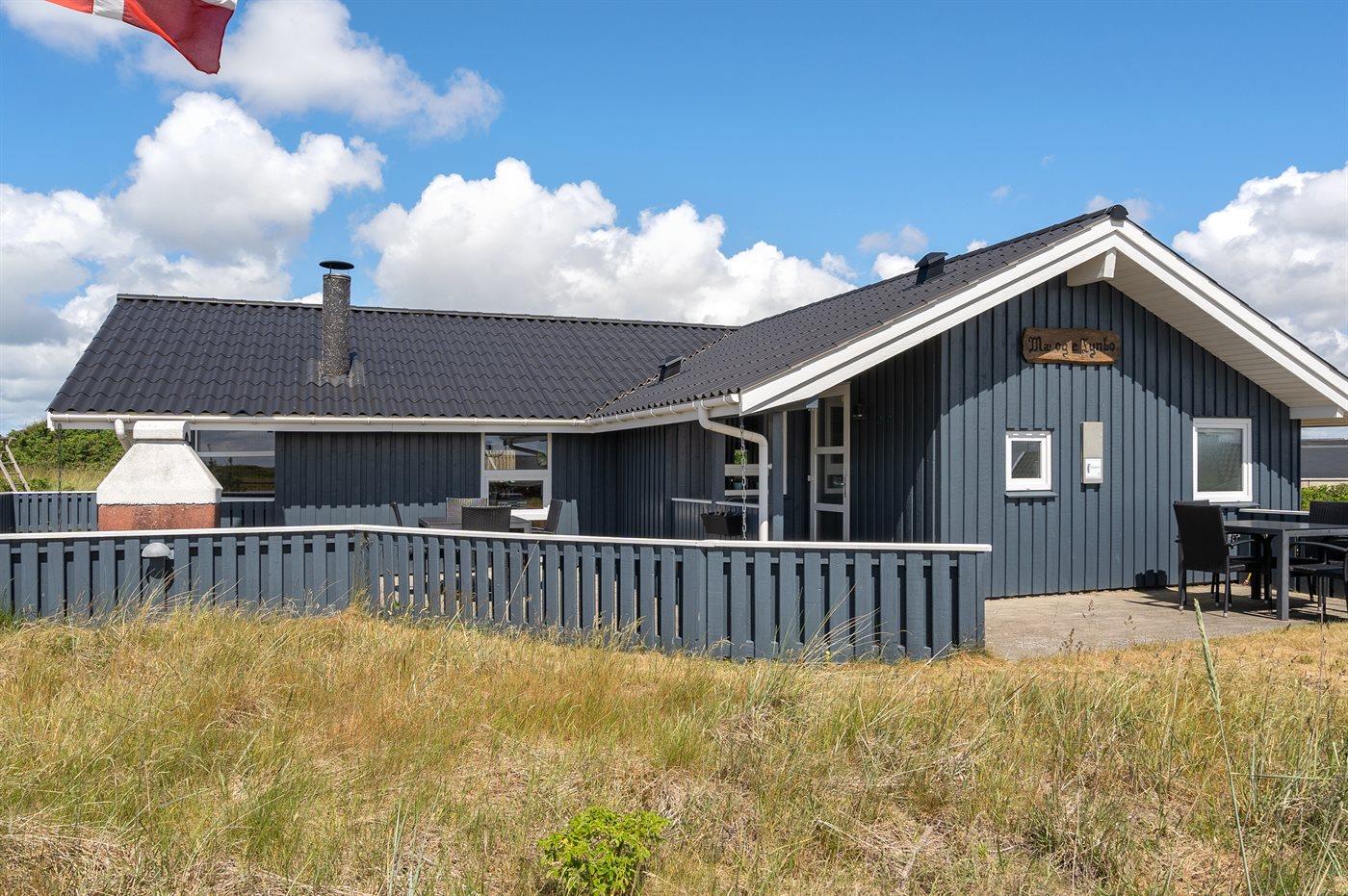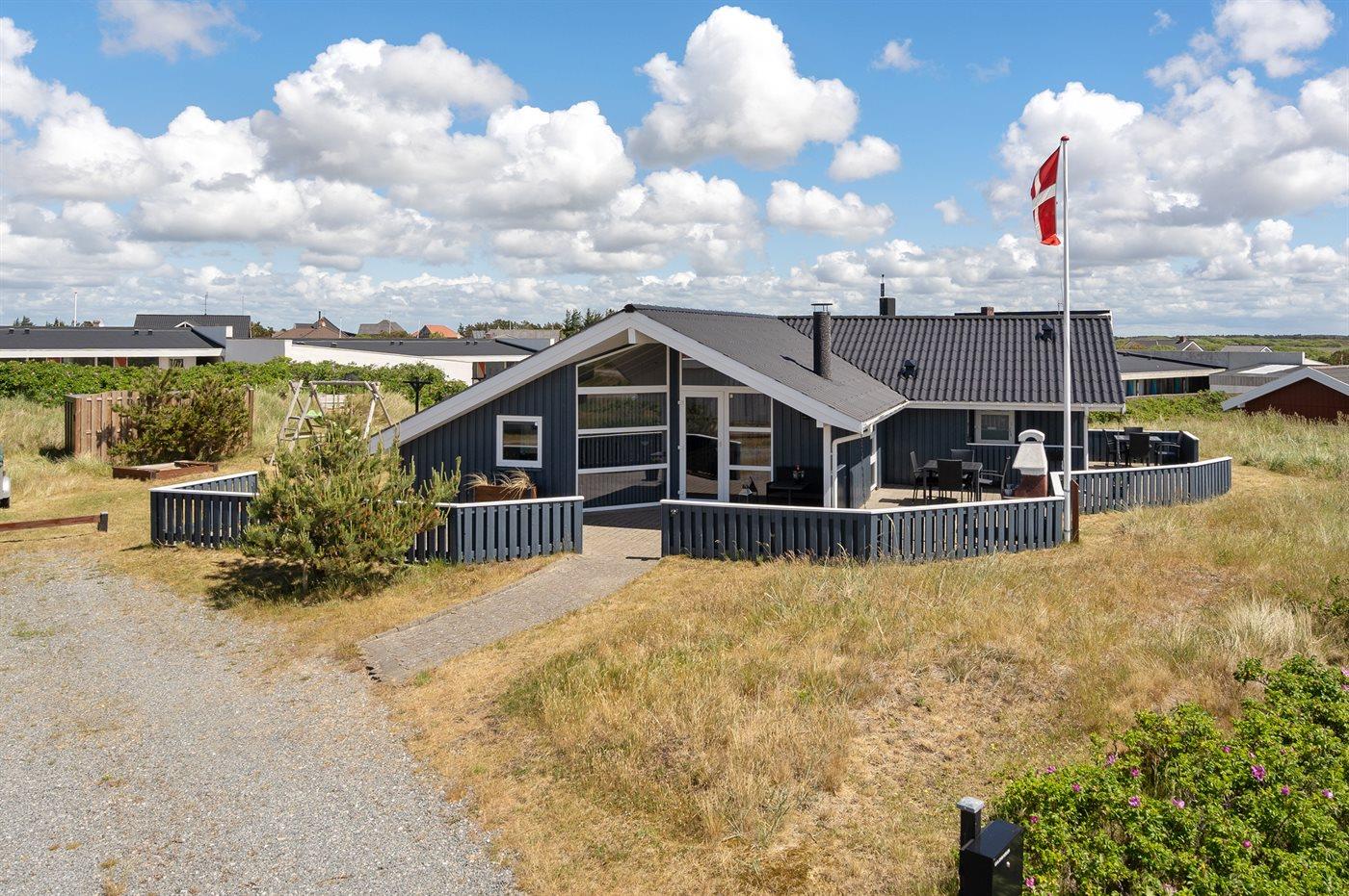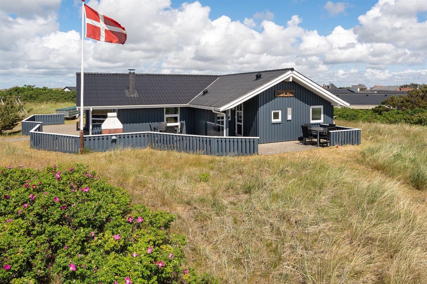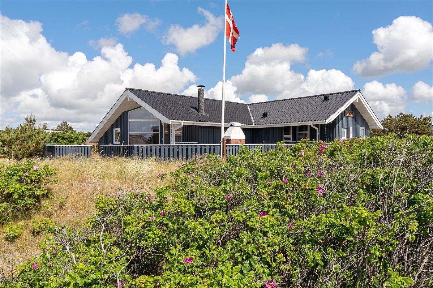 Auf einem Naturgrundstück nur 400 m vom Strand entfernt liegt dieses schöne Ferienhaus aus Holz, 2000 gebaut und2020 letztens renoviert. Zum Haus gehört ein großes, sowohl offenes als auch überdachtes Terrassenareal mit Gartenmöbeln und großem Steinkamin/-Grill - hier können Sie u. a. die Morgensonne genießen. Badezimmer mit 2-Pers.-Whirlpool, Dusche, Fußbodenheizung, Waschmaschine, Wäschetrockner sowie direktem Zugang zur Sauna. Gästetoilette mit Fußbodenheizung. Die gut ausgestattete Küche mit beheizbarem Boden liegt in Verbindung mit dem Wohnzimmer, und ist mit u. a. Tiefkühlgerät, Mikrowelle und Geschirrspüler ausgestattet. Großes, schönes Ess- und Wohnzimmer mit u. a. Kaminofen, Kabel-TV, DVD-Spieler, Stereoanlage mit CD-Spieler sowie Alkoven mit 2 Schlafplätzen. Vom Esszimmer aus hat man eine schöne Aussicht über die Dünen. Die letzten 6 Schlafplätze verteilen sich auf 3 Zimmer; 2 mit Doppelbett und 1 mit 2 Einzelbetten. An weiterer Ausstattung kann kostenlose, kabellose Internetverbindung (Computer ist mitzubringen) erwähnt werden und es ist eine energiegerechte Wärmepumpe installiert. Für die kleinen Feriengäste stehen Schaukel und Sandkasten bereit auf dem Grundstück. Das Haus liegt nur wenige Minuten zu Fuß vom Strand entfernt.