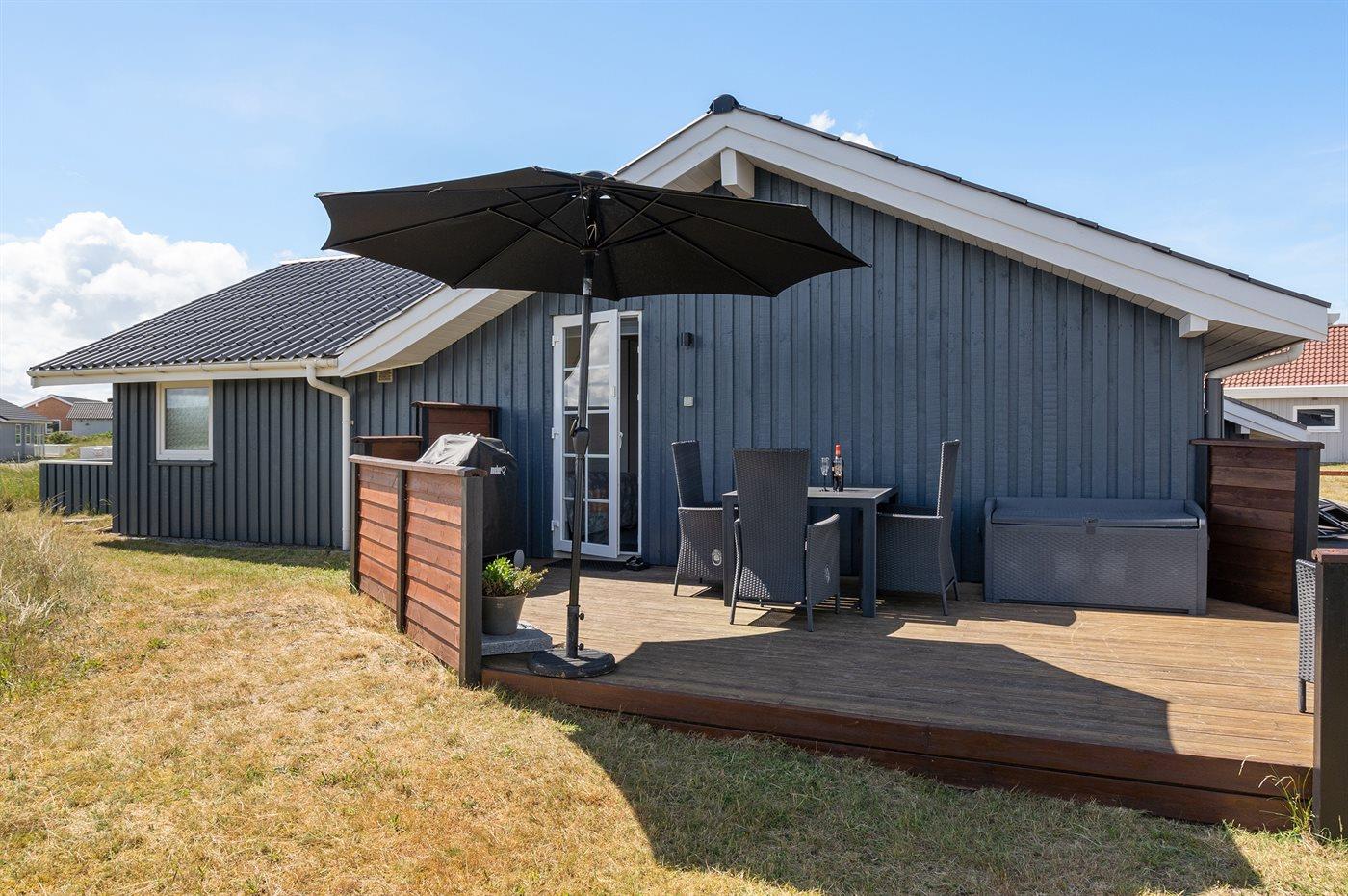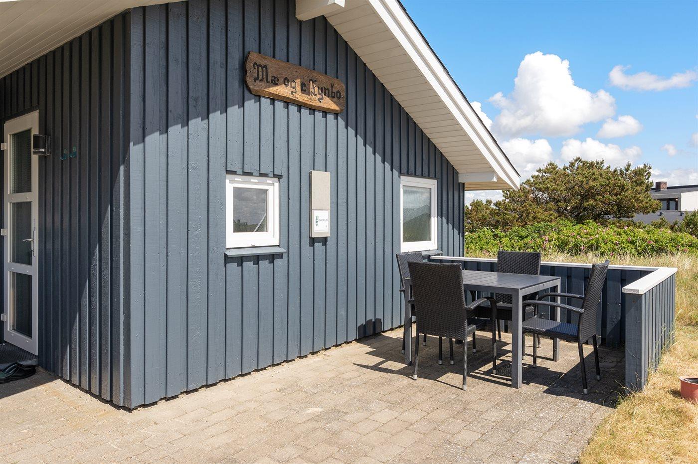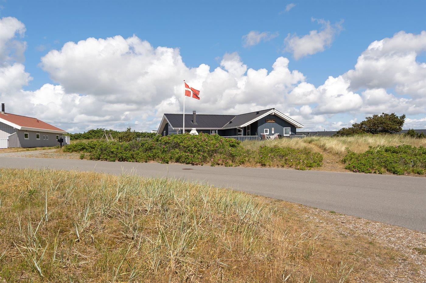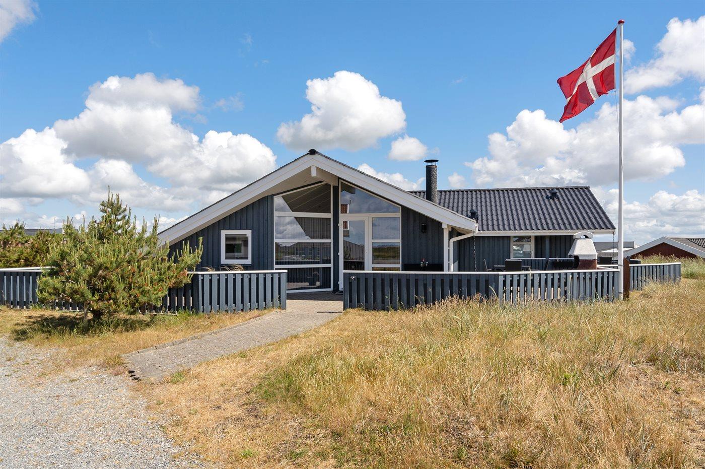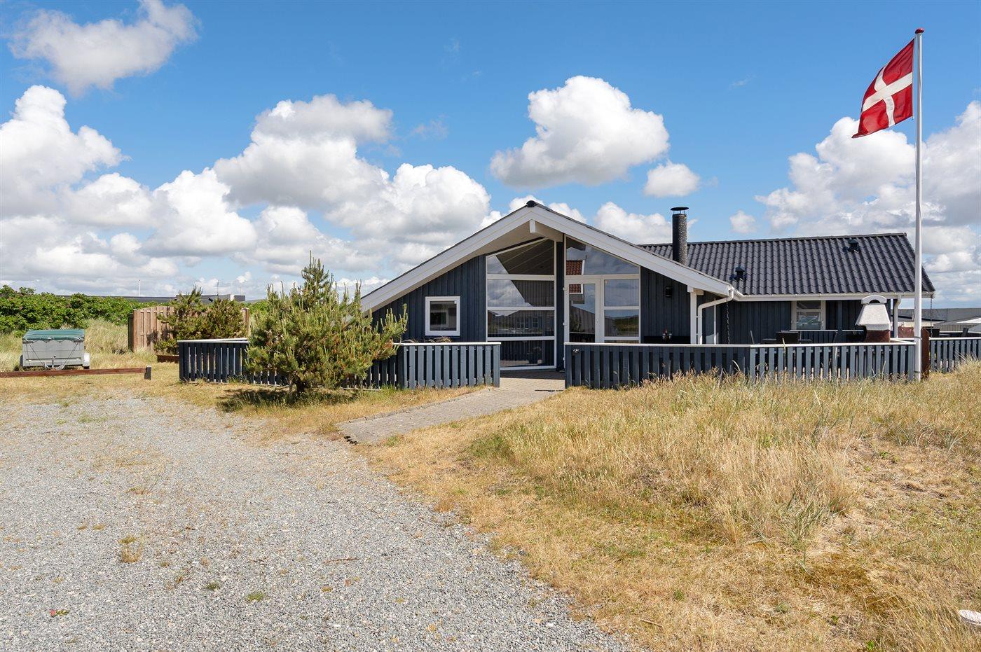 Auf einem Naturgrundstück nur 400 m vom Strand entfernt liegt dieses schöne Ferienhaus aus Holz, 2000 gebaut und2020 letztens renoviert. Zum Haus gehört ein großes, sowohl offenes als auch überdachtes Terrassenareal mit Gartenmöbeln und großem Steinkamin/-Grill - hier können Sie u. a. die Morgensonne genießen. Badezimmer mit 2-Pers.-Whirlpool, Dusche, Fußbodenheizung, Waschmaschine, Wäschetrockner sowie direktem Zugang zur Sauna. Gästetoilette mit Fußbodenheizung. Die gut ausgestattete Küche mit beheizbarem Boden liegt in Verbindung mit dem Wohnzimmer, und ist mit u. a. Tiefkühlgerät, Mikrowelle und Geschirrspüler ausgestattet. Großes, schönes Ess- und Wohnzimmer mit u. a. Kaminofen, Kabel-TV, DVD-Spieler, Stereoanlage mit CD-Spieler sowie Alkoven mit 2 Schlafplätzen. Vom Esszimmer aus hat man eine schöne Aussicht über die Dünen. Die letzten 6 Schlafplätze verteilen sich auf 3 Zimmer; 2 mit Doppelbett und 1 mit 2 Einzelbetten. An weiterer Ausstattung kann kostenlose, kabellose Internetverbindung (Computer ist mitzubringen) erwähnt werden und es ist eine energiegerechte Wärmepumpe installiert. Für die kleinen Feriengäste stehen Schaukel und Sandkasten bereit auf dem Grundstück. Das Haus liegt nur wenige Minuten zu Fuß vom Strand entfernt.