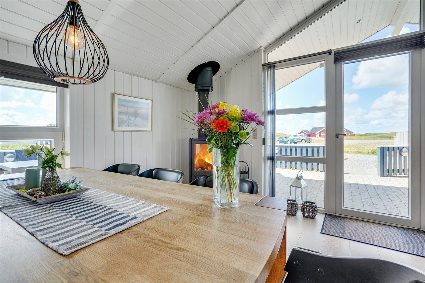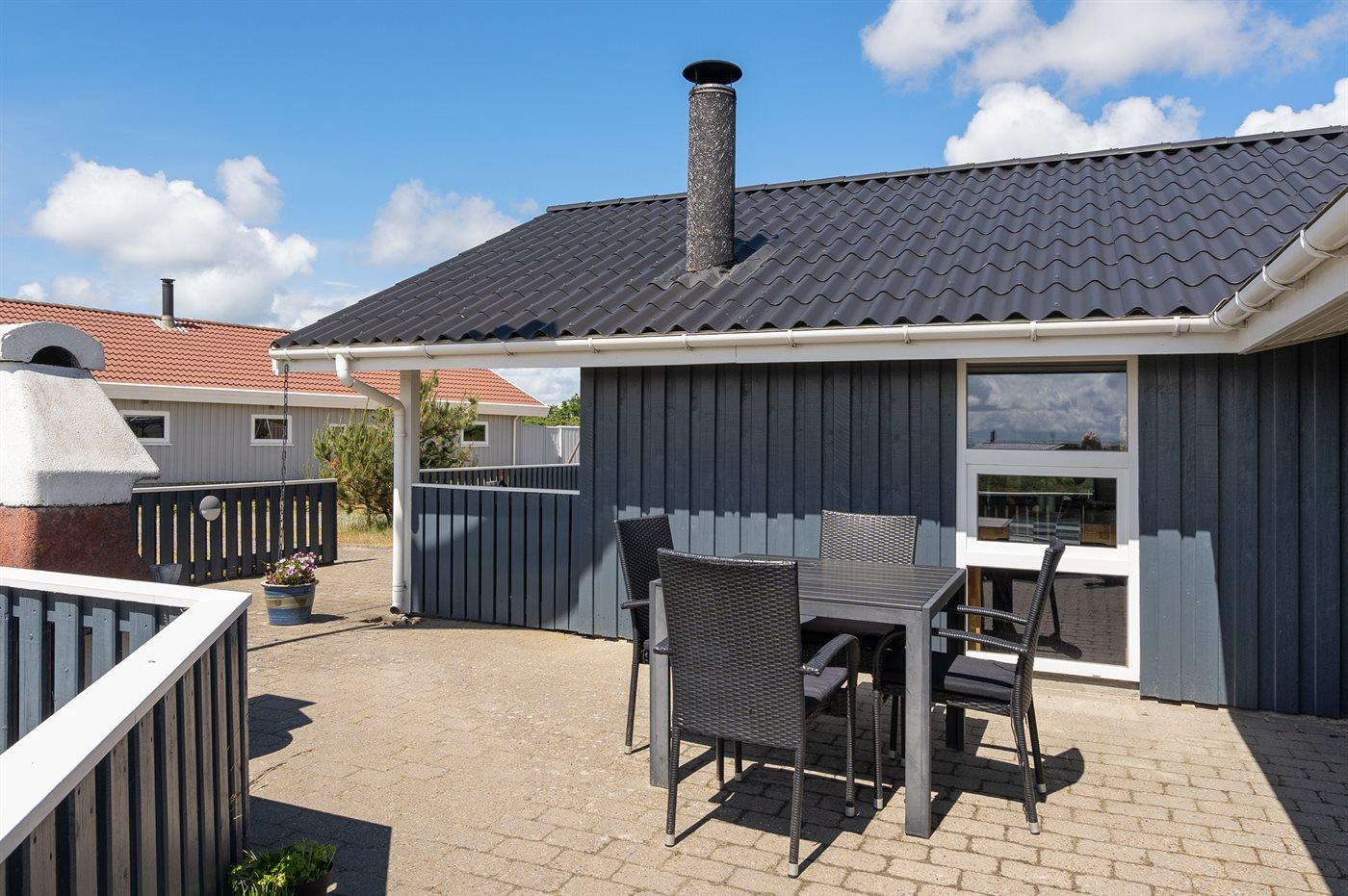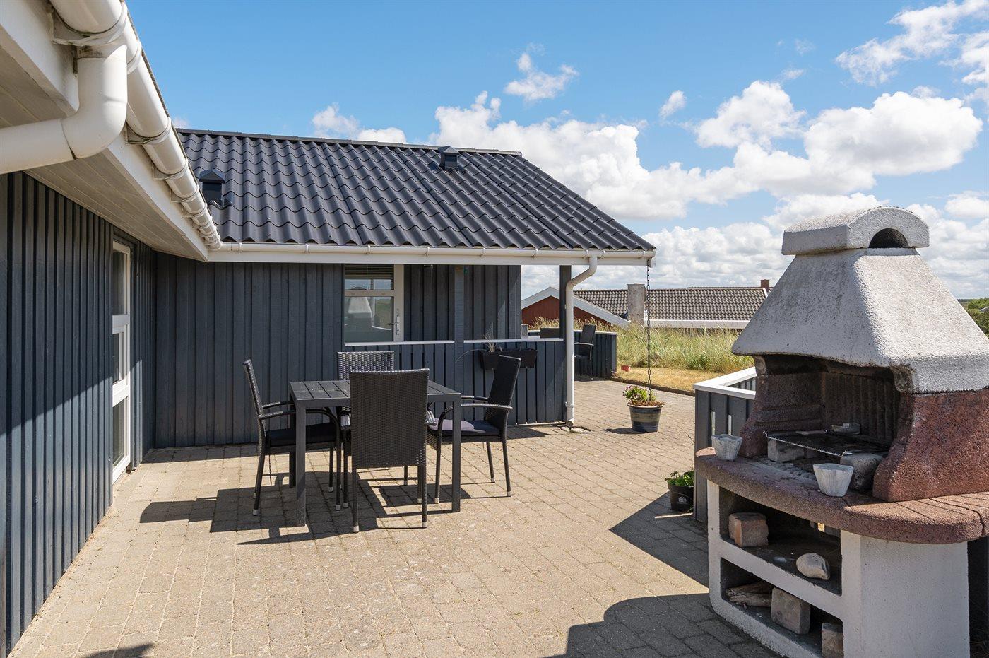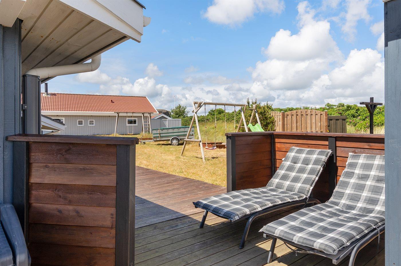 Auf einem Naturgrundstück nur 400 m vom Strand entfernt liegt dieses schöne Ferienhaus aus Holz, 2000 gebaut und2020 letztens renoviert. Zum Haus gehört ein großes, sowohl offenes als auch überdachtes Terrassenareal mit Gartenmöbeln und großem Steinkamin/-Grill - hier können Sie u. a. die Morgensonne genießen. Badezimmer mit 2-Pers.-Whirlpool, Dusche, Fußbodenheizung, Waschmaschine, Wäschetrockner sowie direktem Zugang zur Sauna. Gästetoilette mit Fußbodenheizung. Die gut ausgestattete Küche mit beheizbarem Boden liegt in Verbindung mit dem Wohnzimmer, und ist mit u. a. Tiefkühlgerät, Mikrowelle und Geschirrspüler ausgestattet. Großes, schönes Ess- und Wohnzimmer mit u. a. Kaminofen, Kabel-TV, DVD-Spieler, Stereoanlage mit CD-Spieler sowie Alkoven mit 2 Schlafplätzen. Vom Esszimmer aus hat man eine schöne Aussicht über die Dünen. Die letzten 6 Schlafplätze verteilen sich auf 3 Zimmer; 2 mit Doppelbett und 1 mit 2 Einzelbetten. An weiterer Ausstattung kann kostenlose, kabellose Internetverbindung (Computer ist mitzubringen) erwähnt werden und es ist eine energiegerechte Wärmepumpe installiert. Für die kleinen Feriengäste stehen Schaukel und Sandkasten bereit auf dem Grundstück. Das Haus liegt nur wenige Minuten zu Fuß vom Strand entfernt.