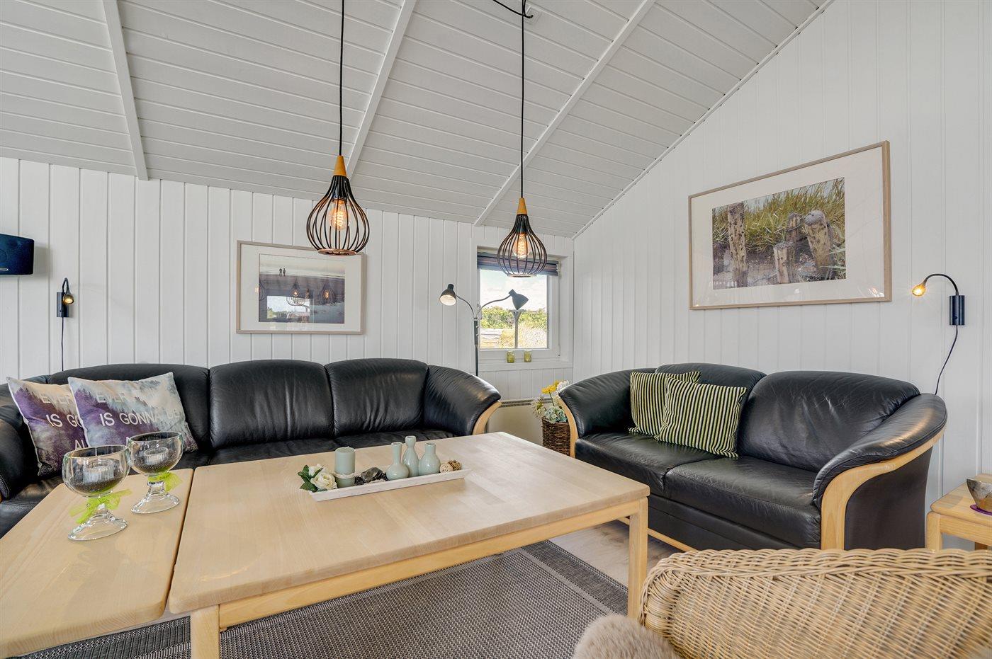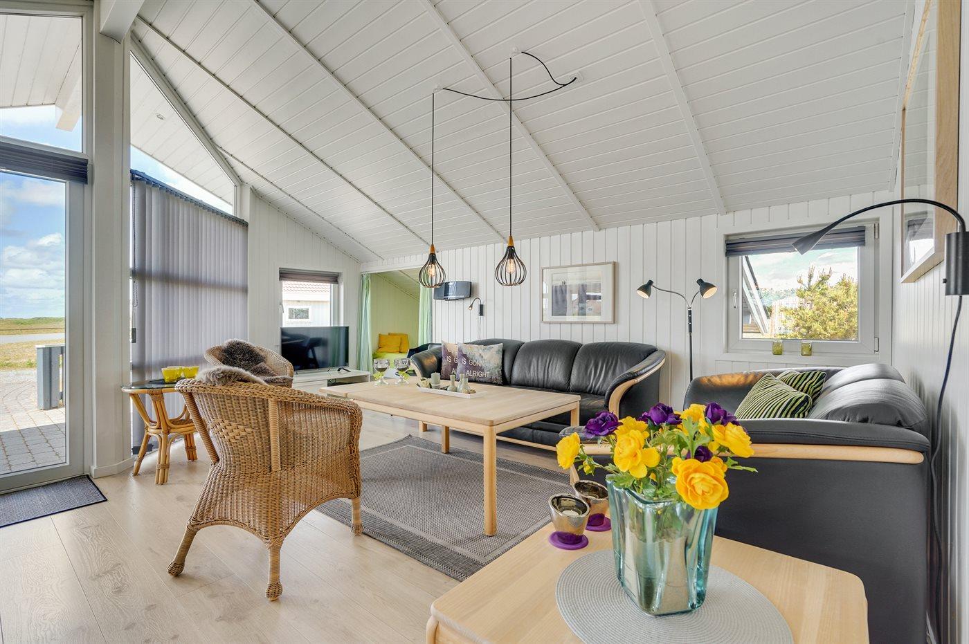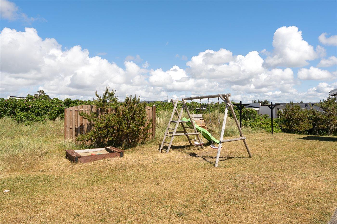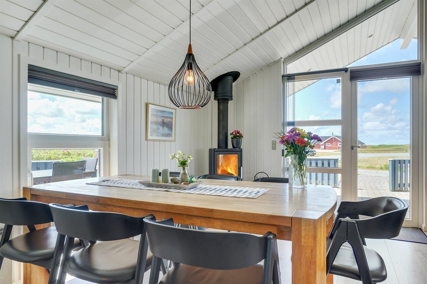 Auf einem Naturgrundstück nur 400 m vom Strand entfernt liegt dieses schöne Ferienhaus aus Holz, 2000 gebaut und2020 letztens renoviert. Zum Haus gehört ein großes, sowohl offenes als auch überdachtes Terrassenareal mit Gartenmöbeln und großem Steinkamin/-Grill - hier können Sie u. a. die Morgensonne genießen. Badezimmer mit 2-Pers.-Whirlpool, Dusche, Fußbodenheizung, Waschmaschine, Wäschetrockner sowie direktem Zugang zur Sauna. Gästetoilette mit Fußbodenheizung. Die gut ausgestattete Küche mit beheizbarem Boden liegt in Verbindung mit dem Wohnzimmer, und ist mit u. a. Tiefkühlgerät, Mikrowelle und Geschirrspüler ausgestattet. Großes, schönes Ess- und Wohnzimmer mit u. a. Kaminofen, Kabel-TV, DVD-Spieler, Stereoanlage mit CD-Spieler sowie Alkoven mit 2 Schlafplätzen. Vom Esszimmer aus hat man eine schöne Aussicht über die Dünen. Die letzten 6 Schlafplätze verteilen sich auf 3 Zimmer; 2 mit Doppelbett und 1 mit 2 Einzelbetten. An weiterer Ausstattung kann kostenlose, kabellose Internetverbindung (Computer ist mitzubringen) erwähnt werden und es ist eine energiegerechte Wärmepumpe installiert. Für die kleinen Feriengäste stehen Schaukel und Sandkasten bereit auf dem Grundstück. Das Haus liegt nur wenige Minuten zu Fuß vom Strand entfernt.