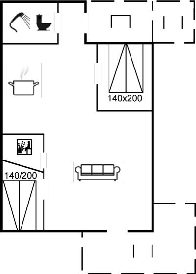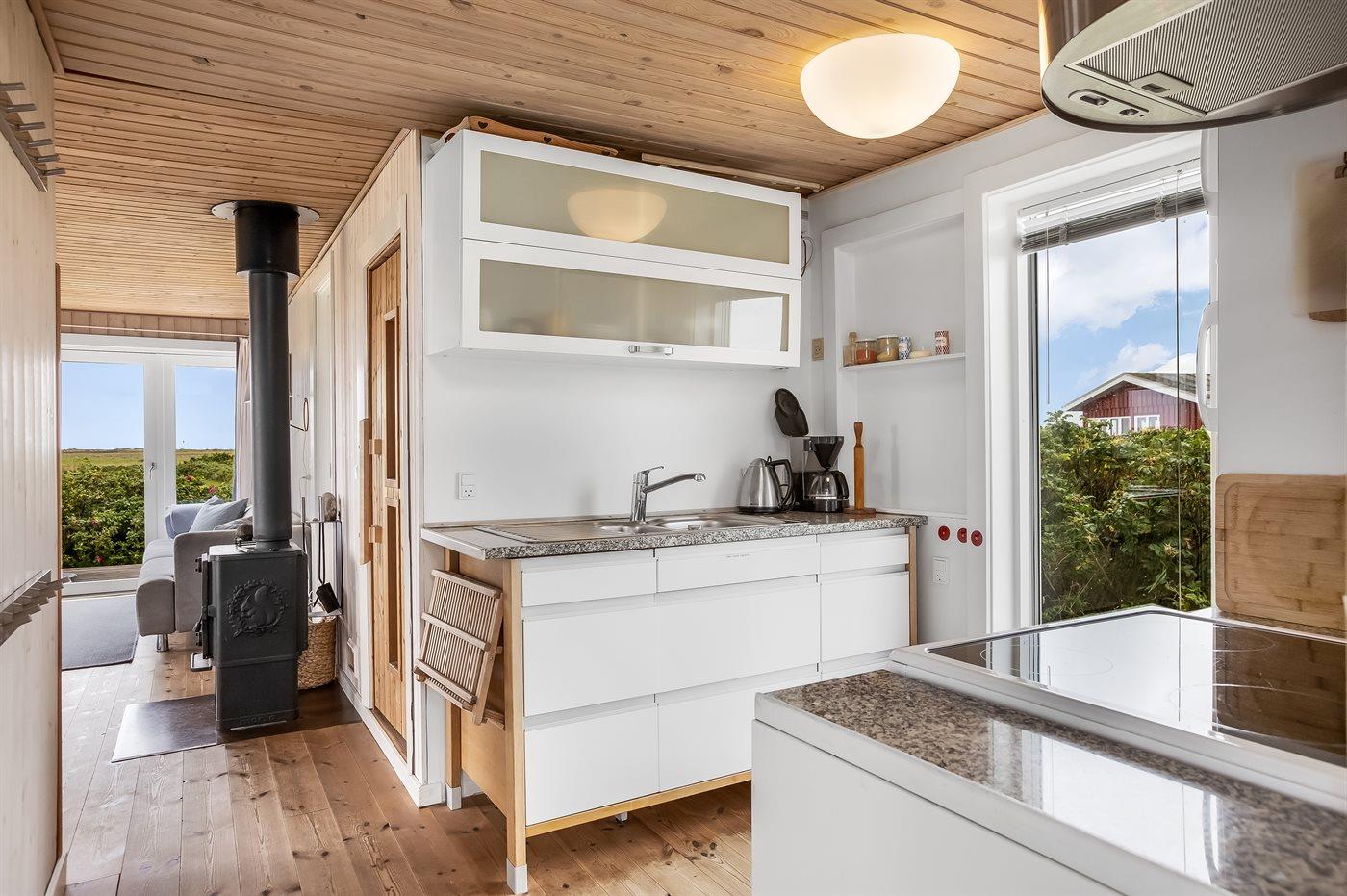 Es ist eine Badezimmer mit Dusche, Fußbodenheizung, Waschmaschine und Wäschetrockner. Sauna. Die Küche mit u. a. Tiefkühlgerät liegt in Verbindung mit dem Wohnzimmer, das mit u. a. Flatscreen-TV mit Satellitenanschluss (mit separater Bedienung des Satellitenanschlusses im Schlafzimmer), Kaminofen, DVD-Spieler und Bluetooth-Lautsprecher (Sonos) ausgestattet ist.