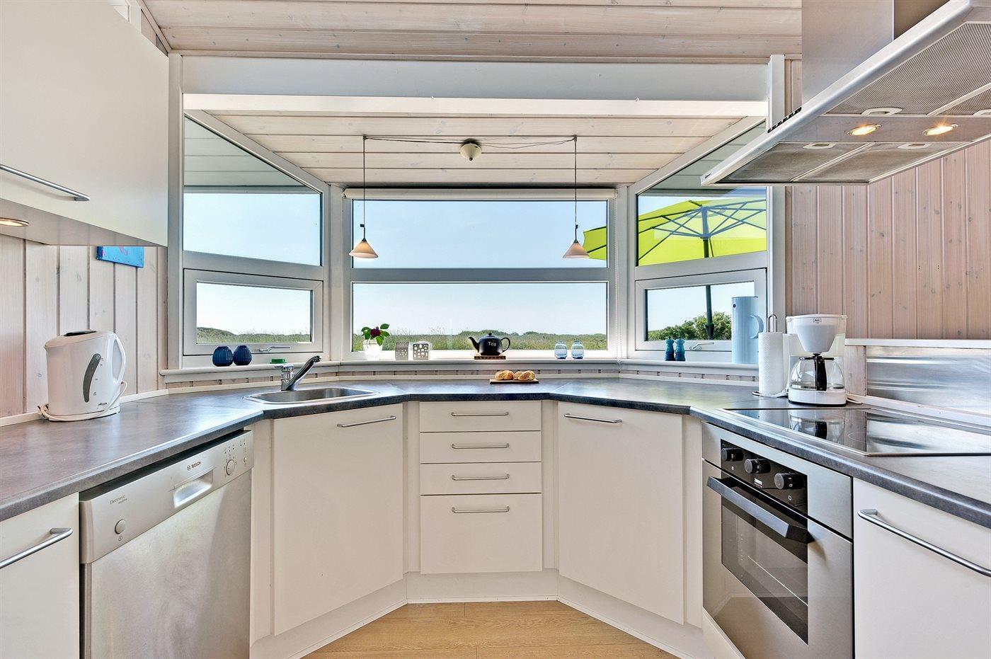 Die Küche ist mit Kühlschrank ausgestattet. Außerdem gibt es 4 elektrische Kochplatten, Backofen, Mikrowelle sowie Geschirrspüler.