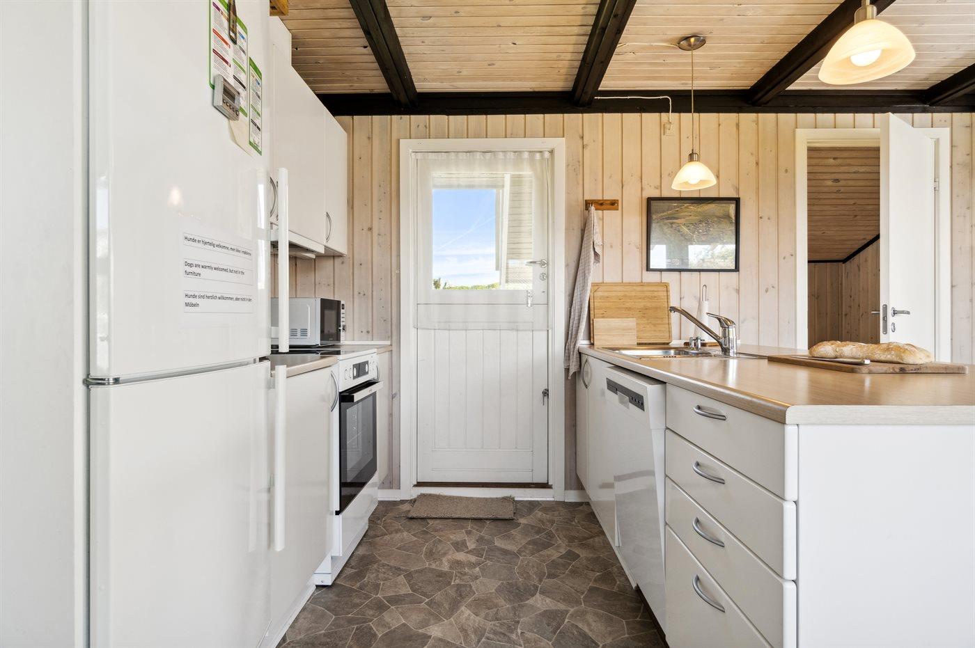 Die Küche ist mit Kühlschrank ausgestattet. Außerdem gibt es 4 Keramik-Kochfelder, Umluftofen, Mikrowelle sowie Geschirrspüler.