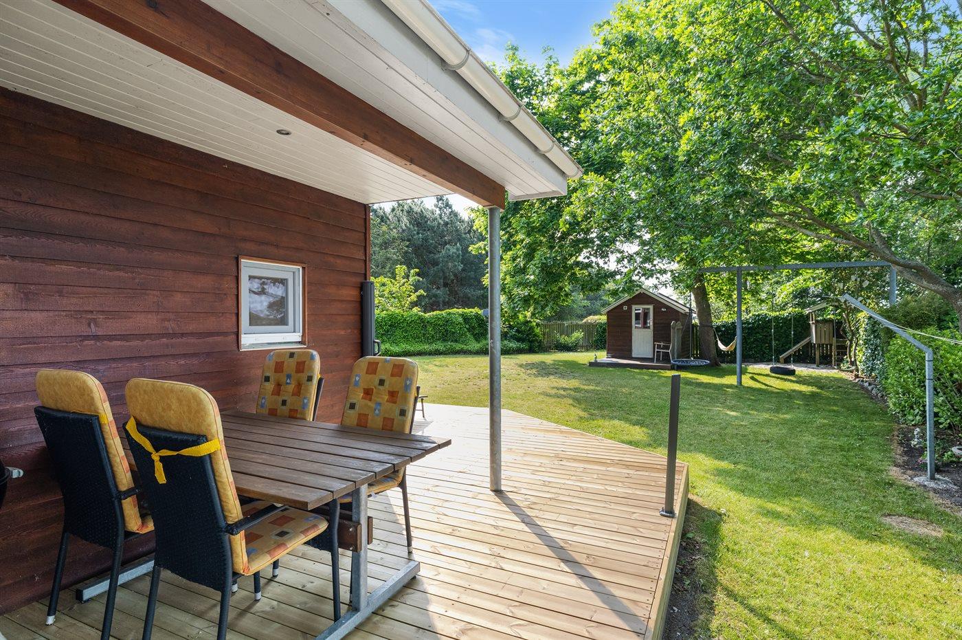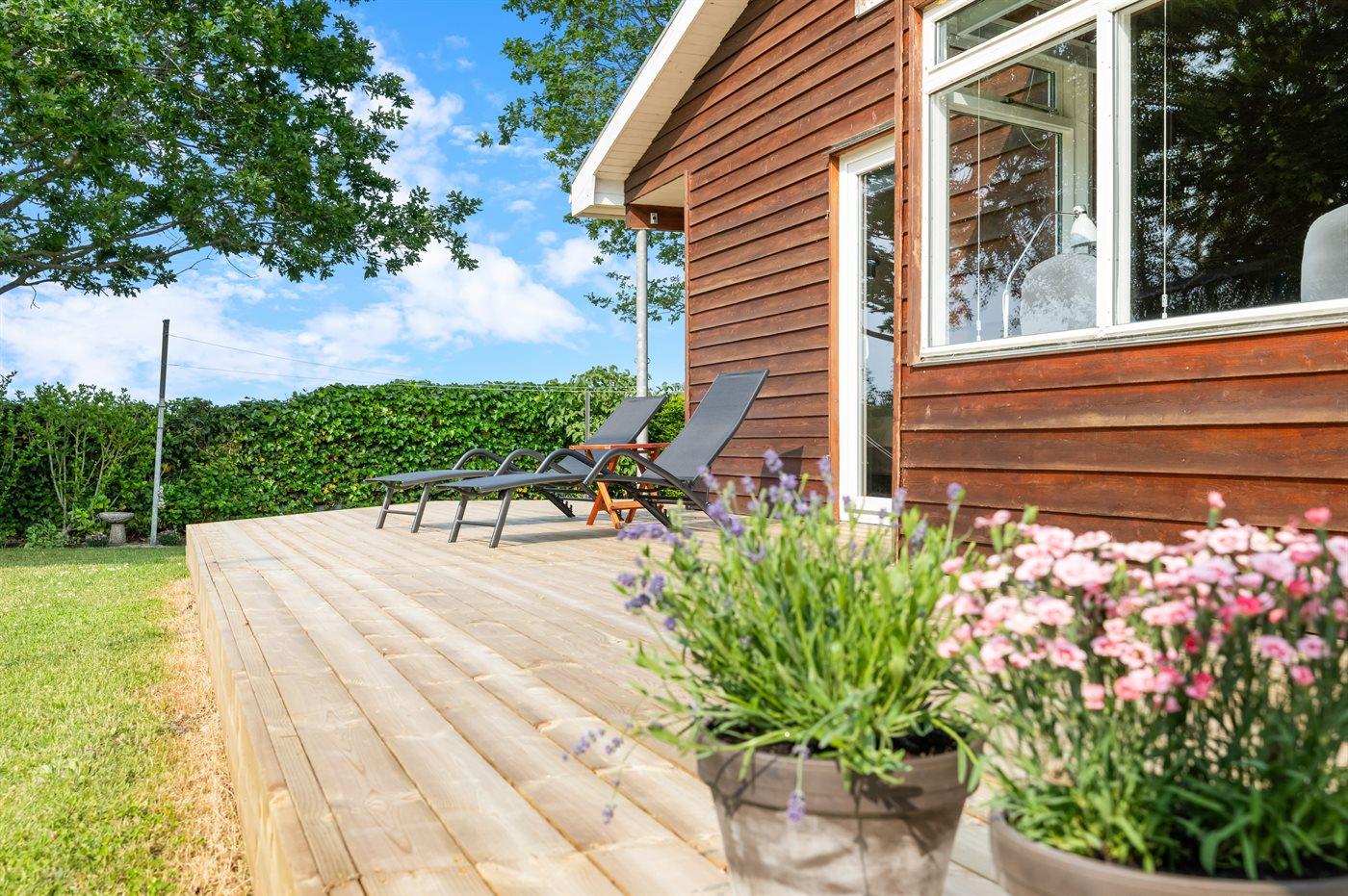 Zum Haus gehört ein neu angelegter Terrassenbereich, von dem ein Teil überdacht ist. Das gesamte Grundstück ist eingezäunt – ideal, wenn du mit dem Hund oder kleinen Kindern in den Urlaub fährst.