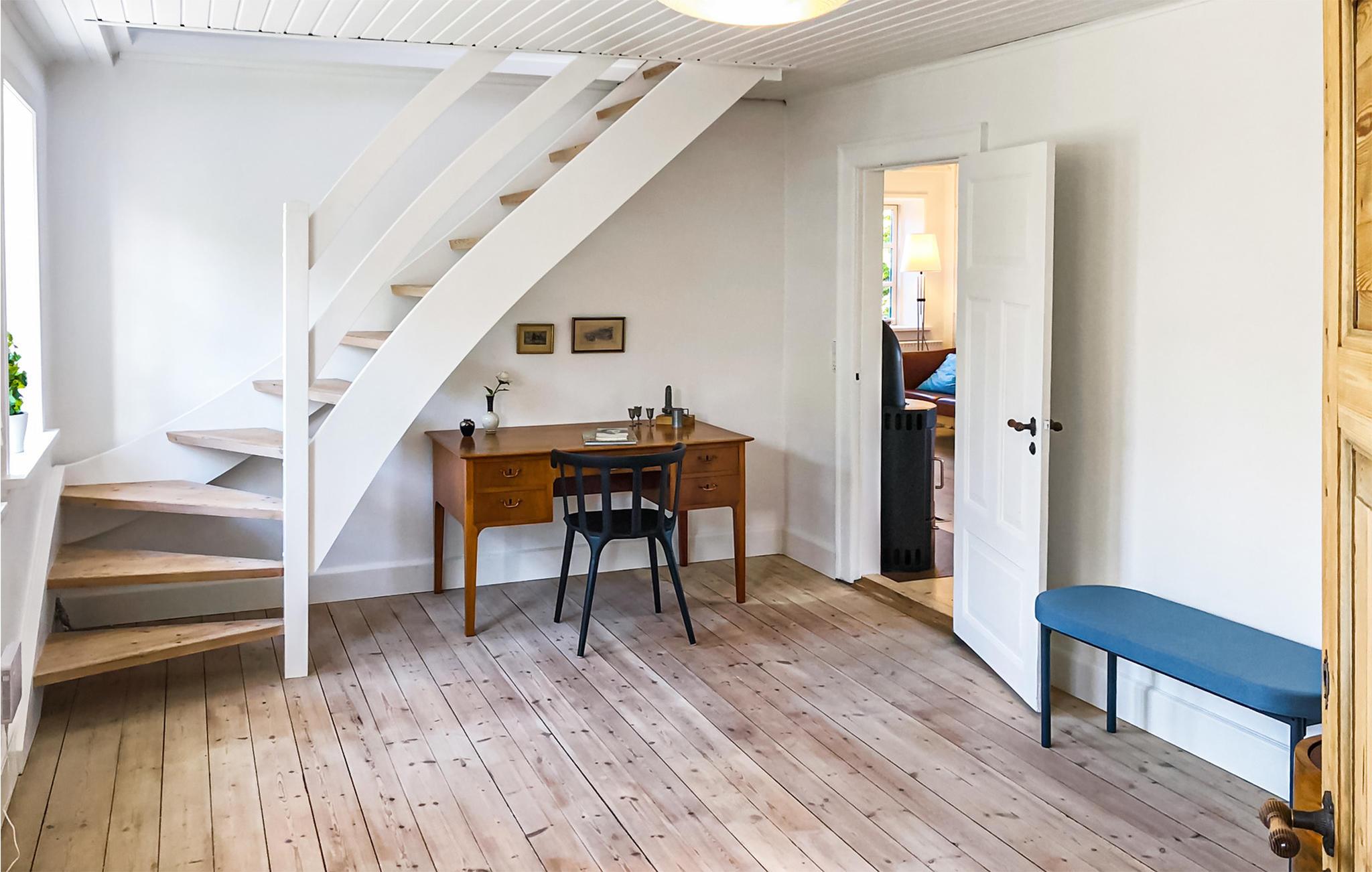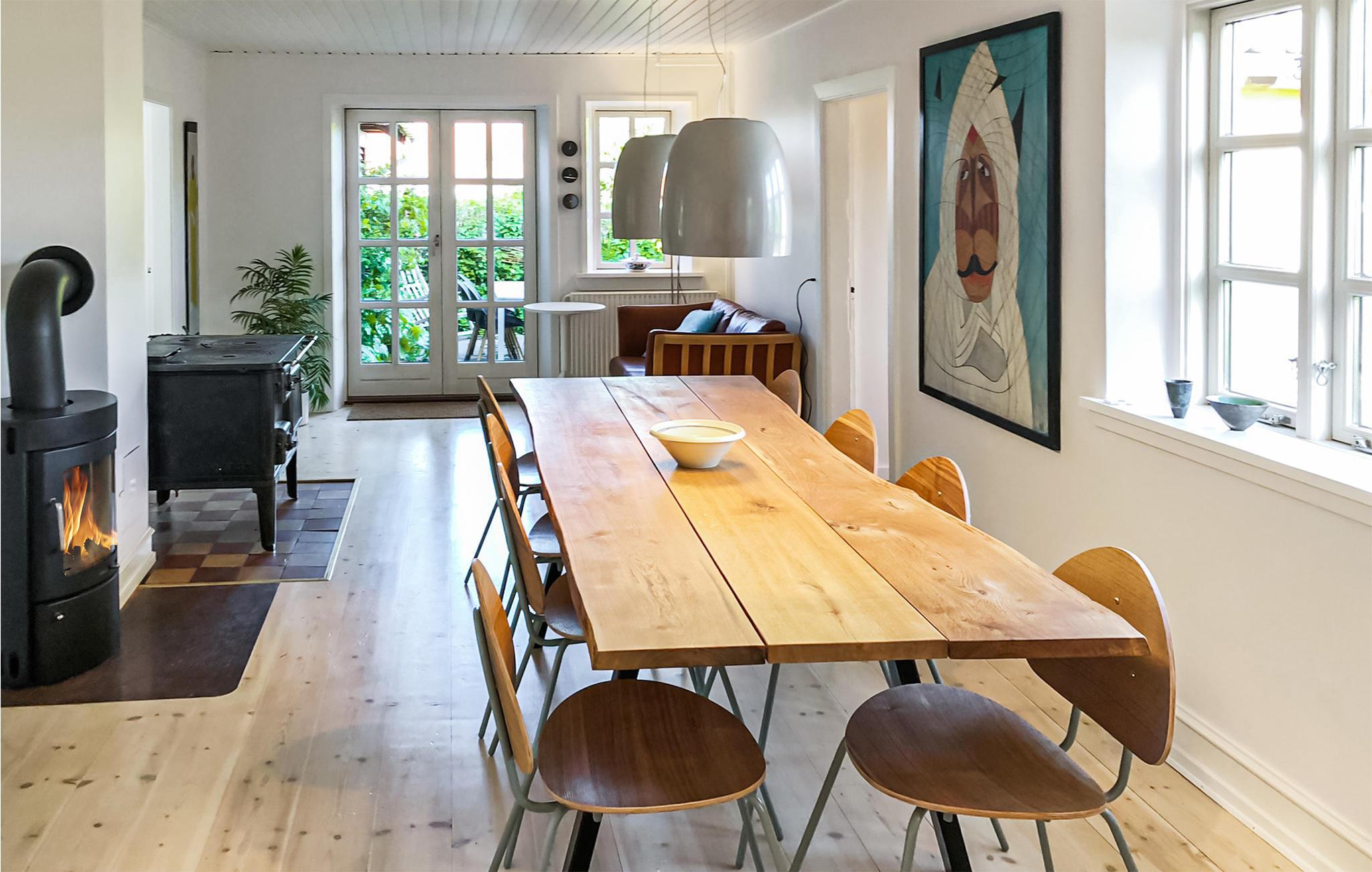 Modernes Ferienhaus mit Meerblick und Kaminofen auf Samsø, ideal für Familien und Ruhe suchende.