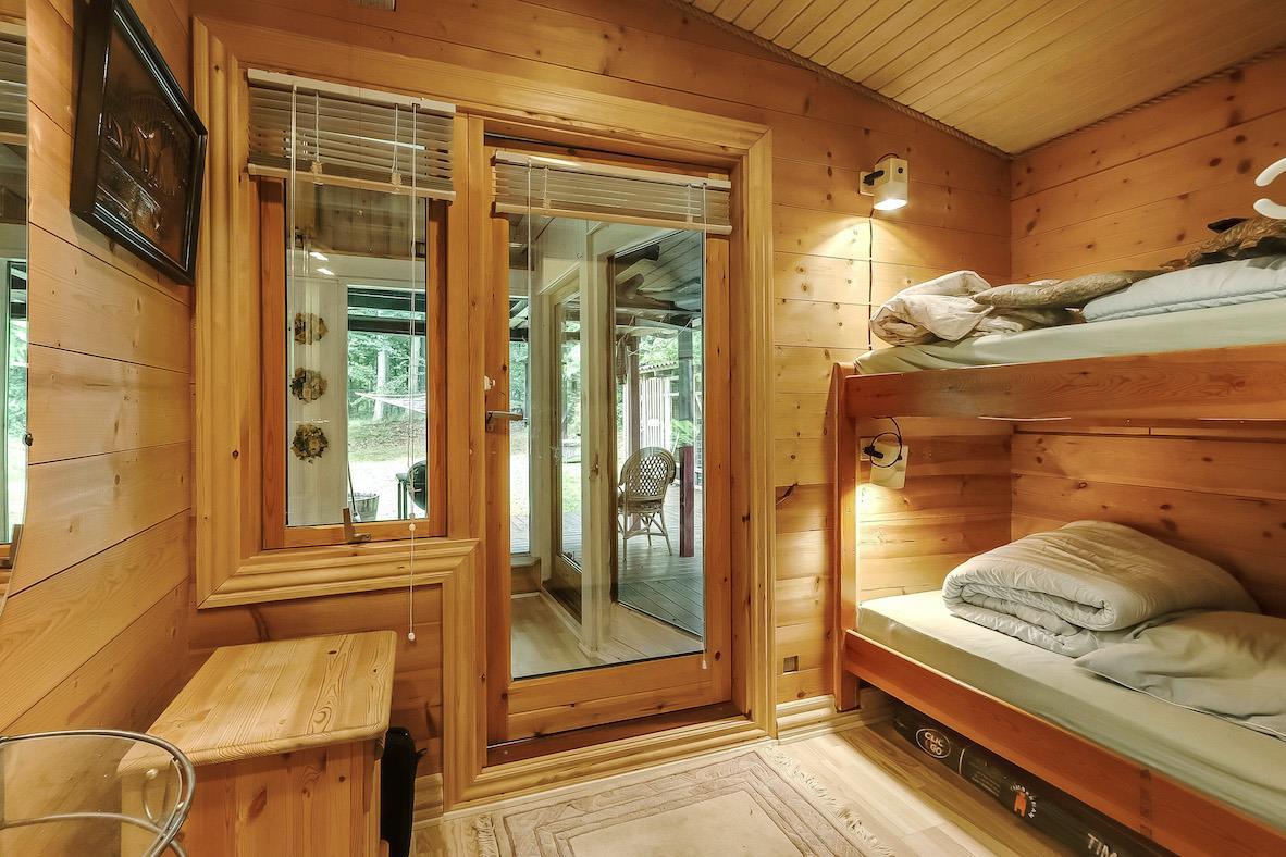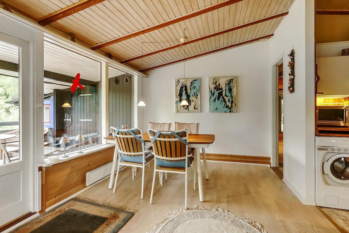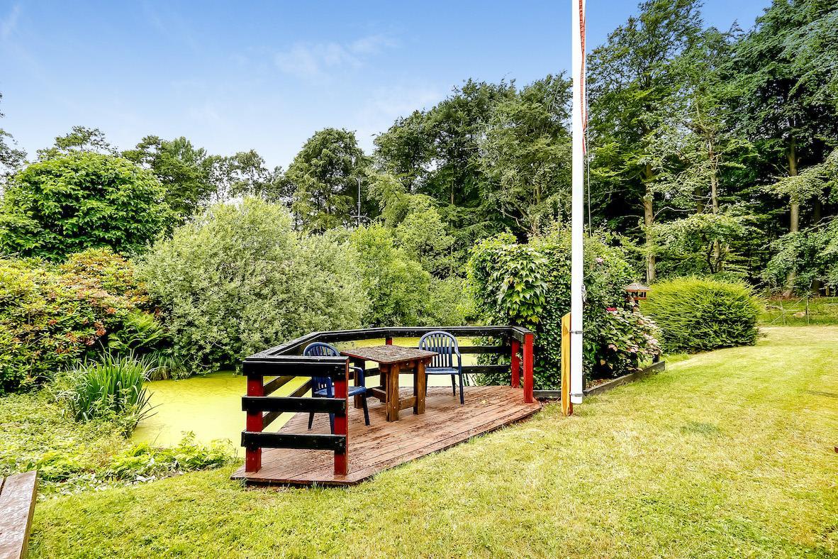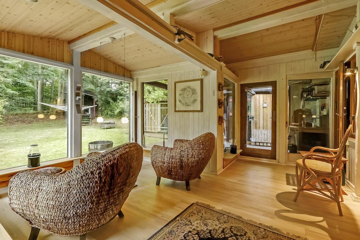 Charmantes Ferienhaus auf 90 m² auf einem 1.200 m² großen Grundstück mit einem kleinen Teich im Garten. Das Haus ist von hohen Bäumen umgeben und bietet eine echte Holzhaus-Atmosphäre. Es ist gemütlich eingerichtet mit guter Beleuchtung, großen Fenstern und einer schönen Aussicht auf den Garten.