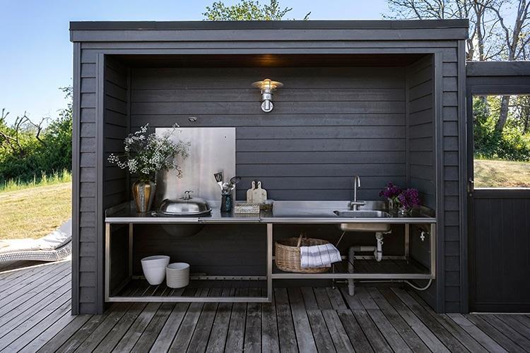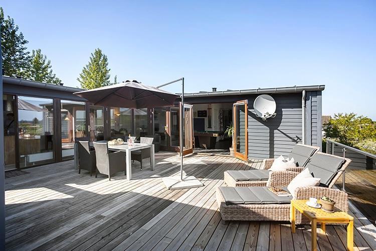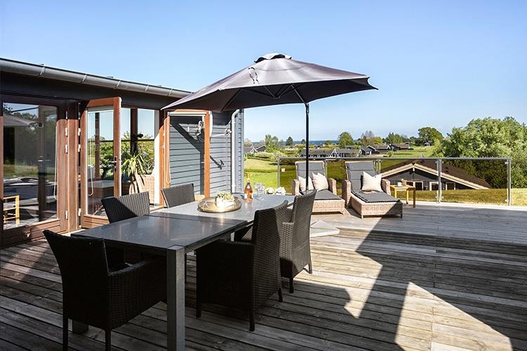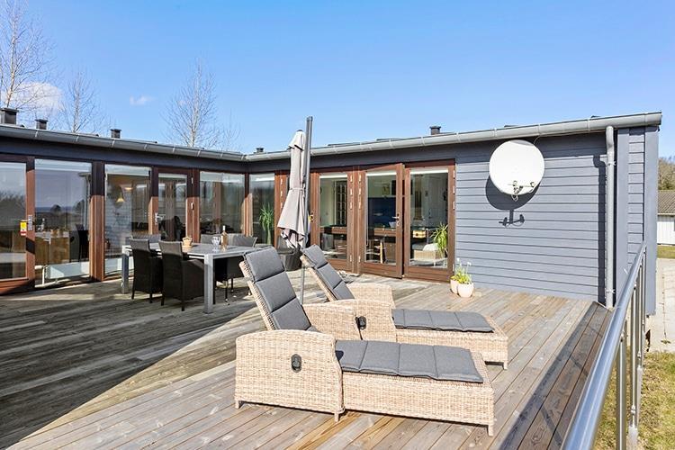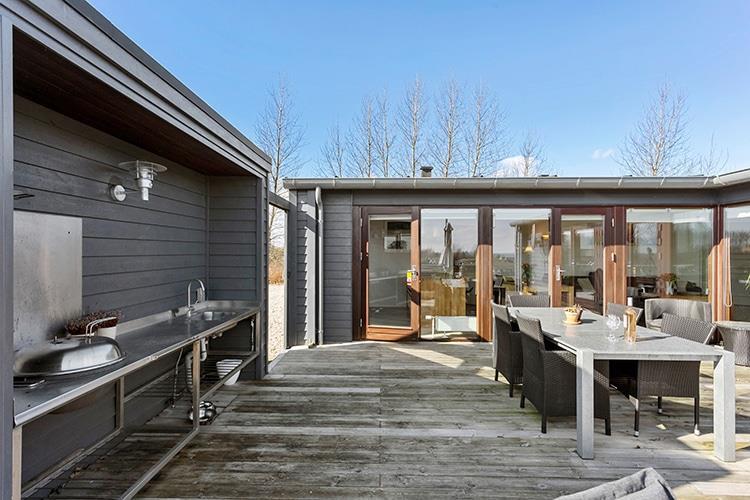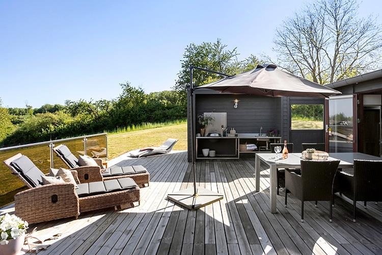 Udenfor er der en dejlig, stor, afskærmet terrasse med havemøbler og liggestole. Her er også et udekøkken, hvis I har lyst til at kaste jer ud i at tilberede maden udendørs.